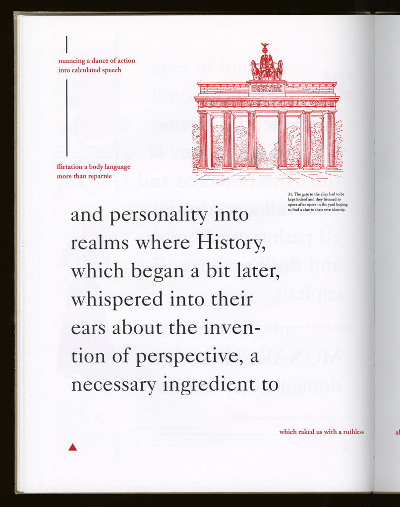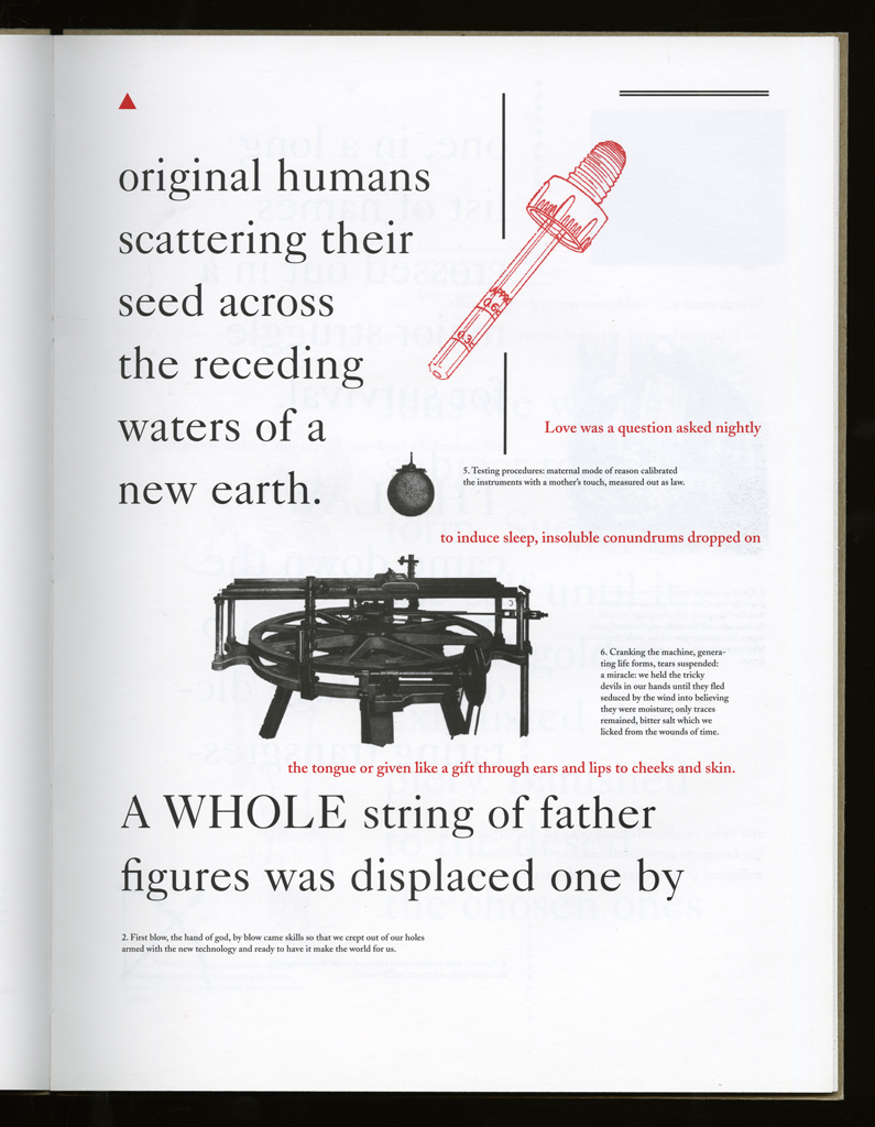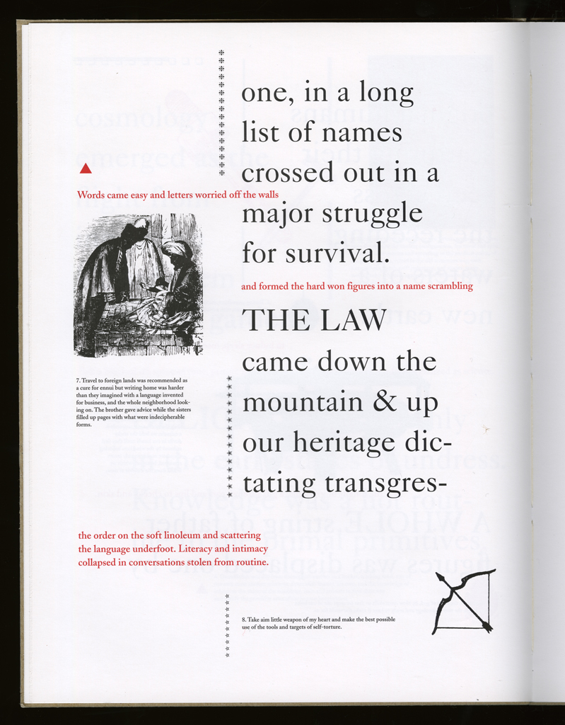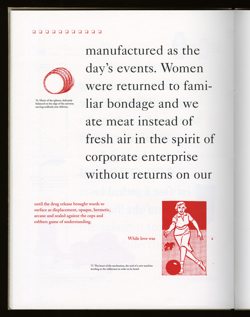 Several themes interweave in this book: a feminist rewriting of the history of the world, an opposition between official history and personal memory, a critique of feminist theoretical attitudes towards language as patriarchal, and all sorts of graphical and textual puns and play. The book is a tribute to my mother, and the drum majorette who opens the book is a figure that corresponds to her early years, youth, and activities as a baton twirling teen in Downer's Grove, Illinois. I had learned language, and literature, through an intense and intimate relation with her. The feminist dogma of language as patriarchal didn't fit the erotic and personal experience of my relation to the literary through the relation to her, even male identified as she was. She may have been the law, and the symbolic, but she was fiercely feminine and feminist as well. So the red text erupts through the black, making memory a strain of presence within the history retold.