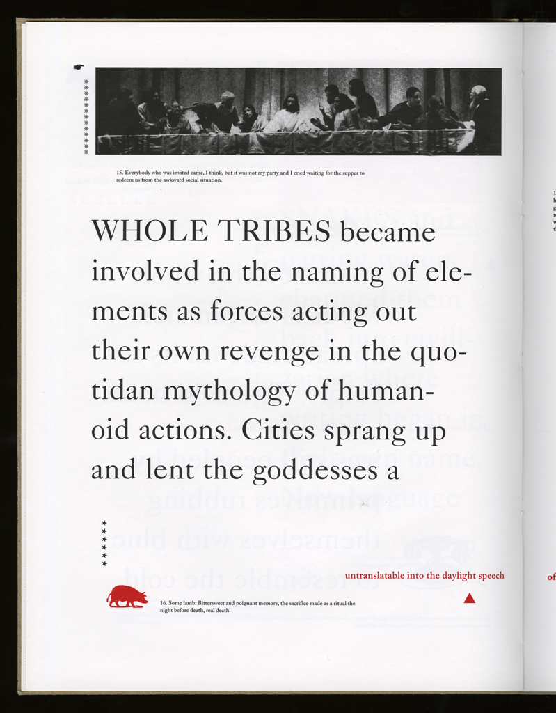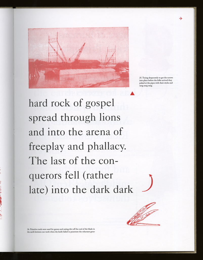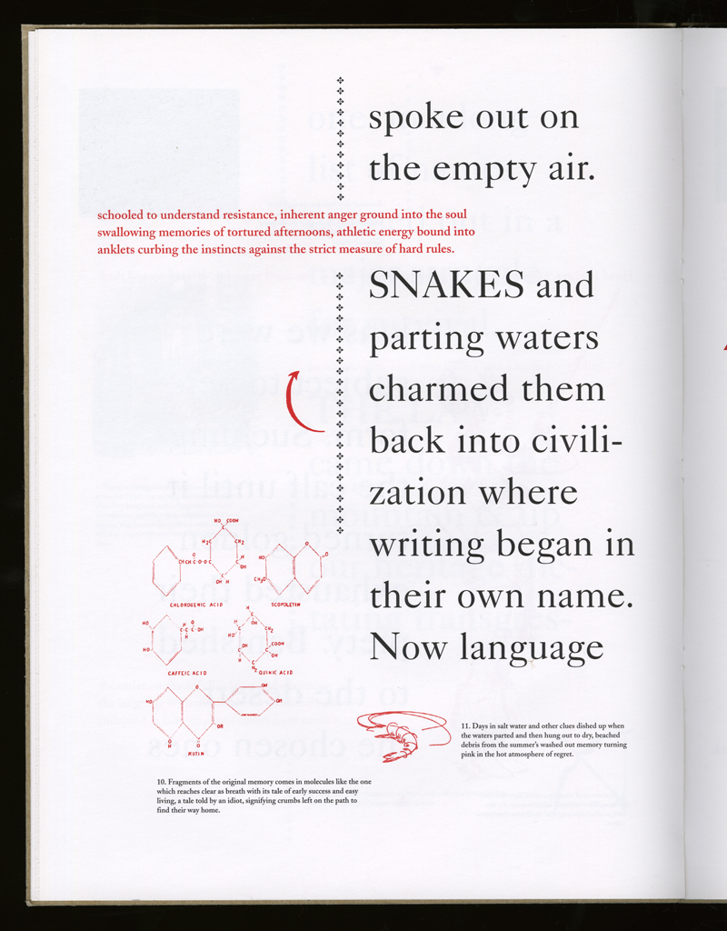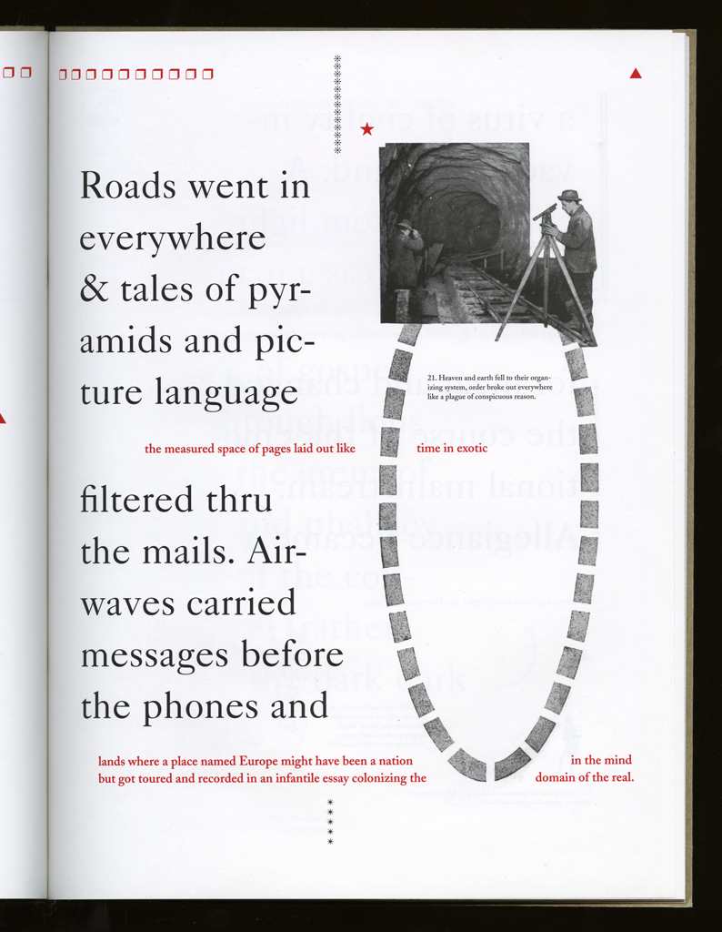 Several themes interweave in this book: a feminist rewriting of the history of the world, an opposition between official history and personal memory, a critique of feminist theoretical attitudes towards language as patriarchal, and all sorts of graphical and textual puns and play. The book is a tribute to my mother, and the drum majorette who opens the book is a figure that corresponds to her early years, youth, and activities as a baton twirling teen in Downer's Grove, Illinois. I had learned language, and literature, through an intense and intimate relation with her. The feminist dogma of language as patriarchal didn't fit the erotic and personal experience of my relation to the literary through the relation to her, even male identified as she was. She may have been the law, and the symbolic, but she was fiercely feminine and feminist as well. So the red text erupts through the black, making memory a strain of presence within the history retold.
