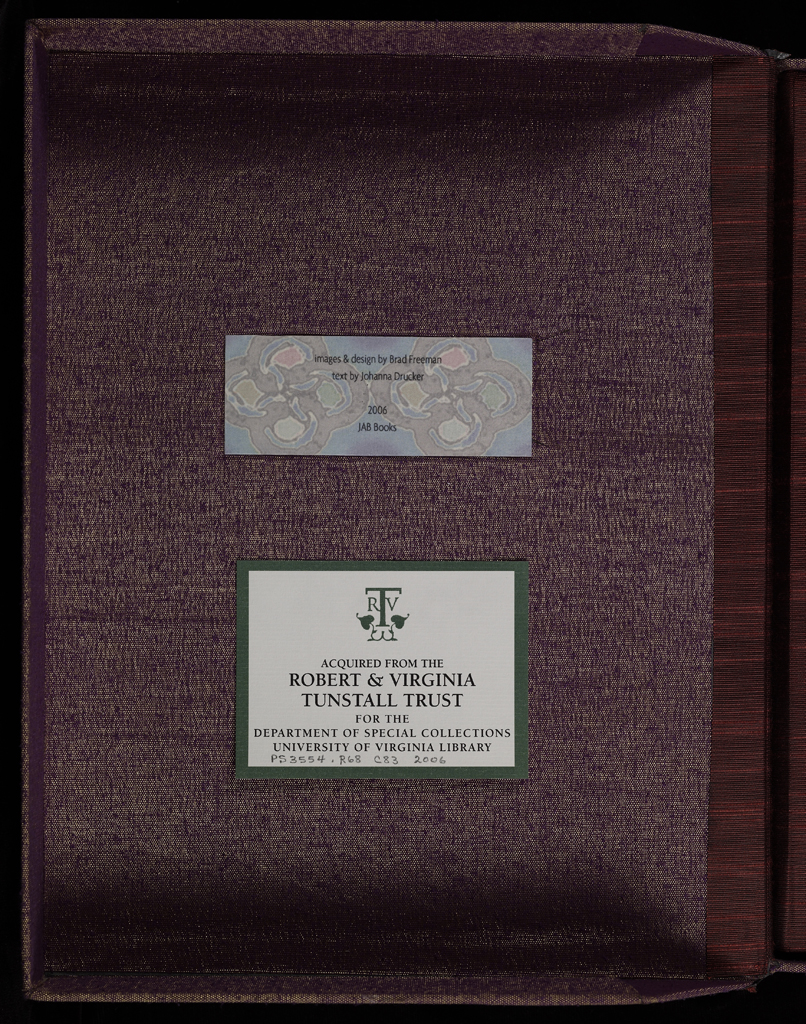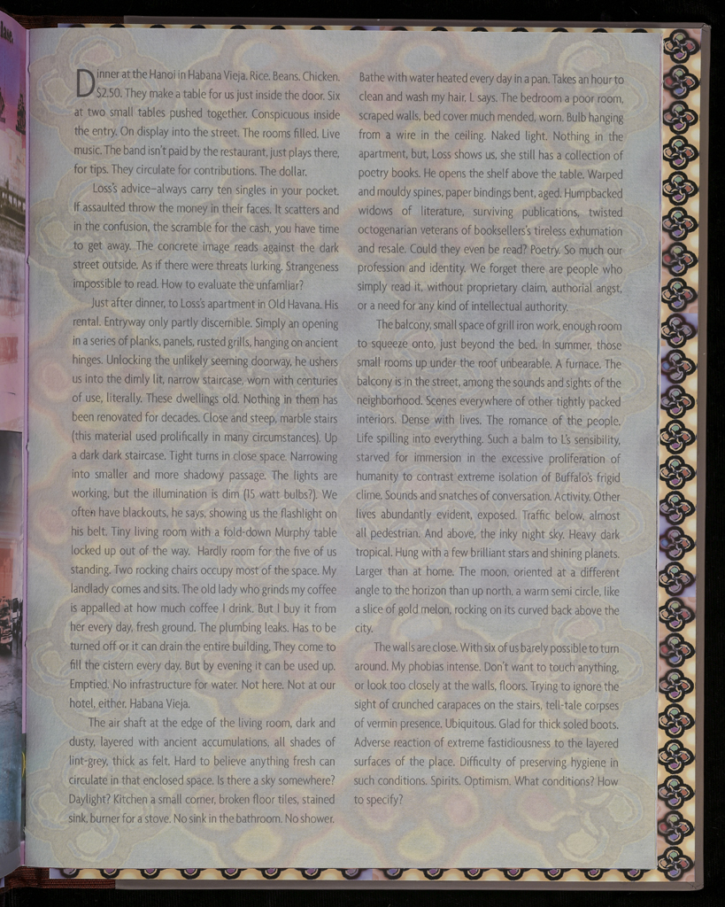 This book is based on a trip to Havana in 2003. Text by Johanna Drucker. Photographs, digital collages and design by Brad Freeman. Hand bound by BF after the jaconette one signature design of Keith Smith. The type elements are from a facsimile type sample book generously presented to us by Jorge Luis Areos and originally printed by the Imprenta Marina, Habana 1836. Special thanks to: the people of Cuba including Luisa, Jorge, Reina, and Jorge, Pedro and all the other poets and artists, Ernesto Livon-Grosman, Charles Bernstein, Susan Bee, Loss Glazier. Trica Buckley and Georgia Gerber, Rochester NY. Mary Jo Pauly at Minnesota Center for the Book Arts. Joan Lyons at Visual Studies Workshop Press, Rochester, NY. Kathy Farrell at Monroe Community College, Rochester. Helen Frederick at Pyramid Atlantic, Washington, DC. Inkjet printed on on Epson Stylus Photo 2200. The papers are Hahnemüle Photo Rag Duo and Warahan-shi. Copyright 2005.