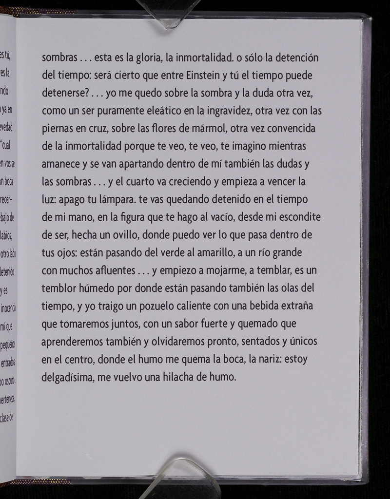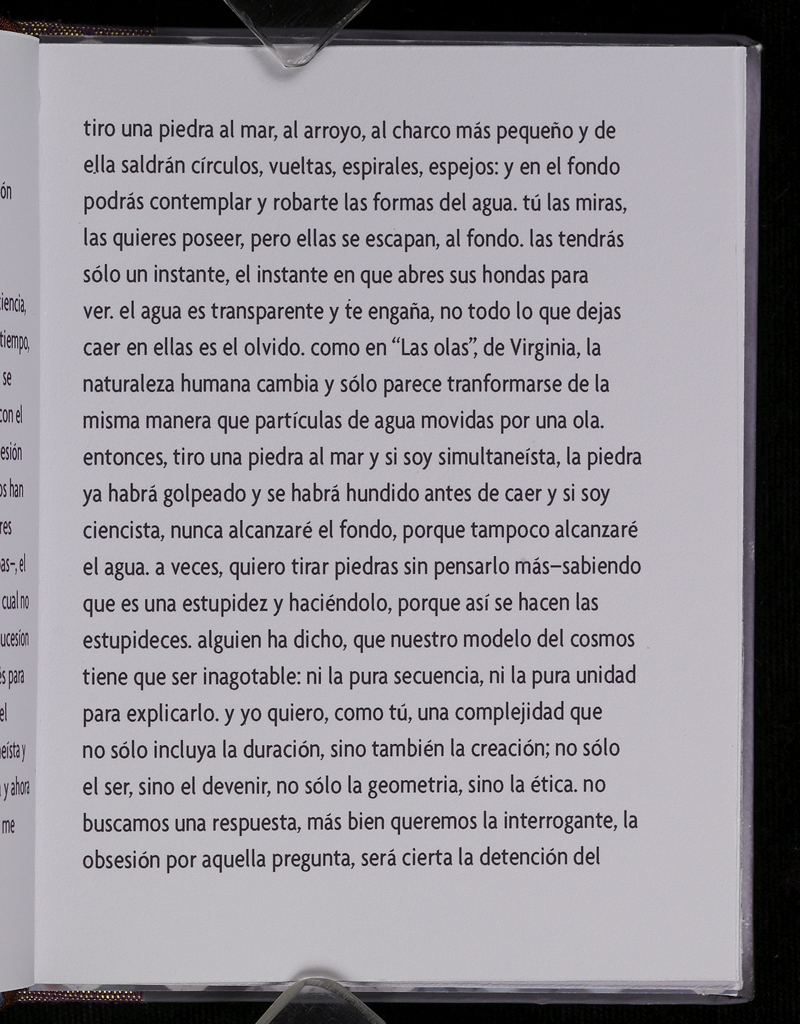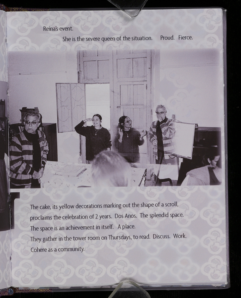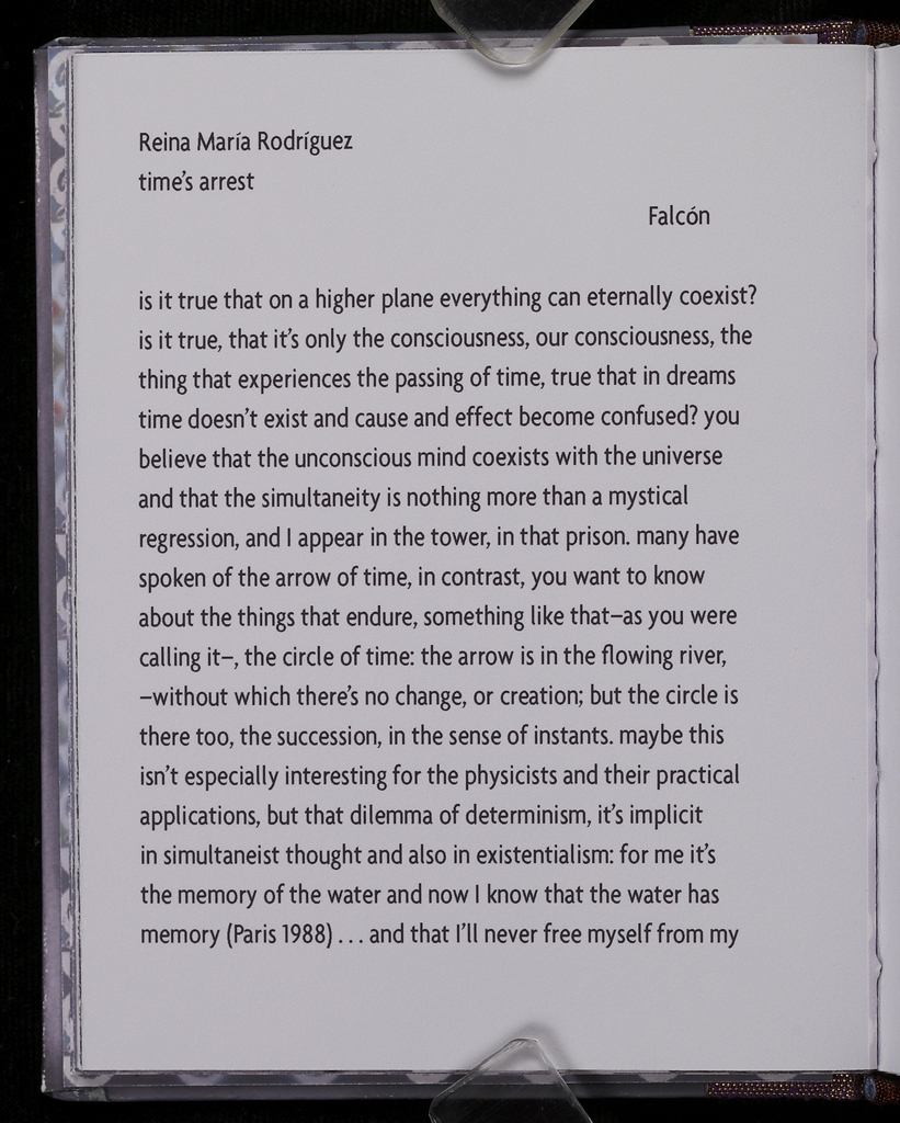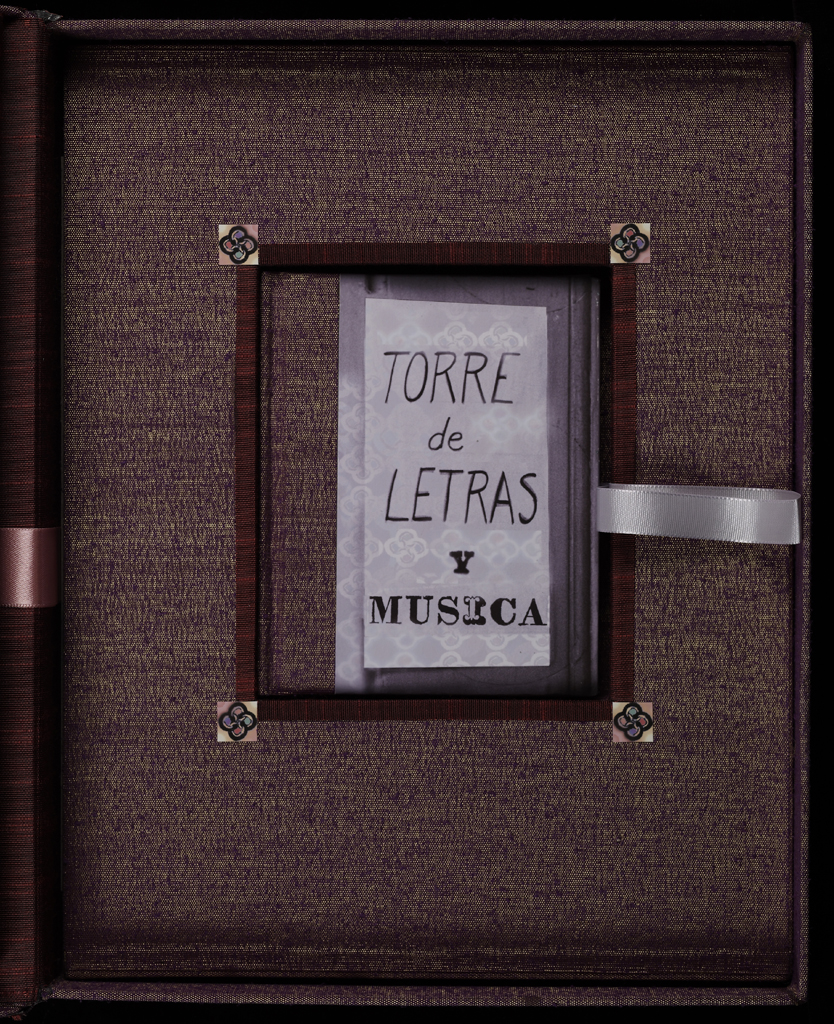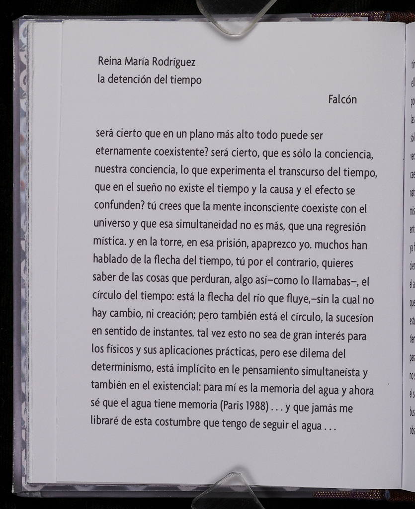 general description: Cuba consists of a silk-covered box within which are a book that is the main text with images and behind which is a smaller book Torre de Letras that is about our day at the celebration of the poets and also contains Reina Maria Rodriguez's text, "time's arrest" in original Spanish and translation.
