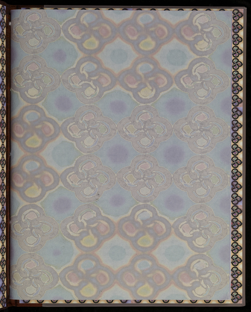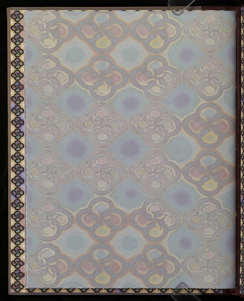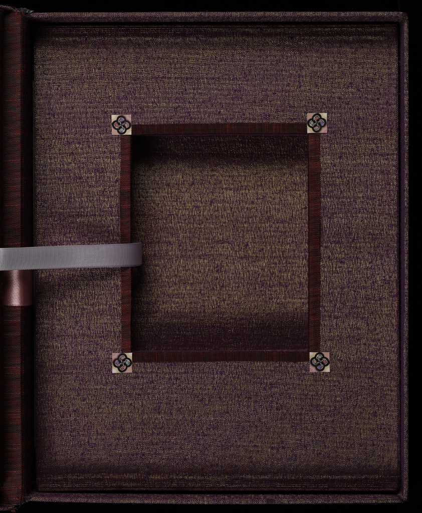 cover: Cover of the box is purple-gold silk book cloth with dark red accents, trim, and hinges. The large book has color printed covers, dark red spine strip in silk, and gold metal corner pieces.