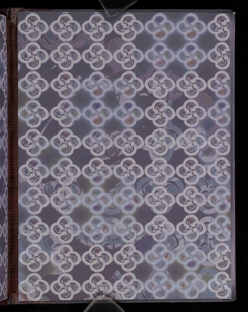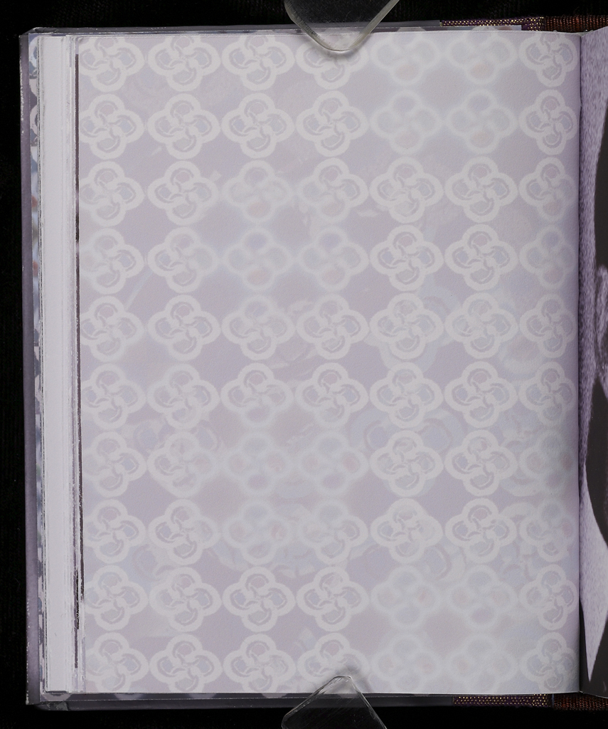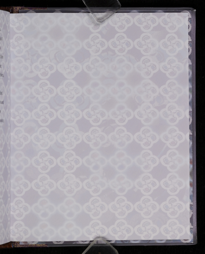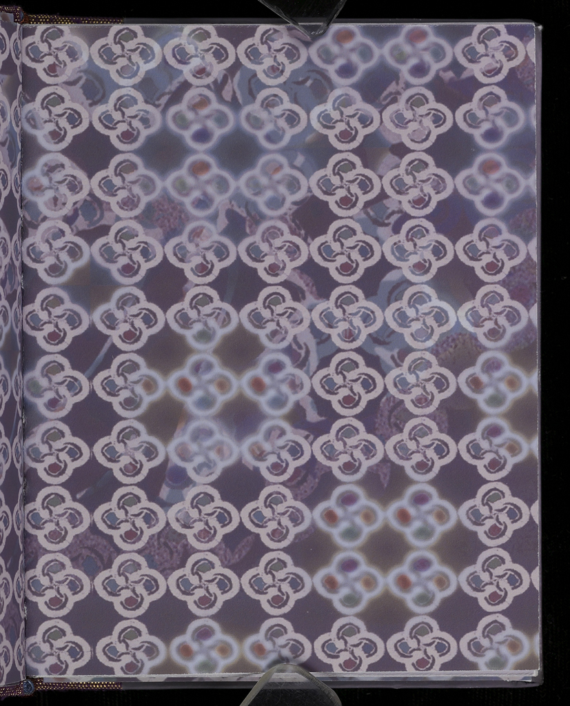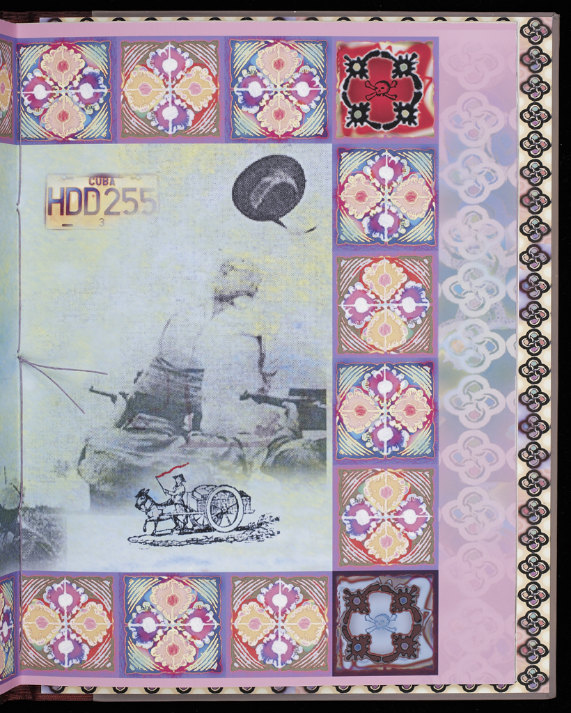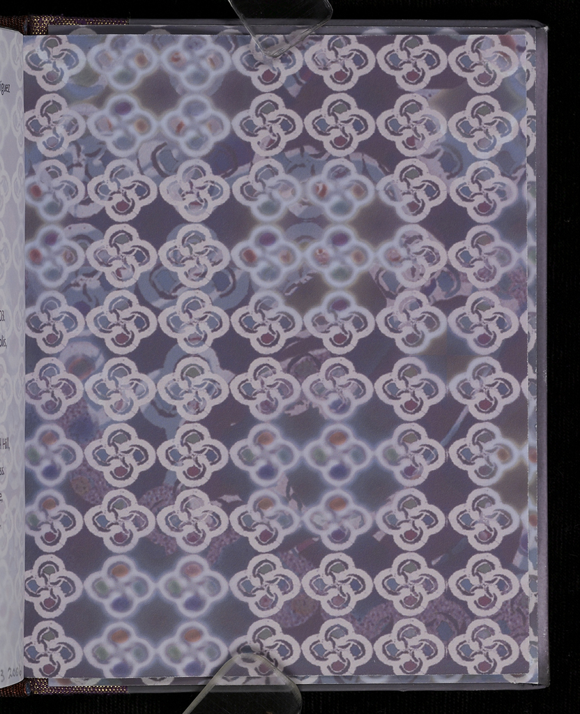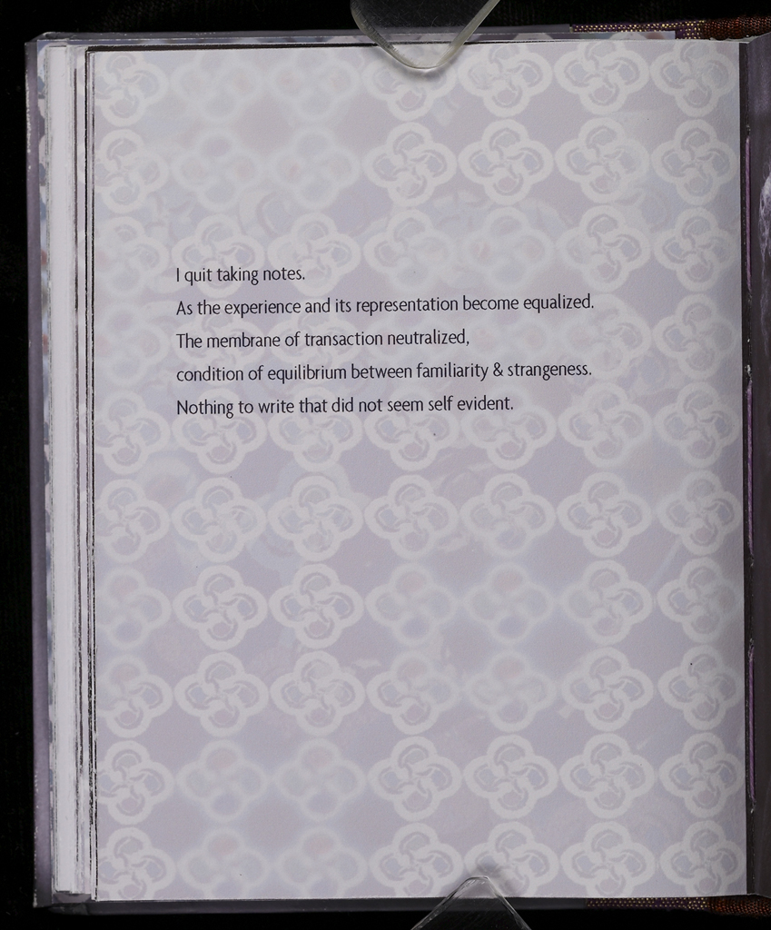 The look of the book lends an aura of religious, sacred intensity to it because of the digital pattern that echoes stained glass, and the rich colors used throughout. The photographs are rich, layered, with elaborate passages that connect historical and contemporary events and persons. Their substantial character balances the rapid pace of the text, with its short syntax and abrupt quality. As a travel narrative and work about art and beliefs, it is well-served by the seductive richness of the presentation, the fetish-like book box, and details like ribbon and gold corners. The themes are developed and carry through the book, and it is a deliberately immersive book, one that struggles to bring the impressions of a very intense and unfamiliar environment into representation.