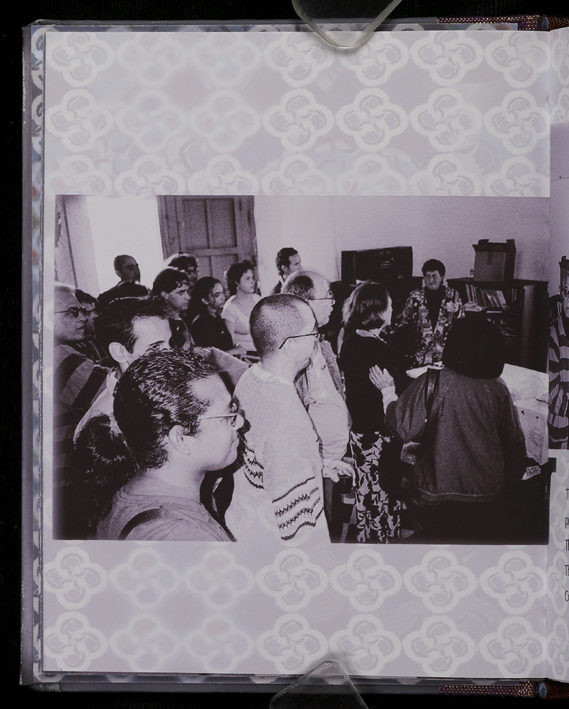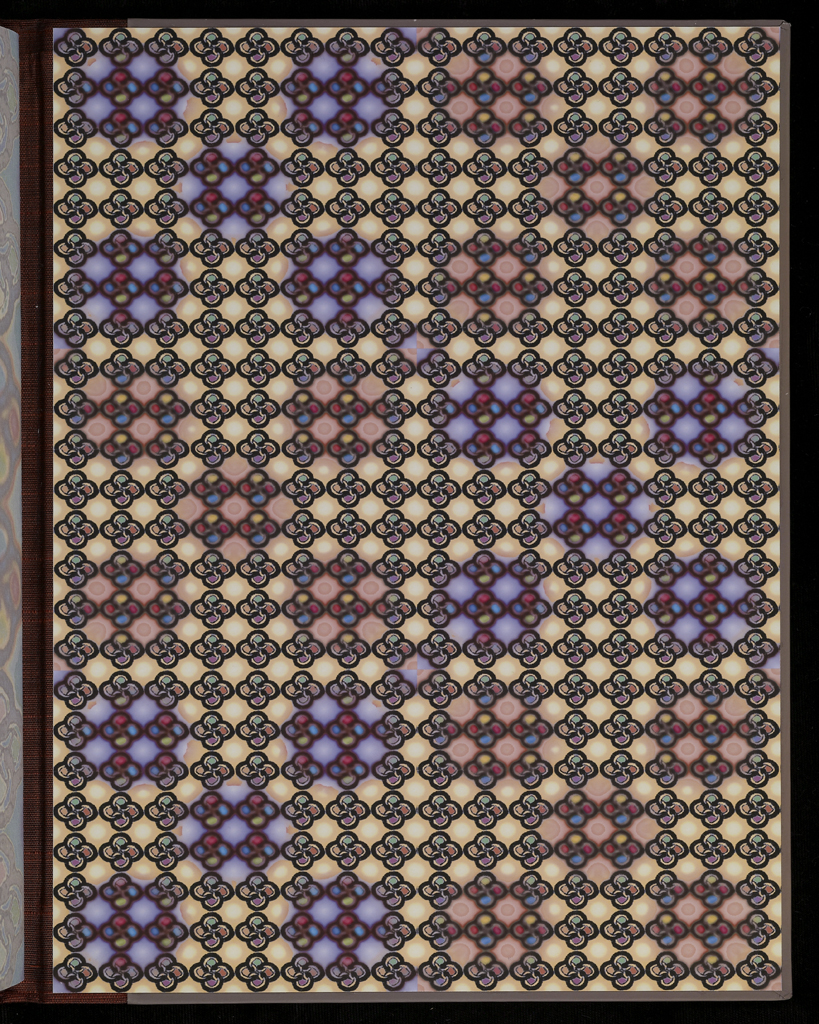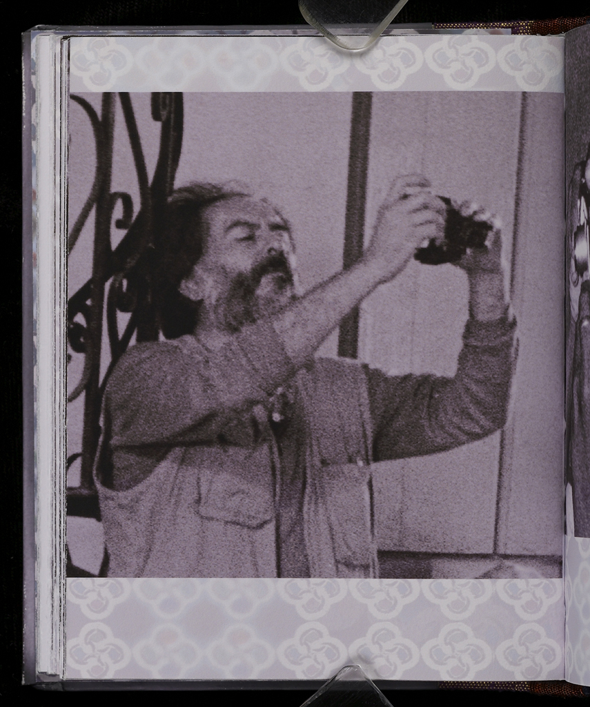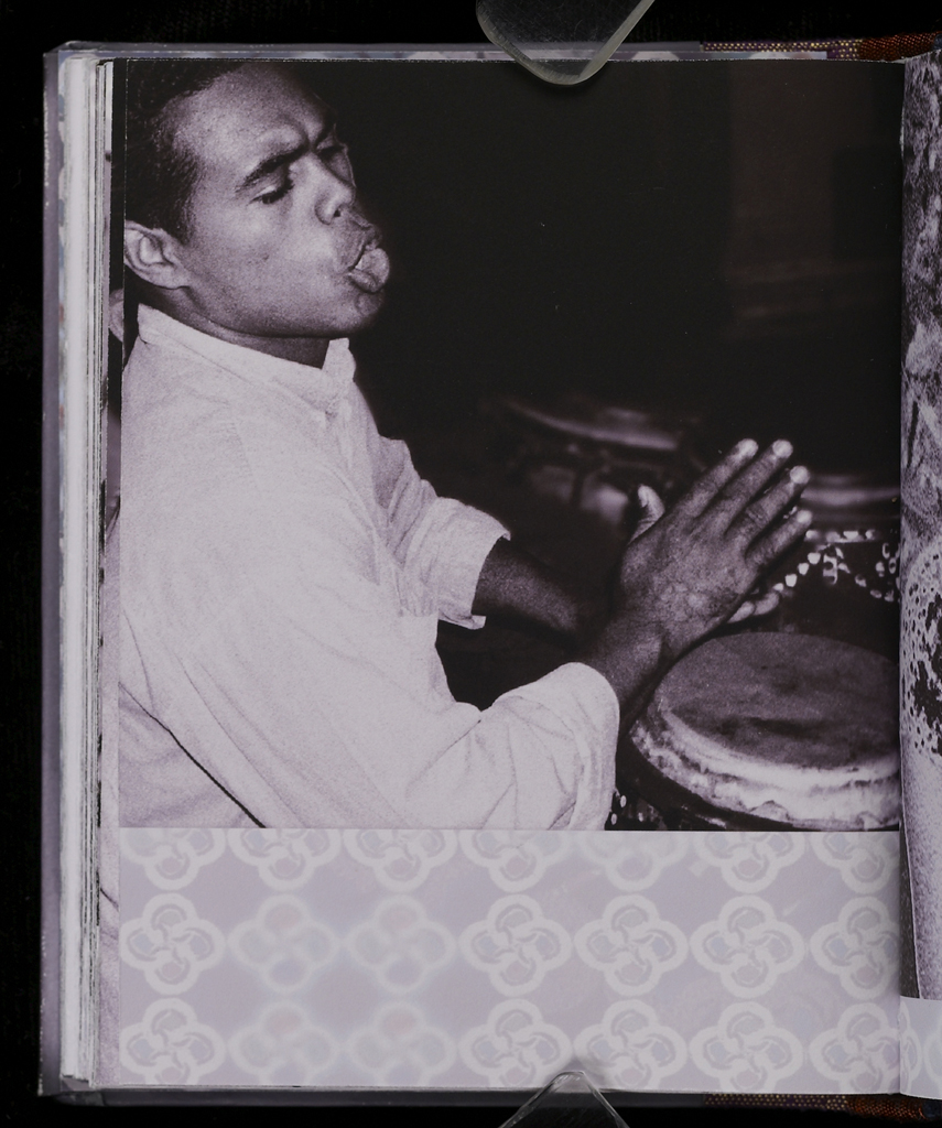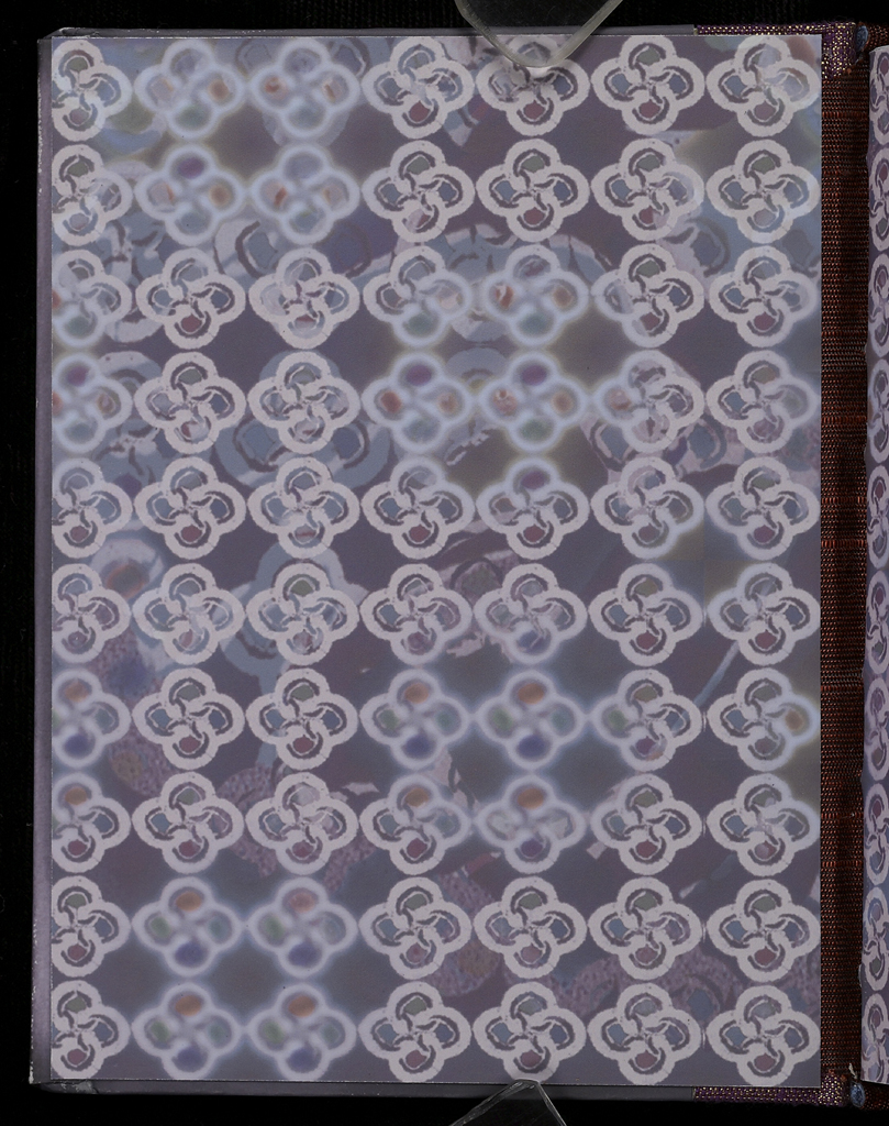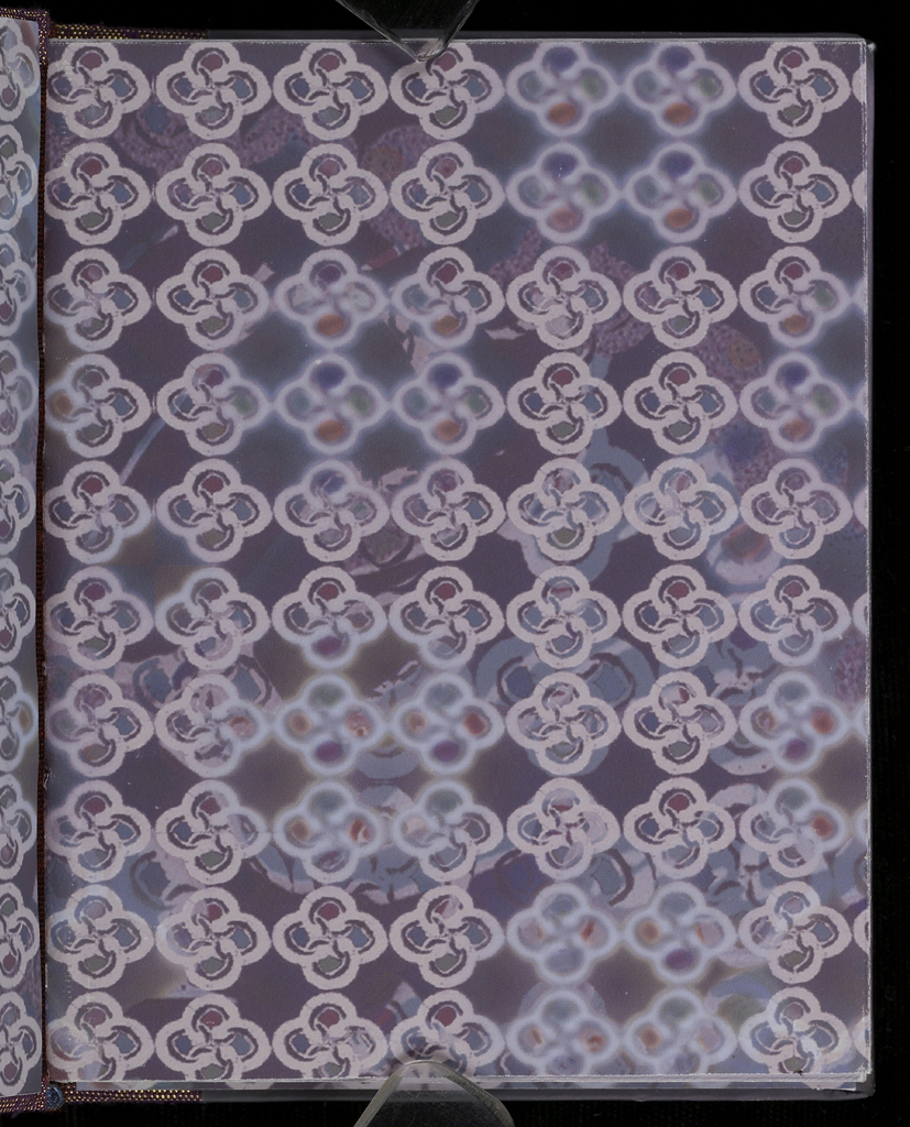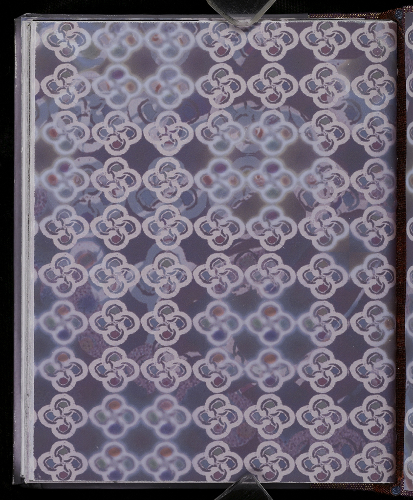 The look of the book lends an aura of religious, sacred intensity to it because of the digital pattern that echoes stained glass, and the rich colors used throughout. The photographs are rich, layered, with elaborate passages that connect historical and contemporary events and persons. Their substantial character balances the rapid pace of the text, with its short syntax and abrupt quality. As a travel narrative and work about art and beliefs, it is well-served by the seductive richness of the presentation, the fetish-like book box, and details like ribbon and gold corners. The themes are developed and carry through the book, and it is a deliberately immersive book, one that struggles to bring the impressions of a very intense and unfamiliar environment into representation.