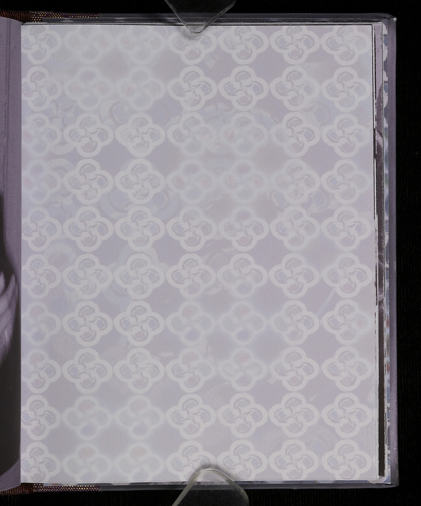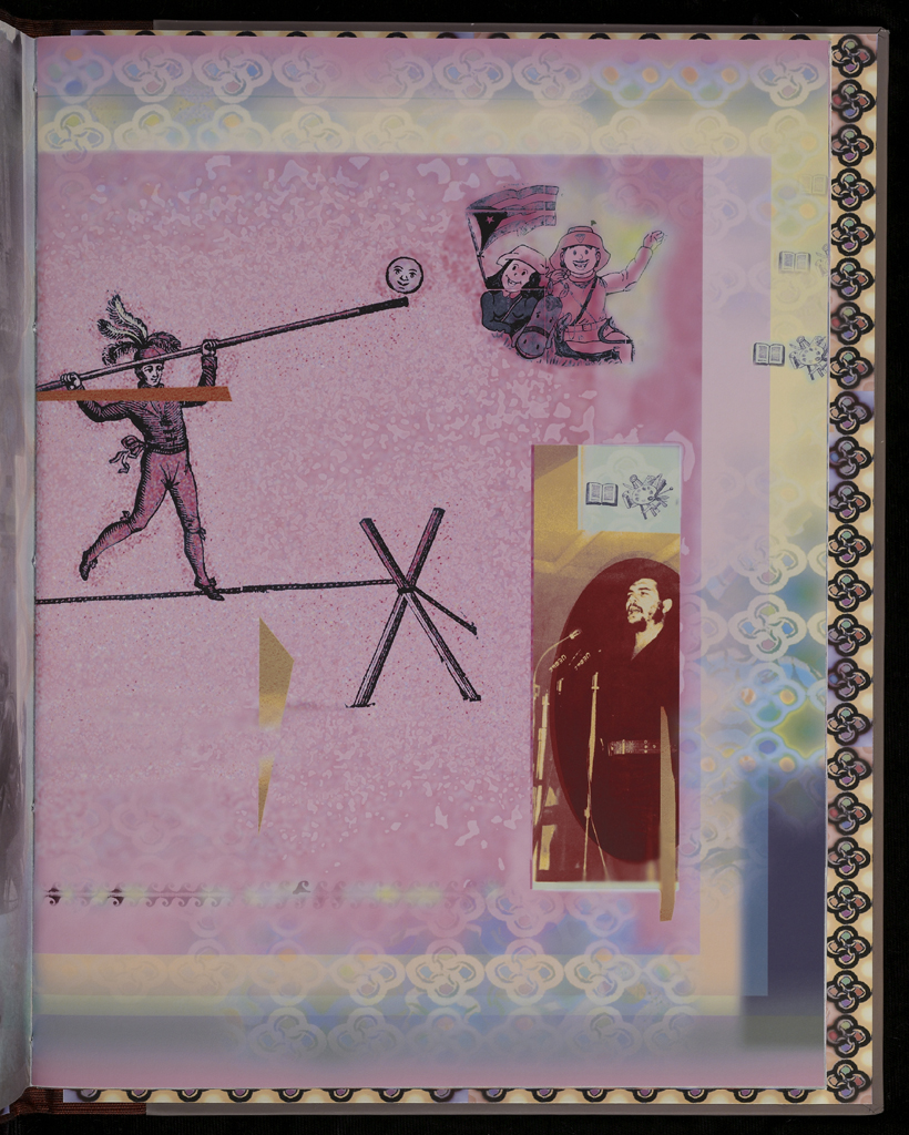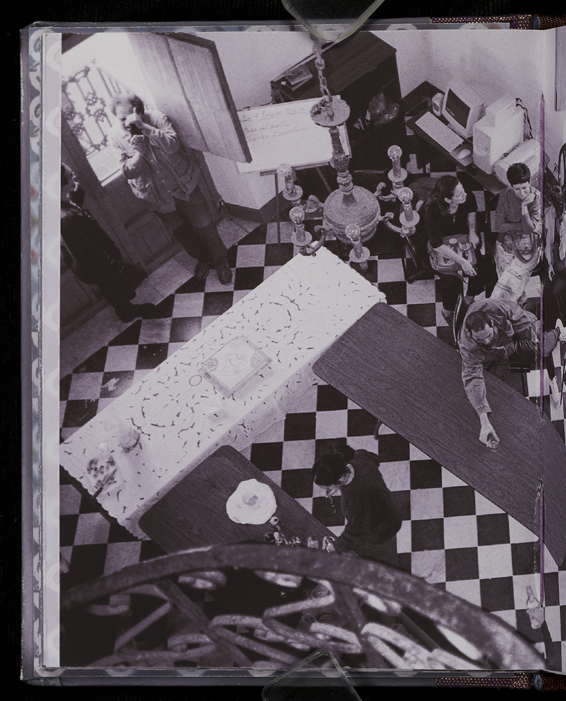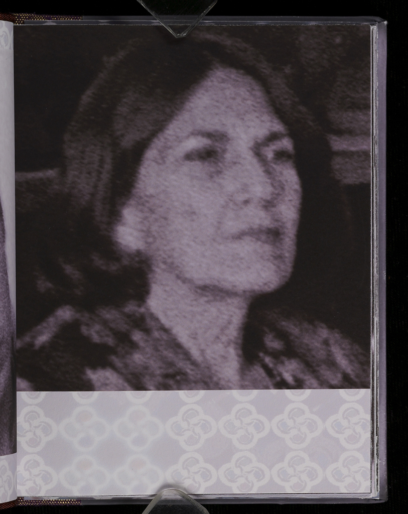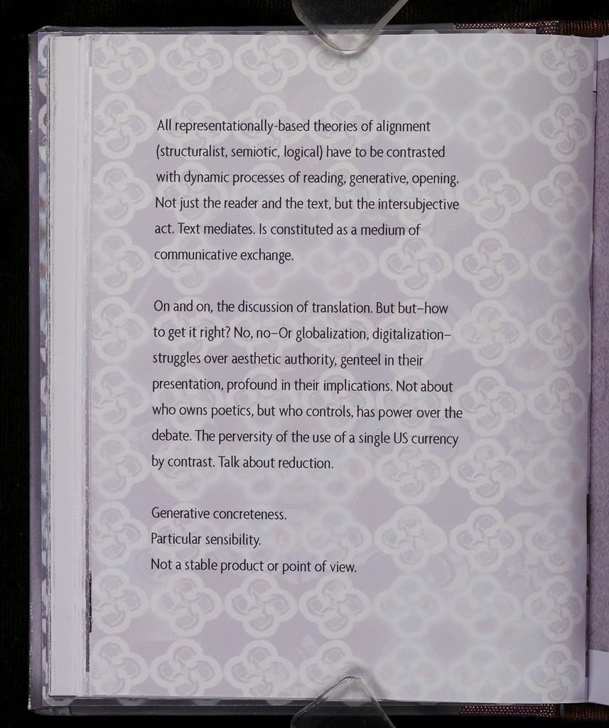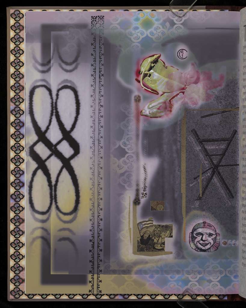 The look of the book lends an aura of religious, sacred intensity to it because of the digital pattern that echoes stained glass, and the rich colors used throughout. The photographs are rich, layered, with elaborate passages that connect historical and contemporary events and persons. Their substantial character balances the rapid pace of the text, with its short syntax and abrupt quality. As a travel narrative and work about art and beliefs, it is well-served by the seductive richness of the presentation, the fetish-like book box, and details like ribbon and gold corners. The themes are developed and carry through the book, and it is a deliberately immersive book, one that struggles to bring the impressions of a very intense and unfamiliar environment into representation.