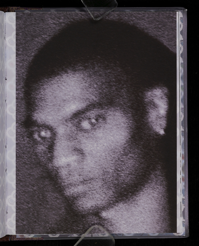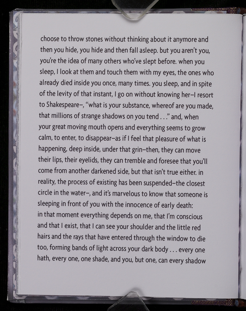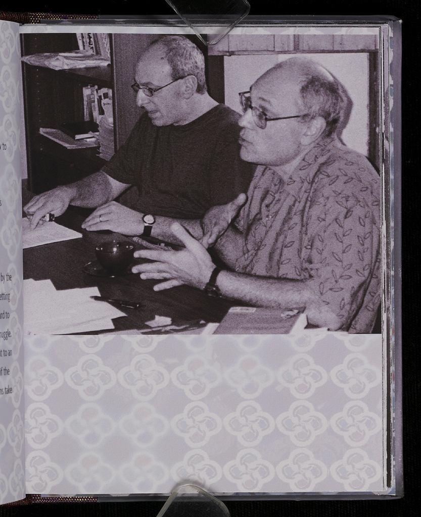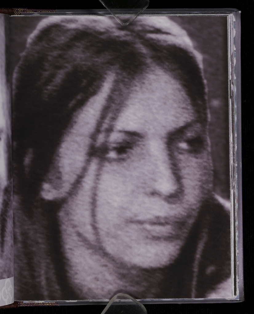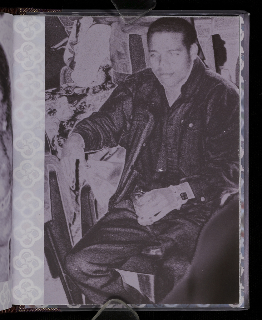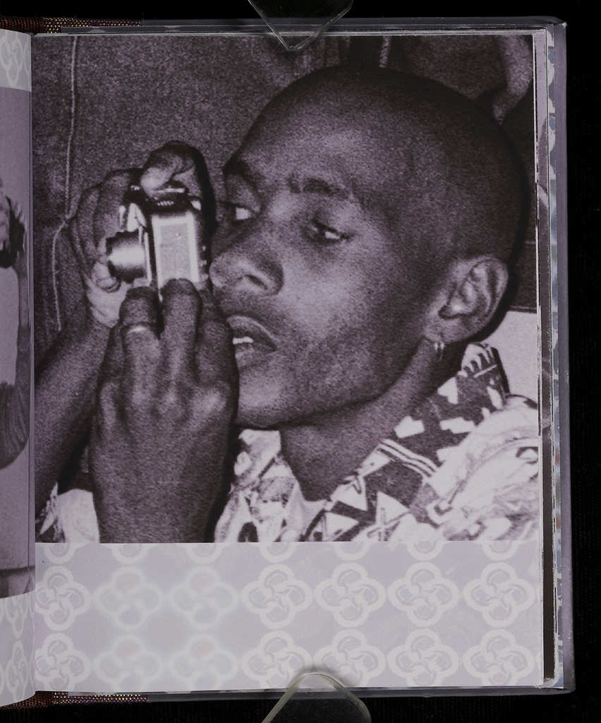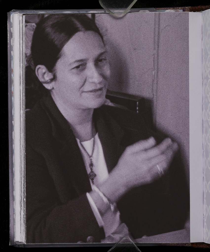 The look of the book lends an aura of religious, sacred intensity to it because of the digital pattern that echoes stained glass, and the rich colors used throughout. The photographs are rich, layered, with elaborate passages that connect historical and contemporary events and persons. Their substantial character balances the rapid pace of the text, with its short syntax and abrupt quality. As a travel narrative and work about art and beliefs, it is well-served by the seductive richness of the presentation, the fetish-like book box, and details like ribbon and gold corners. The themes are developed and carry through the book, and it is a deliberately immersive book, one that struggles to bring the impressions of a very intense and unfamiliar environment into representation.