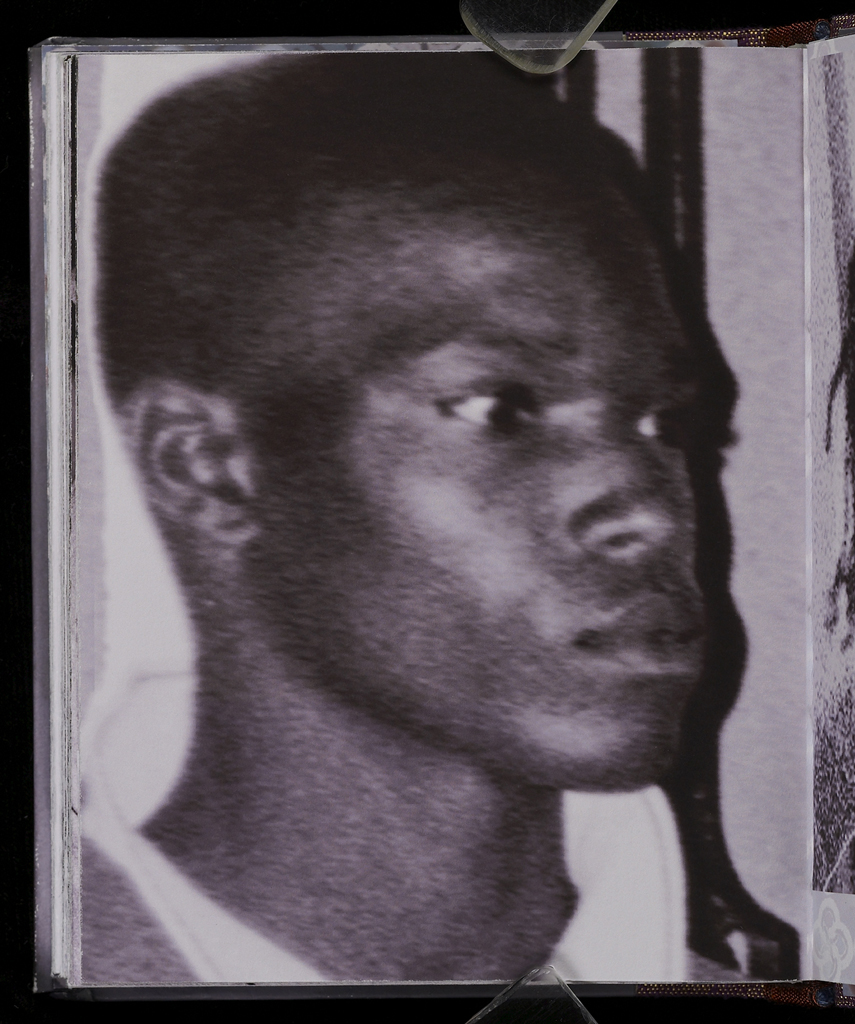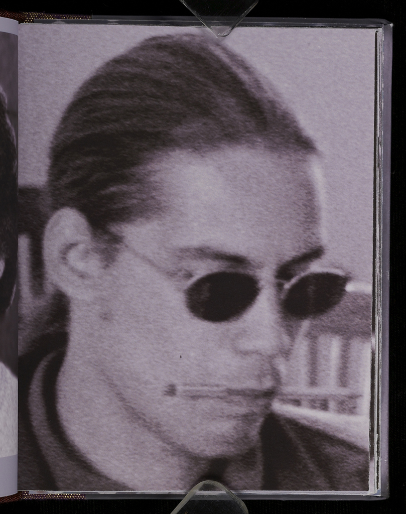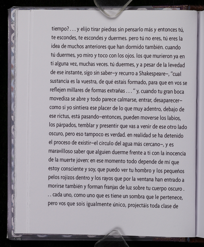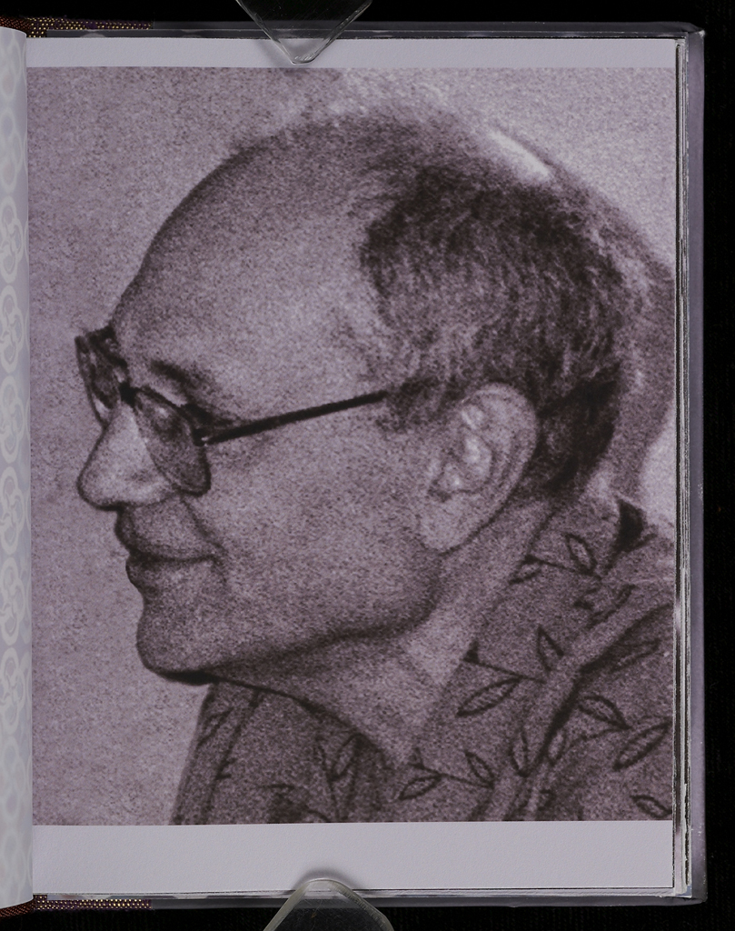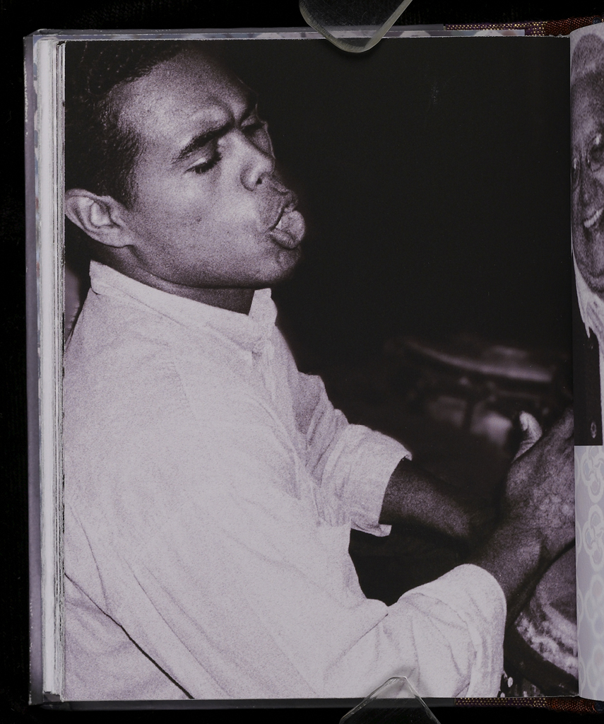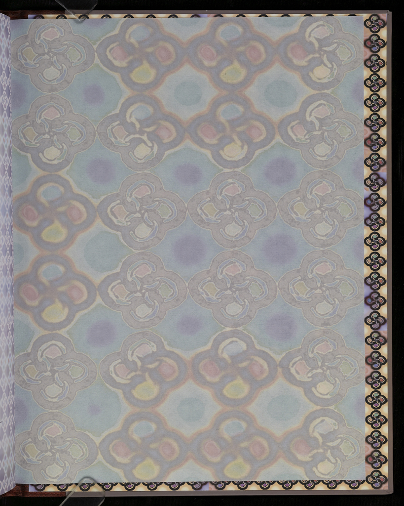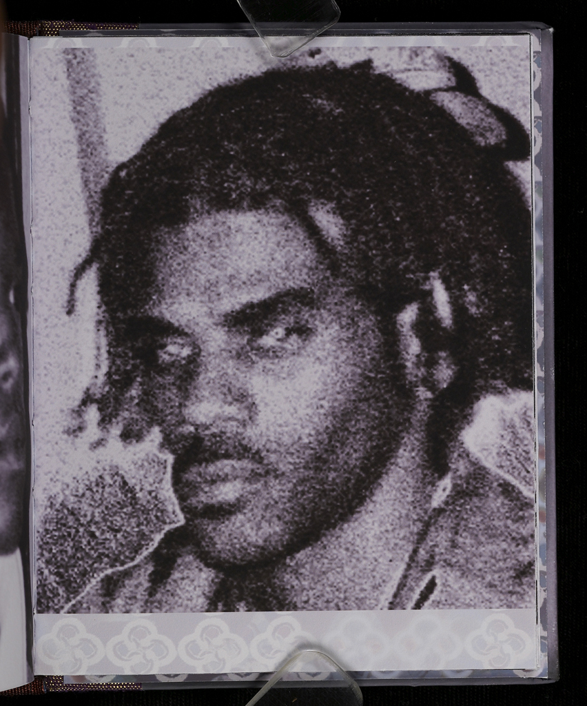 The look of the book lends an aura of religious, sacred intensity to it because of the digital pattern that echoes stained glass, and the rich colors used throughout. The photographs are rich, layered, with elaborate passages that connect historical and contemporary events and persons. Their substantial character balances the rapid pace of the text, with its short syntax and abrupt quality. As a travel narrative and work about art and beliefs, it is well-served by the seductive richness of the presentation, the fetish-like book box, and details like ribbon and gold corners. The themes are developed and carry through the book, and it is a deliberately immersive book, one that struggles to bring the impressions of a very intense and unfamiliar environment into representation.