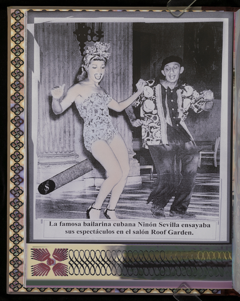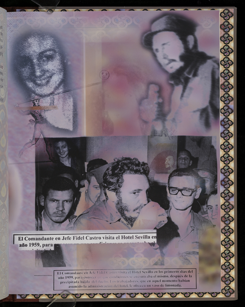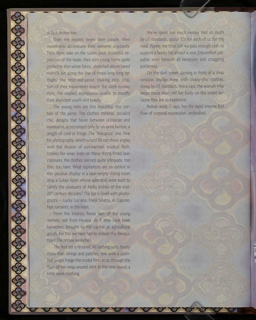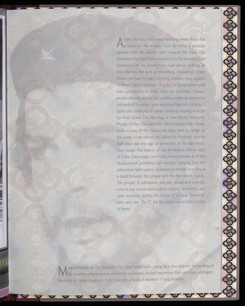imagery: The imagery combines photographs of things, persons, sites, events observed directly, as well as scanned and rephotographed materials. These include images of the history museum, cigar labels, graphics, the type sample book mentioned in the colophon, and other visuals. The overall look combines the patterns of stained glass, jewel colors, and Caribbean tones.