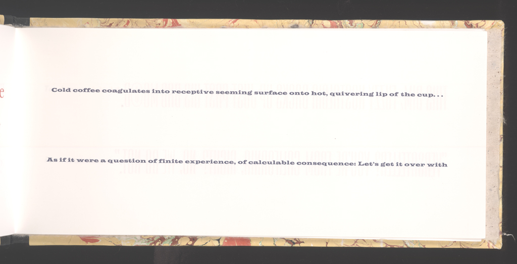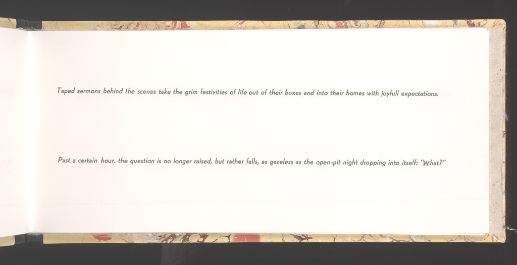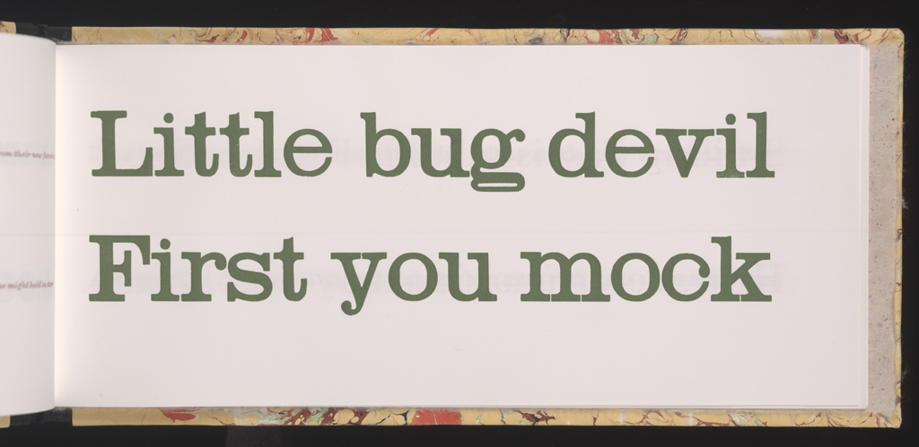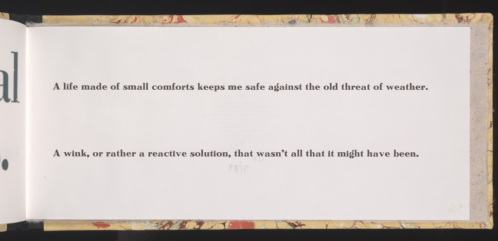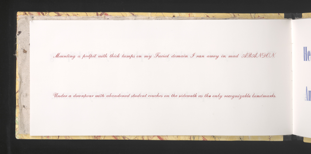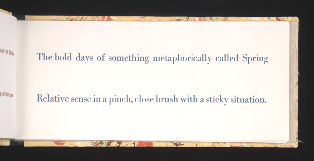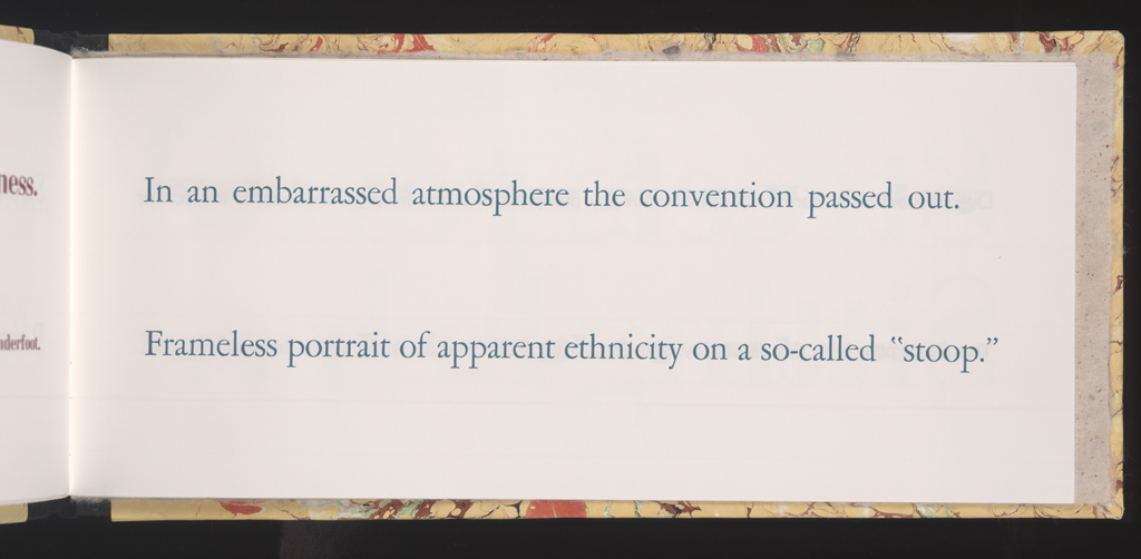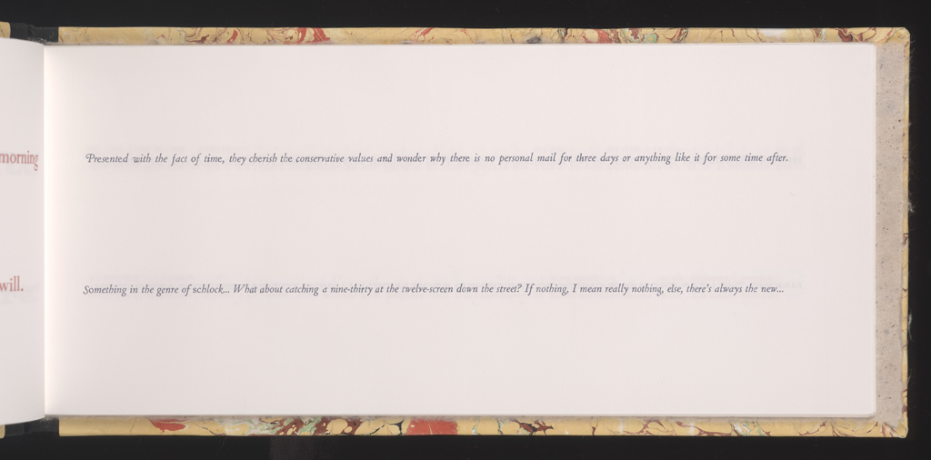 We marbled the paper, wrote the text, printed most of it in one day in a continually changing ink color (without cleaning the press, just adding and subtracting ink). Then we collated it so that we got the maximum contrast page to page in terms of color and font. Emily had come to Cambridge to learn letterpress (!) hard as it is to believe she ever didn't know how to print. She worked at the Bow and Arrow with me and Gino in that summer, 1989, for weeks. She set her own bit of 6 point, unleaded type (some things one never forgets), and we conceived this project as a playful engagement with the many treasures of the Bow and Arrow. Time ran out, as it will, and we ended up printing it in a rush, binding and everything else all at once just as she was leaving. But we were pleased with the overall effect of the whole project once it was done, with its long off-cut format (maybe leftovers from The Word Made Flesh, actually) and its hard, heavy boards. We had trouble figuring out, later, who wrote which lines.