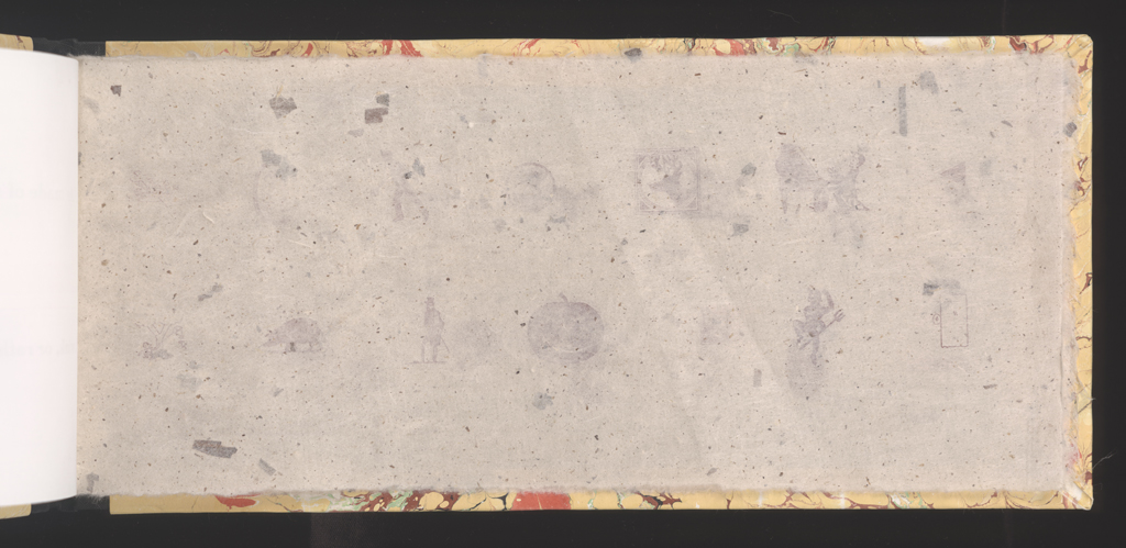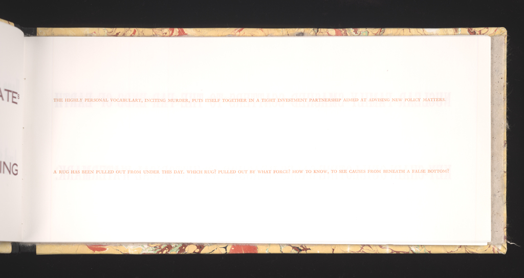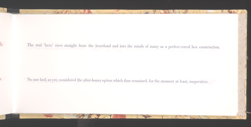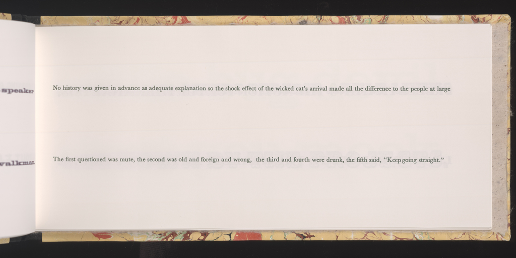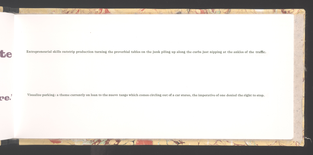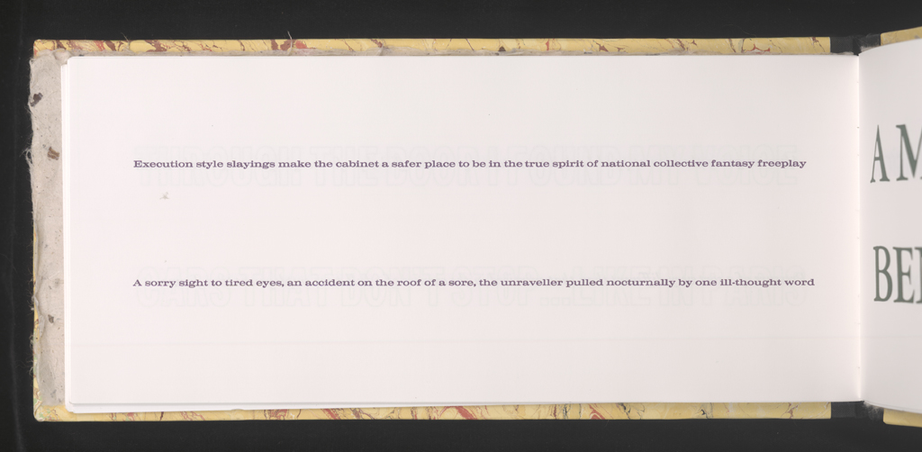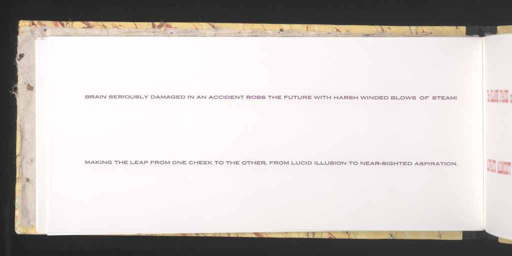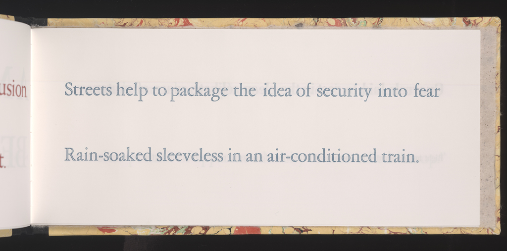 We marbled the paper, wrote the text, printed most of it in one day in a continually changing ink color (without cleaning the press, just adding and subtracting ink). Then we collated it so that we got the maximum contrast page to page in terms of color and font. Emily had come to Cambridge to learn letterpress (!) hard as it is to believe she ever didn't know how to print. She worked at the Bow and Arrow with me and Gino in that summer, 1989, for weeks. She set her own bit of 6 point, unleaded type (some things one never forgets), and we conceived this project as a playful engagement with the many treasures of the Bow and Arrow. Time ran out, as it will, and we ended up printing it in a rush, binding and everything else all at once just as she was leaving. But we were pleased with the overall effect of the whole project once it was done, with its long off-cut format (maybe leftovers from The Word Made Flesh, actually) and its hard, heavy boards. We had trouble figuring out, later, who wrote which lines.