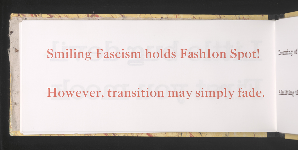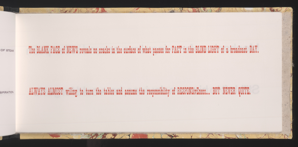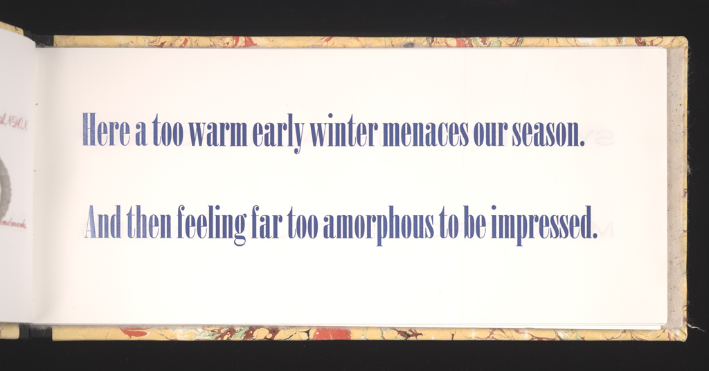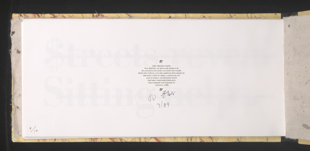This specimen book was printed on Mohawk Super Fine by Johanna Drucker and Emily McVarish with the typical and ornamental resources of The Bow & Arrow Press, Cambridge, MA and in strict accordance with the daily weather forecasts that marked the passage of mid-July, 1989.