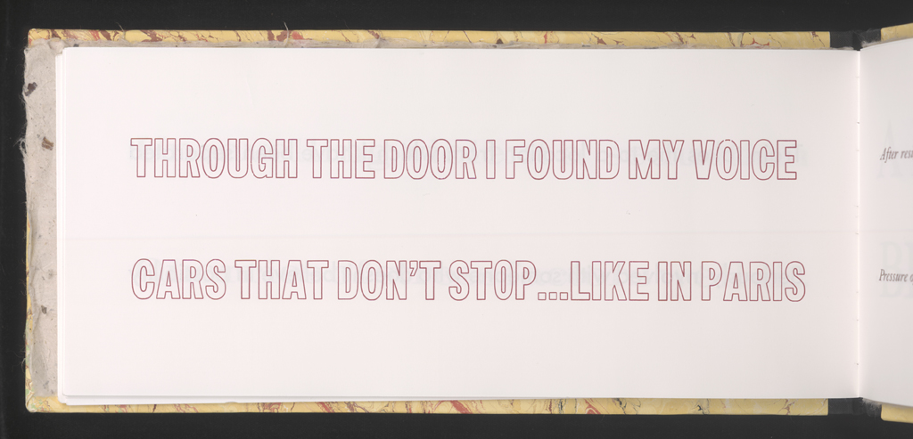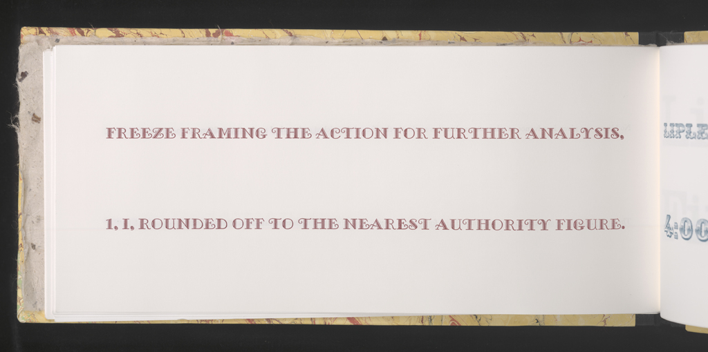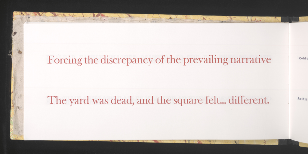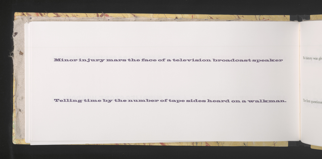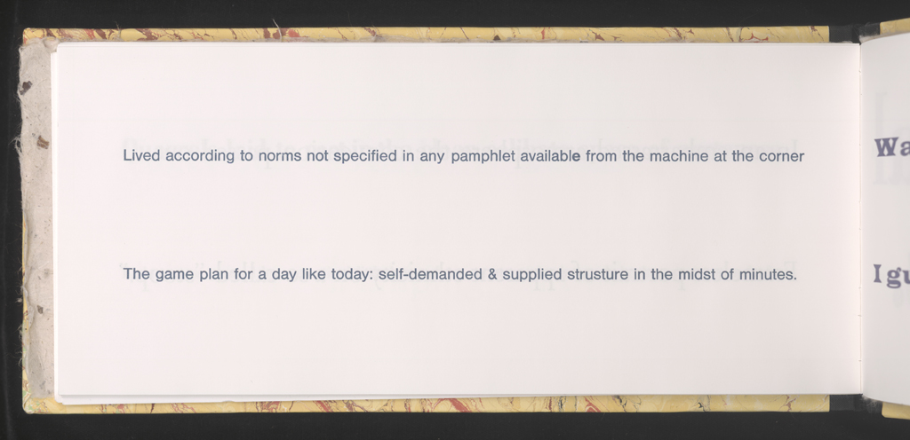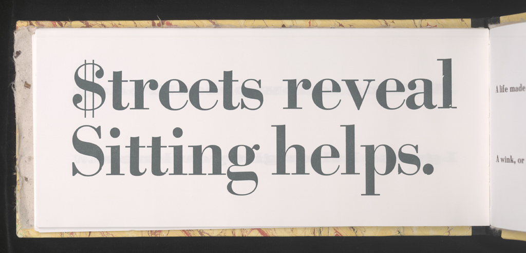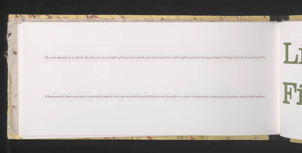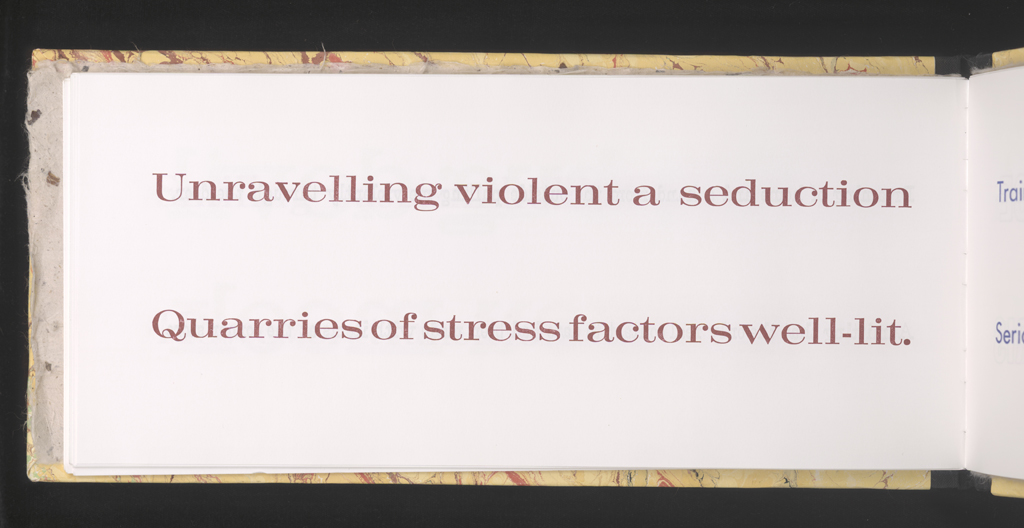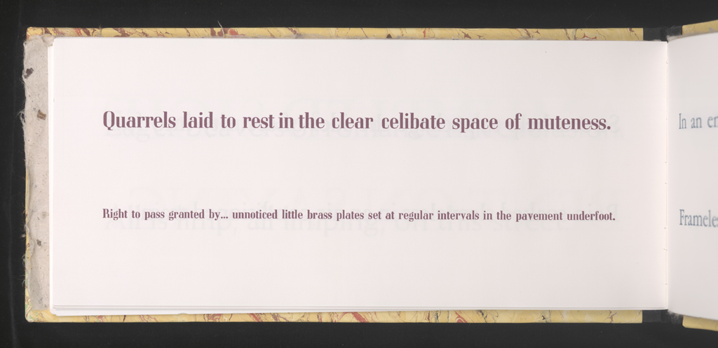 This project was conceived as a type sample book and as a dialogue between the collaborators. The Bow and Arrow Press, in the basement of Adams House at Harvard, supervised and gently guided by the resident daemon, Gino Lee, absentee partner Jim Barondess, and the occasional pale ghost of Charles Steele (struggling to get through an architecture MA in the GDS) was the site and source for the project. The type was abundant and beautiful. The summer was rainy and Emily was learning to print. The project sat on galleys most of the month, gradually accumulating weight, as if it were a long and difficult project. We set in a desultory manner. The book became the thing we were not doing, each involved in her own other projects. And then, in a rush of final energy, we printed the whole thing in about a day, and collated, and bound it all in a rush. A pretty thing, with just enough oblique crypticness in textual texture to provide interest, though the remove of language from the real is all too characteristic of both of our temperaments at the time.