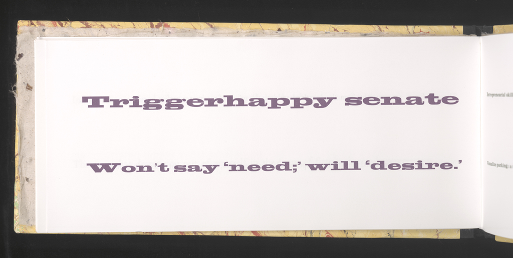 This was a work of fun, friendship, exchange, and typophilic play. Making much more of it would be silly. The texts are goofs, one-offs, and probably give some indication of our vocabulary and sensibility, but not much else. Nothing substantive or really too deliberate was meant by any of it. Most of it was composed just to get something set in the particular font, and then printed.