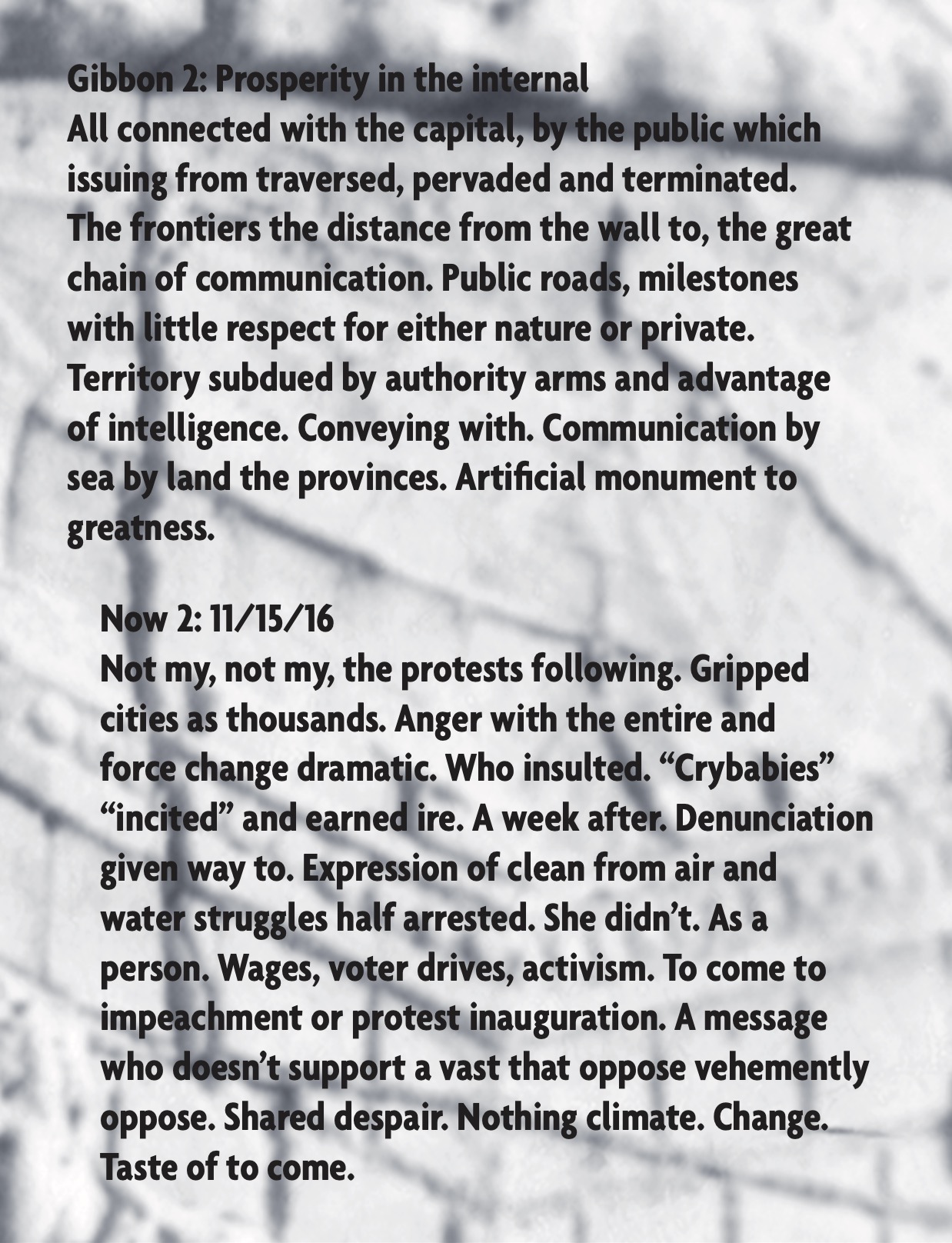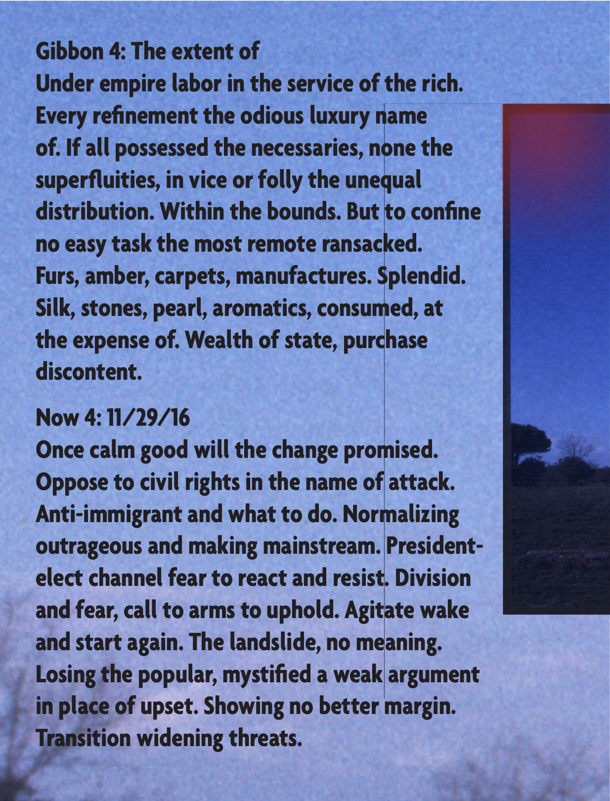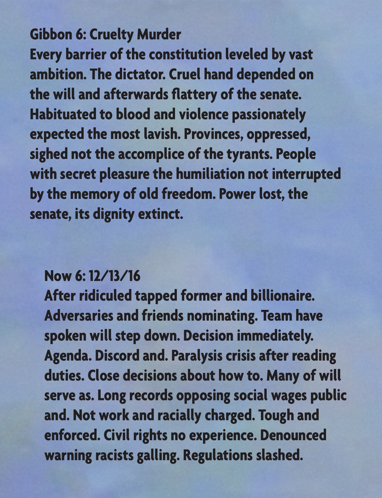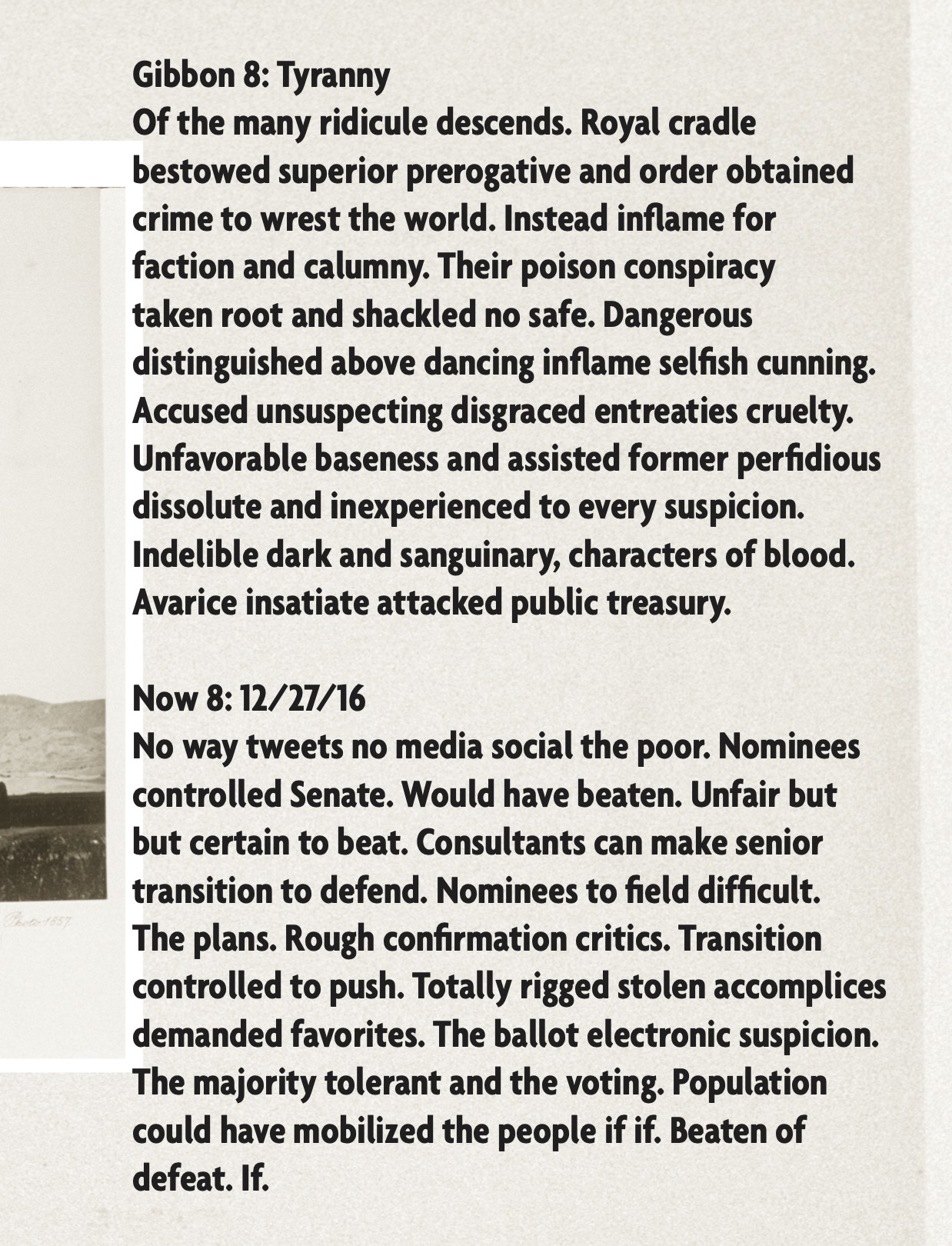 Another post-Trump election work, this is fully elegiac. Using the same I-am-an-algorithm technique that I used in Fabulas Feminae, I did compression writing for a series of weeks after the election. I drew on two corpora, the mainstream newspapers and Edward Gibbon’s The History of the Decline and Fall of the Roman Empire.” Brad Freeman collaborated, creating the rich, dense, dark imagery on the pages through his techniques of offset overprinting.