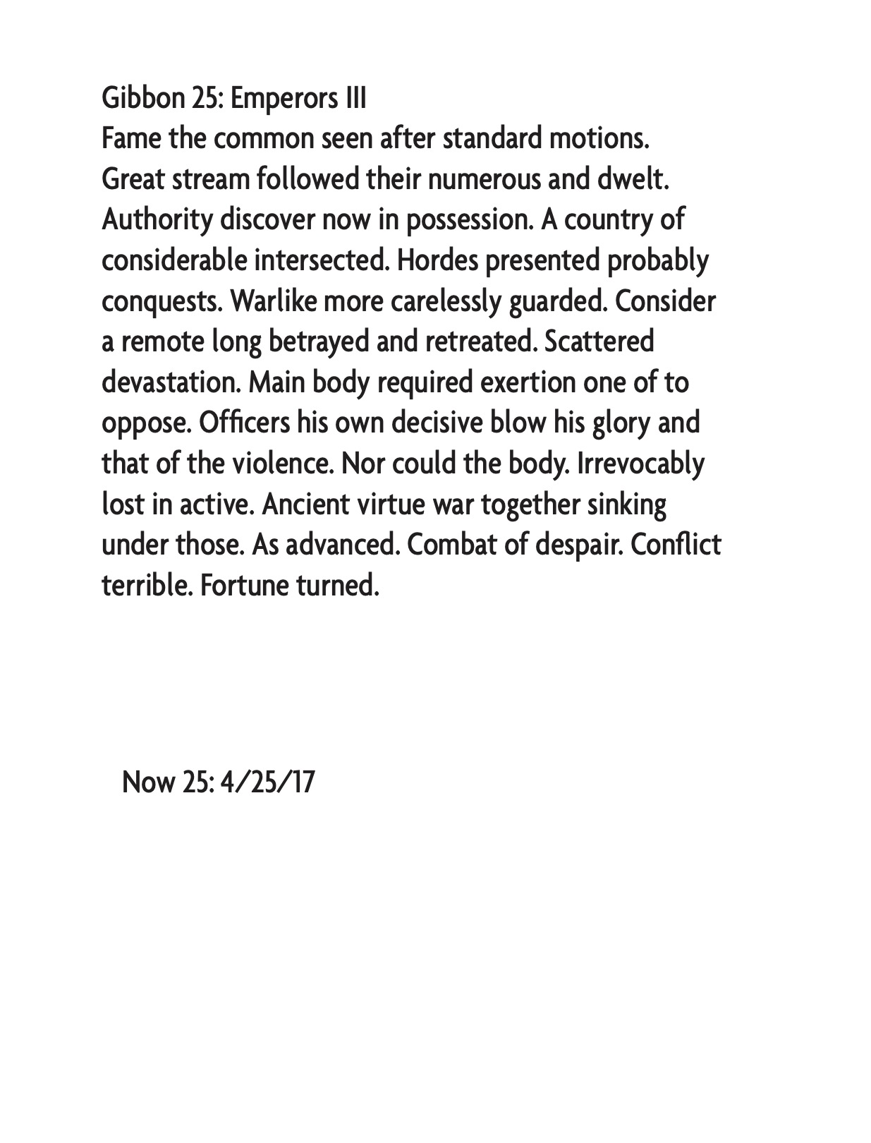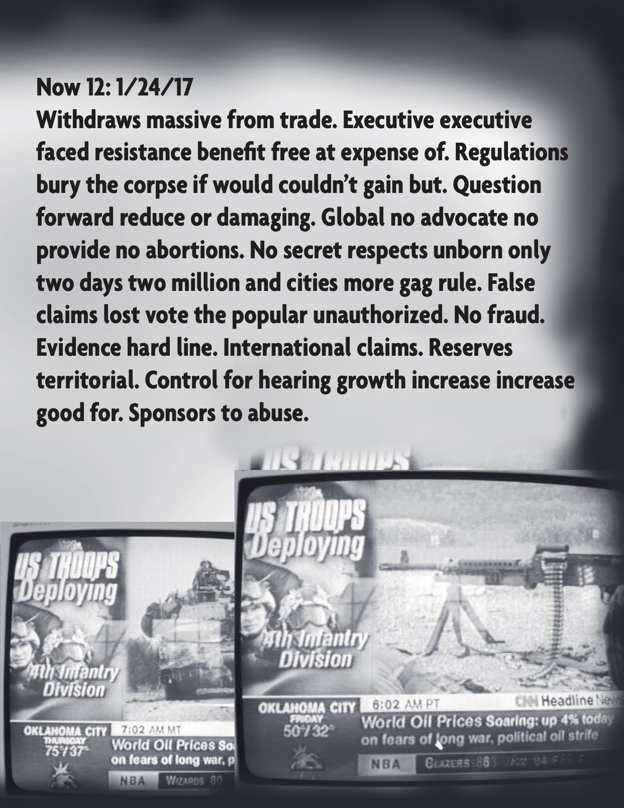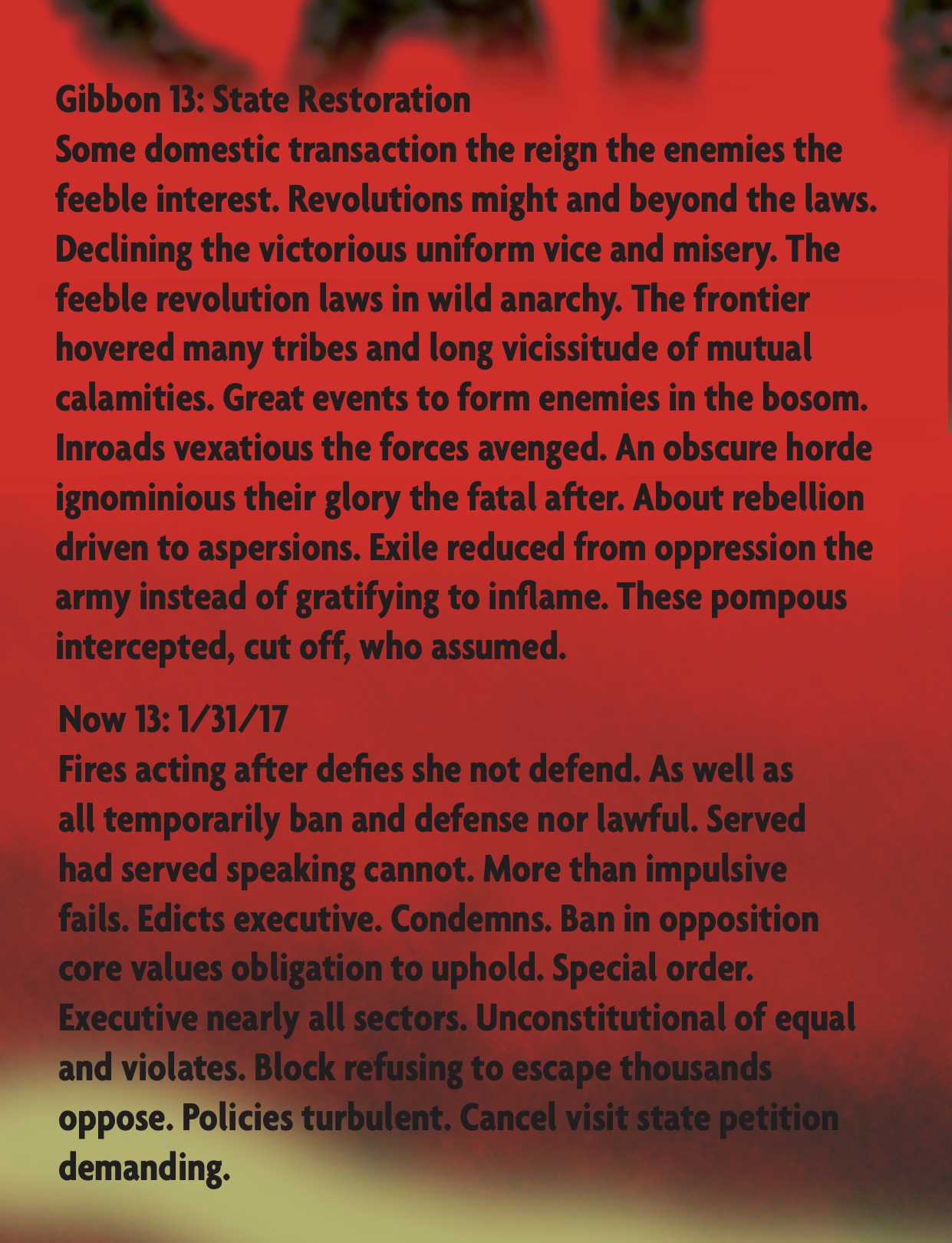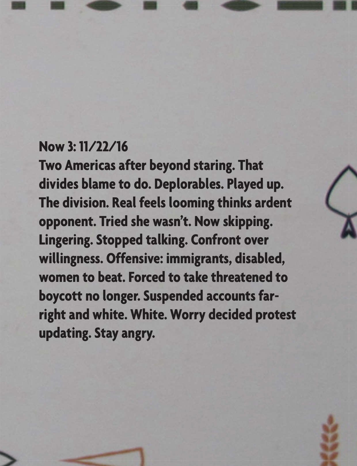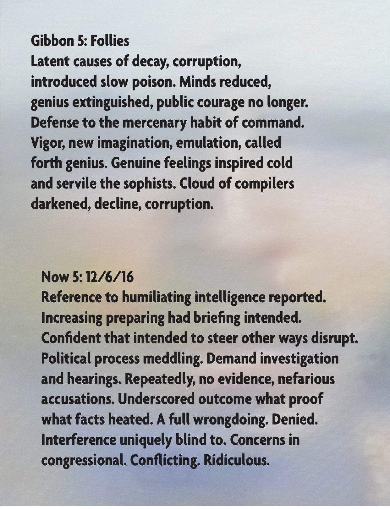 Another post-Trump election work, this is fully elegiac. Using the same I-am-an-algorithm technique that I used in Fabulas Feminae, I did compression writing for a series of weeks after the election. I drew on two corpora, the mainstream newspapers and Edward Gibbon’s The History of the Decline and Fall of the Roman Empire.” Brad Freeman collaborated, creating the rich, dense, dark imagery on the pages through his techniques of offset overprinting.