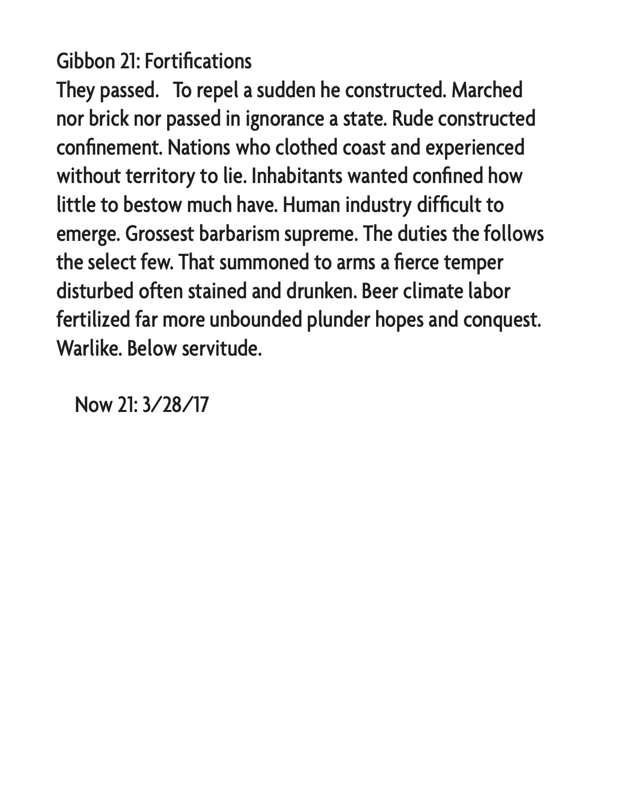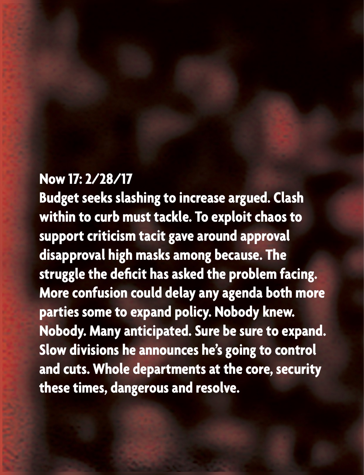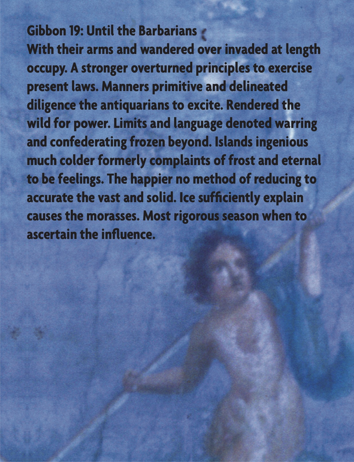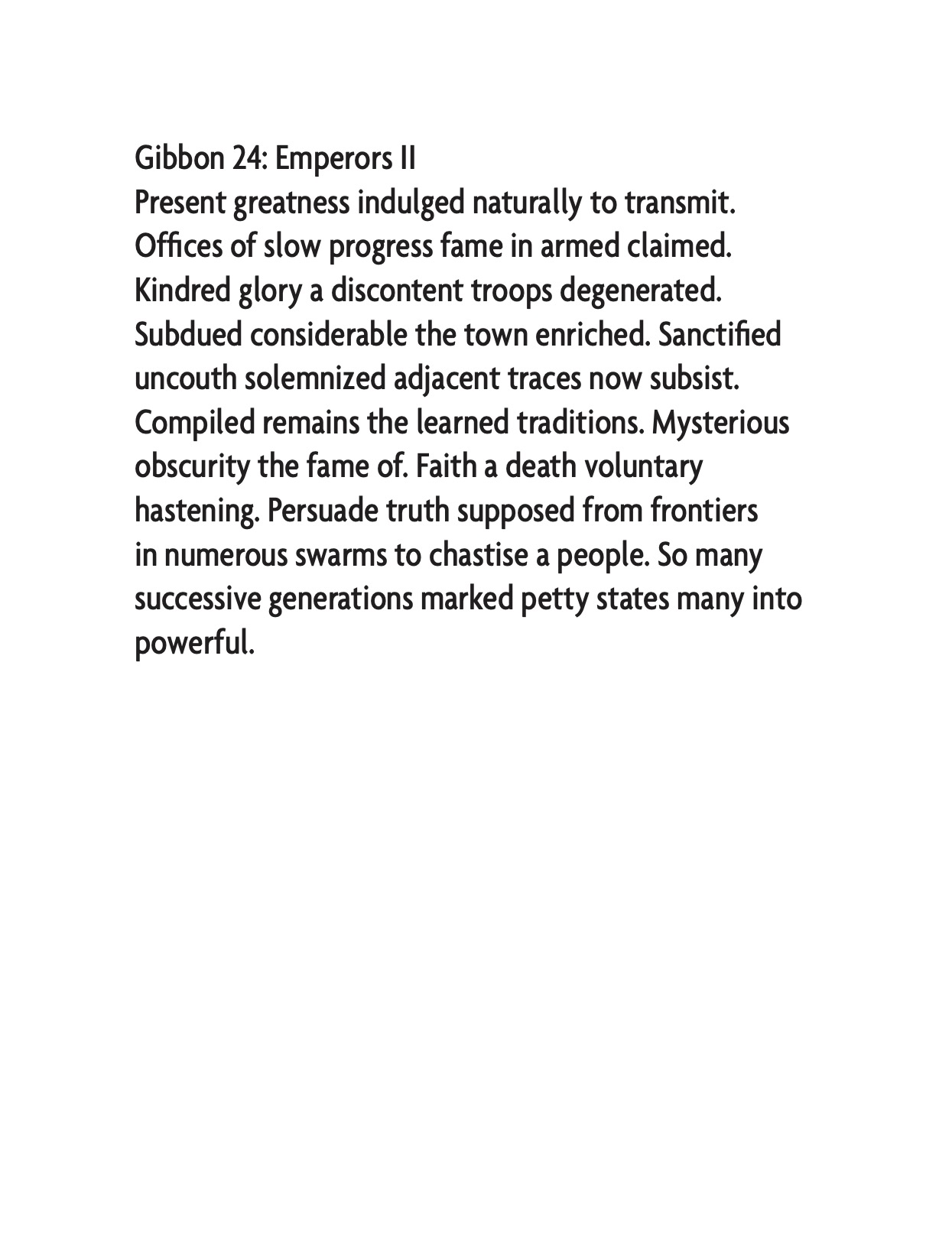 Another post-Trump election work, this is fully elegiac. Using the same I-am-an-algorithm technique that I used in Fabulas Feminae, I did compression writing for a series of weeks after the election. I drew on two corpora, the mainstream newspapers and Edward Gibbon’s The History of the Decline and Fall of the Roman Empire.” Brad Freeman collaborated, creating the rich, dense, dark imagery on the pages through his techniques of offset overprinting.