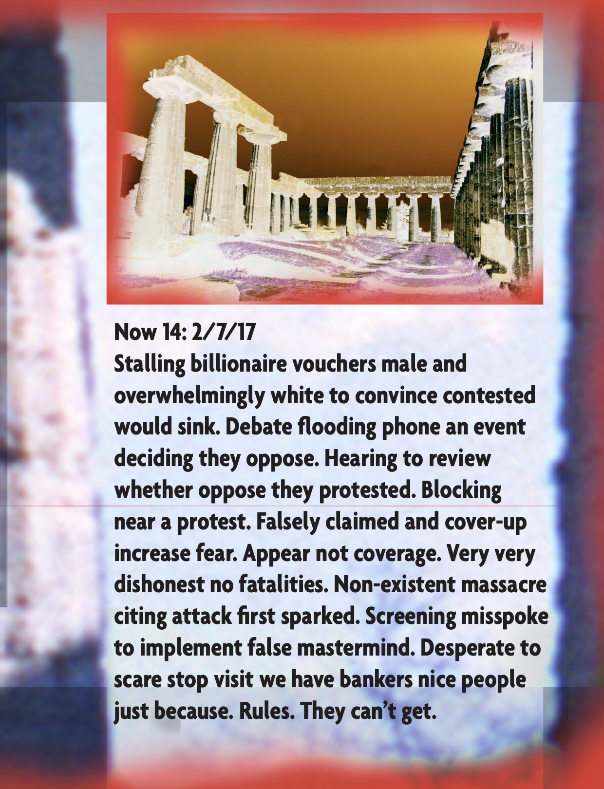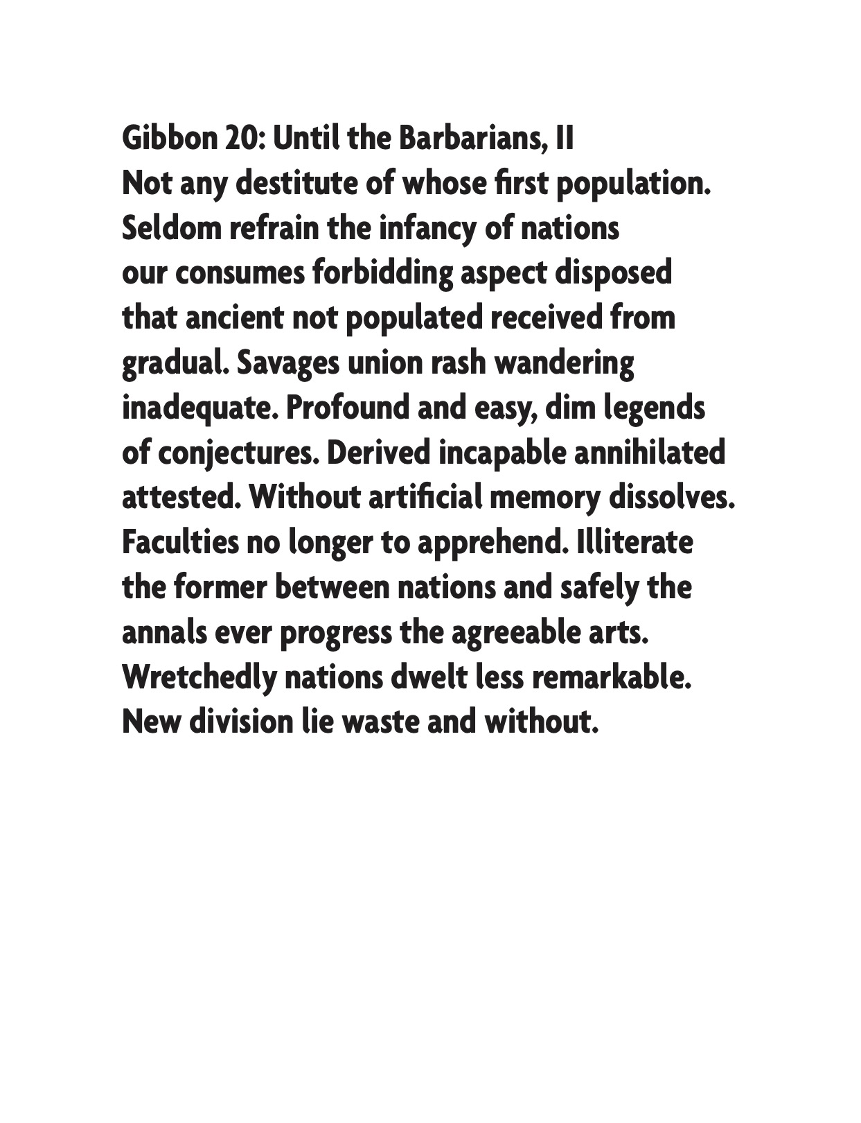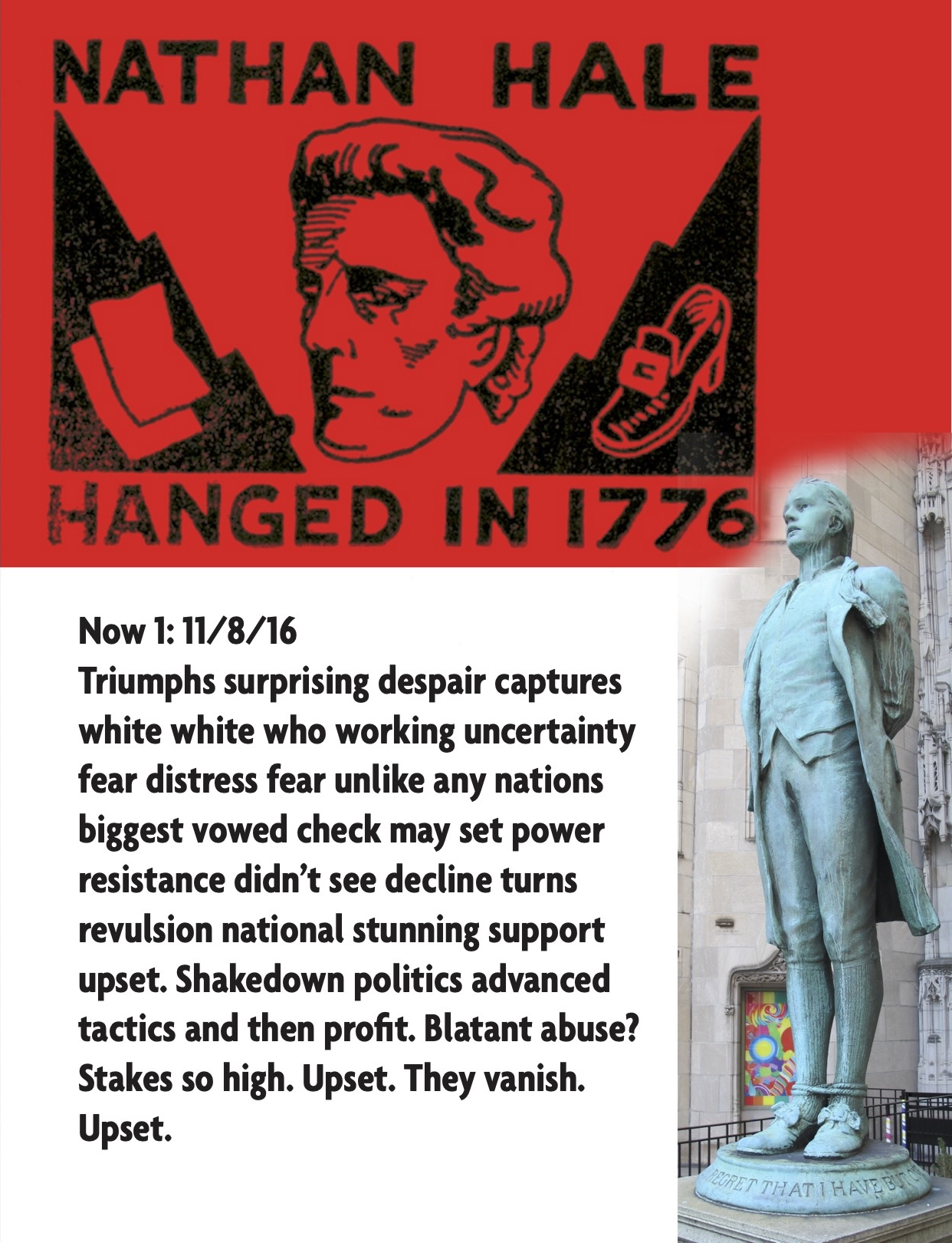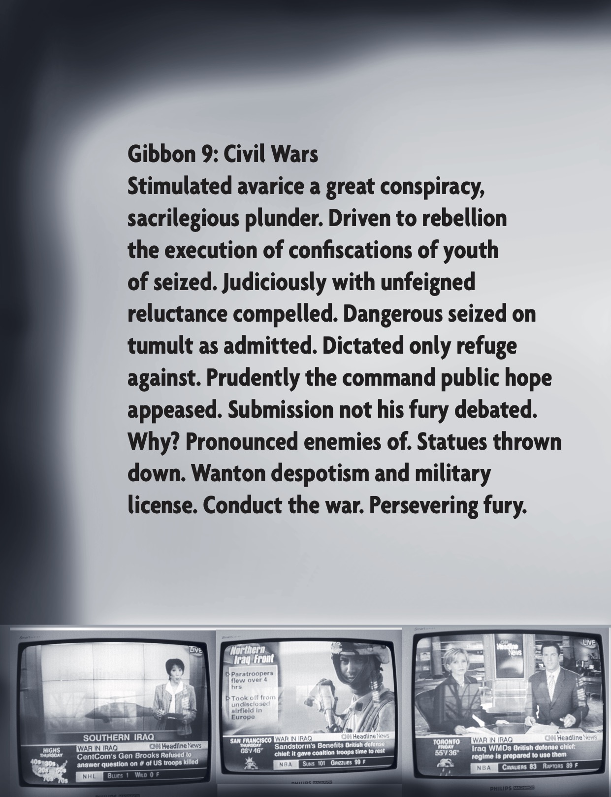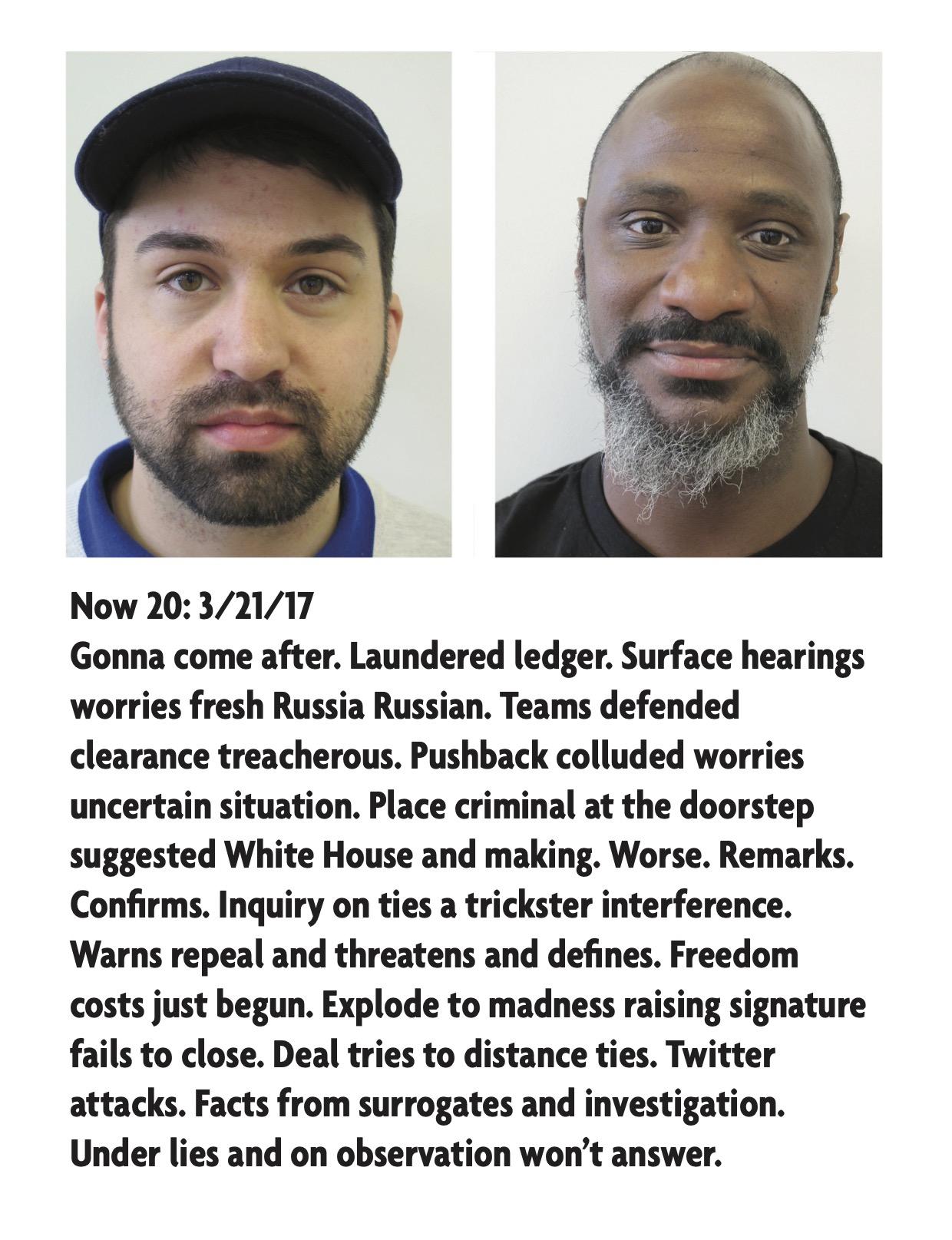 Another post-Trump election work, this is fully elegiac. Using the same I-am-an-algorithm technique that I used in Fabulas Feminae, I did compression writing for a series of weeks after the election. I drew on two corpora, the mainstream newspapers and Edward Gibbon’s The History of the Decline and Fall of the Roman Empire.” Brad Freeman collaborated, creating the rich, dense, dark imagery on the pages through his techniques of offset overprinting.