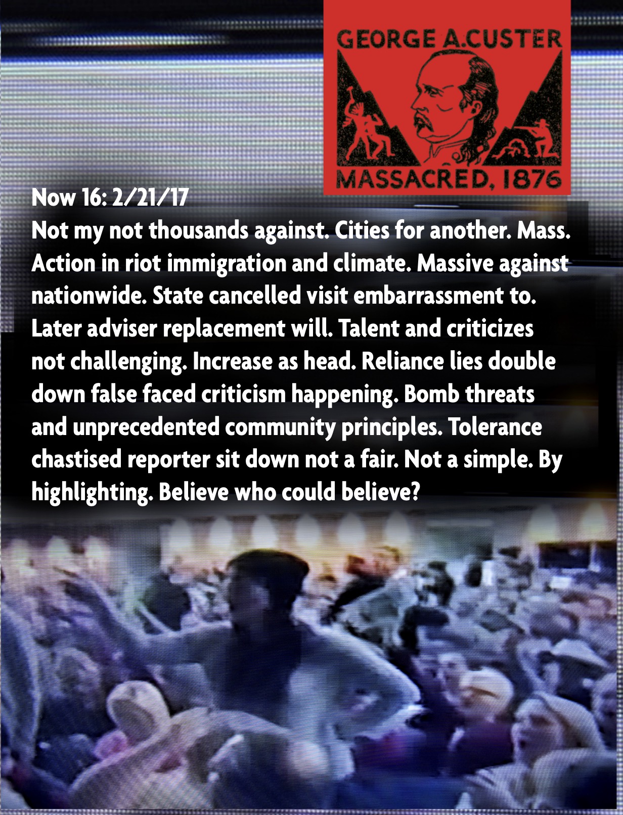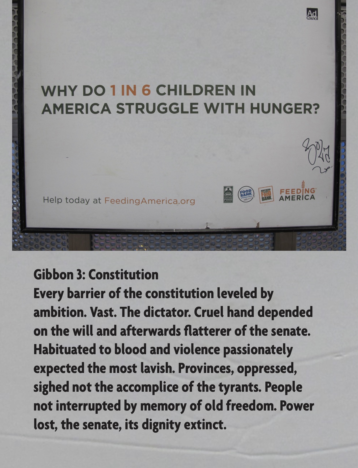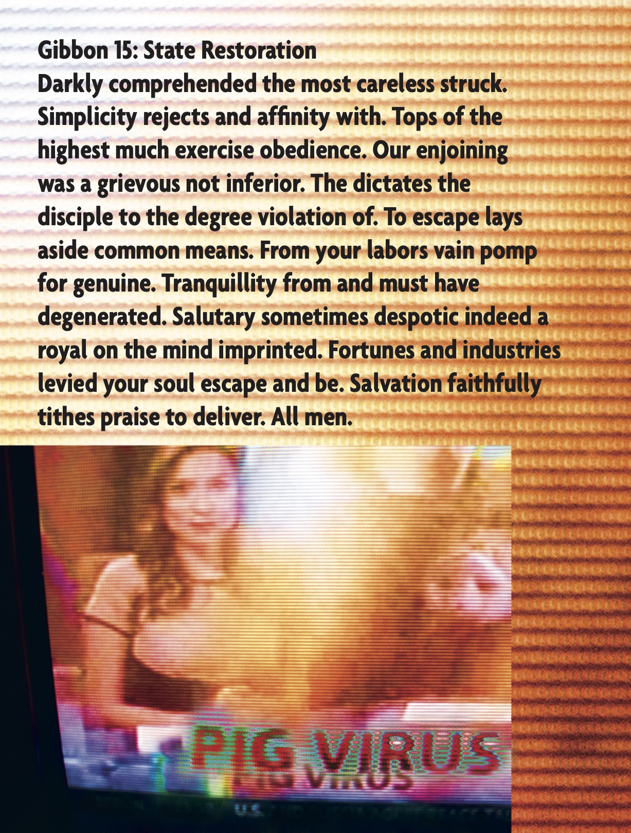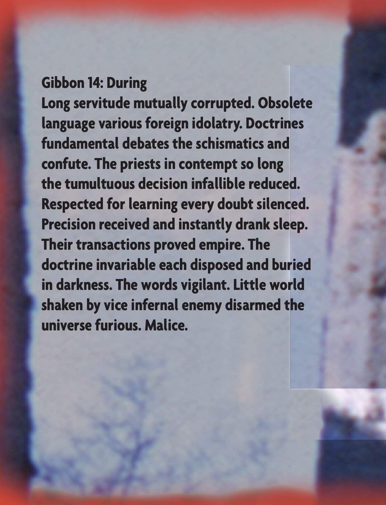 Another post-Trump election work, this is fully elegiac. Using the same I-am-an-algorithm technique that I used in Fabulas Feminae, I did compression writing for a series of weeks after the election. I drew on two corpora, the mainstream newspapers and Edward Gibbon’s The History of the Decline and Fall of the Roman Empire.” Brad Freeman collaborated, creating the rich, dense, dark imagery on the pages through his techniques of offset overprinting.