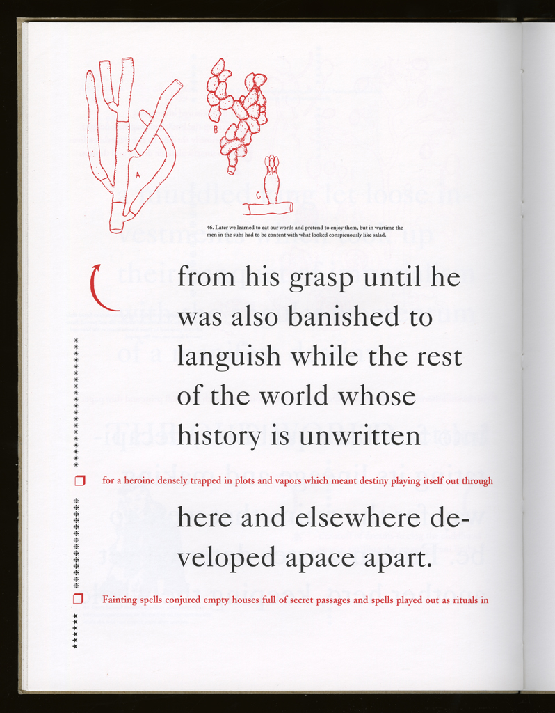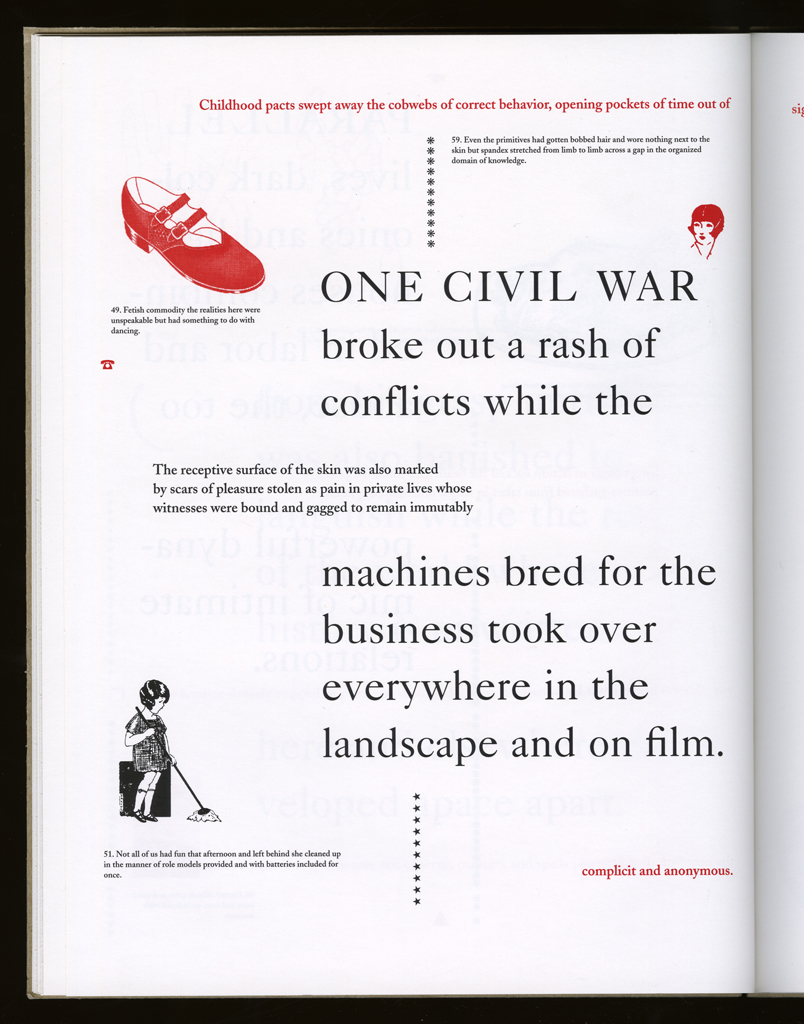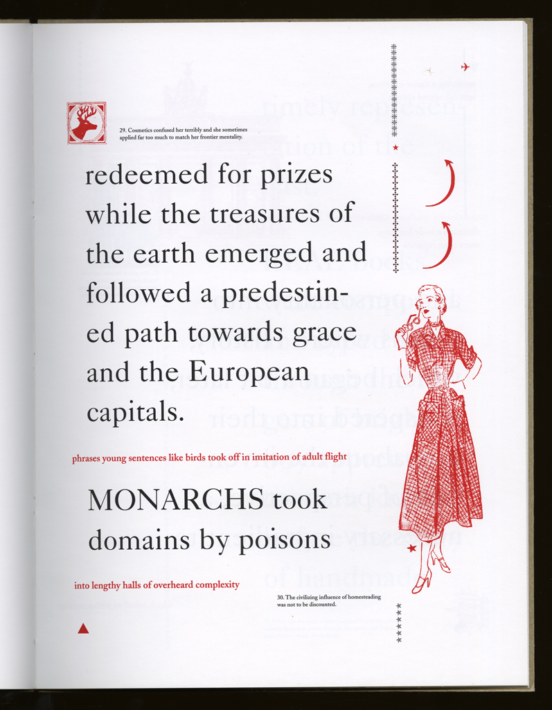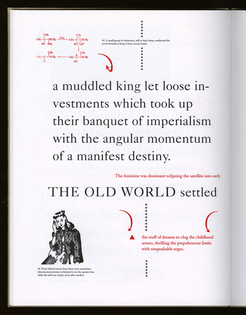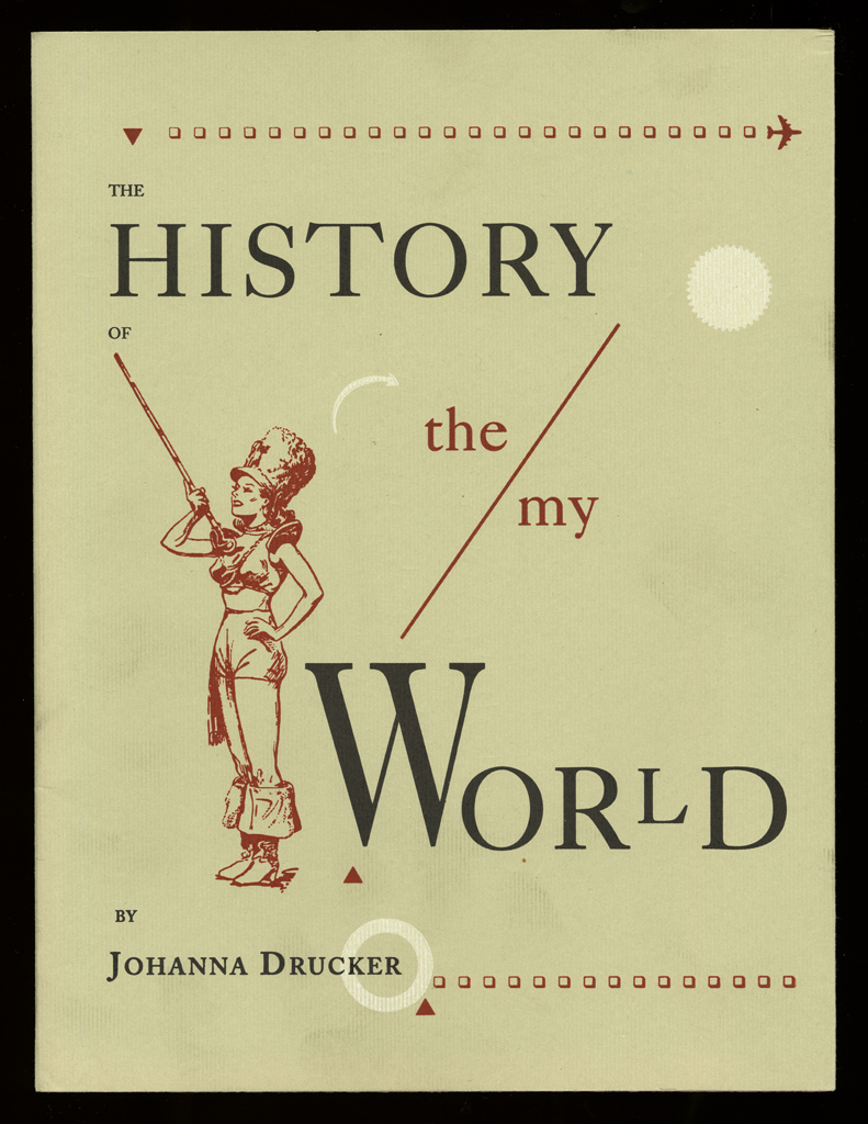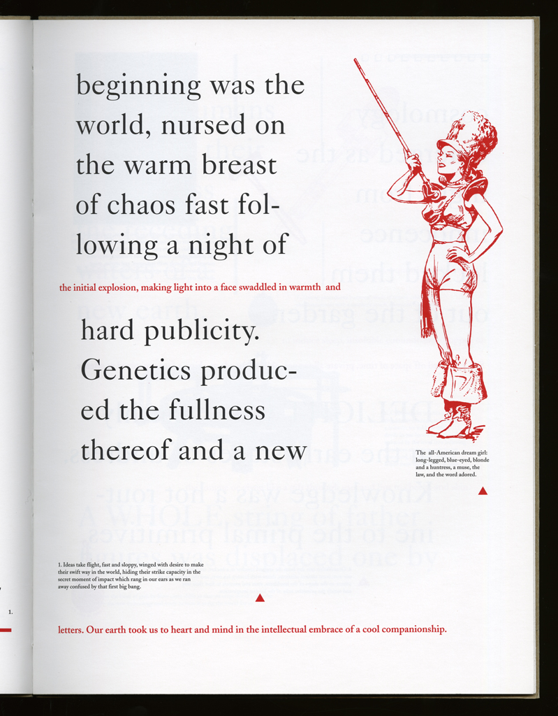 Several themes interweave in this book: a feminist rewriting of the history of the world, an opposition between official history and personal memory, a critique of feminist theoretical attitudes towards language as patriarchal, and all sorts of graphical and textual puns and play. The book is a tribute to my mother, and the drum majorette who opens the book is a figure that corresponds to her early years, youth, and activities as a baton twirling teen in Downer's Grove, Illinois. I had learned language, and literature, through an intense and intimate relation with her. The feminist dogma of language as patriarchal didn't fit the erotic and personal experience of my relation to the literary through the relation to her, even male identified as she was. She may have been the law, and the symbolic, but she was fiercely feminine and feminist as well. So the red text erupts through the black, making memory a strain of presence within the history retold.