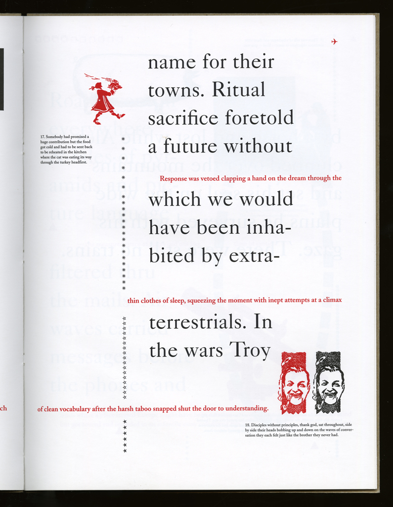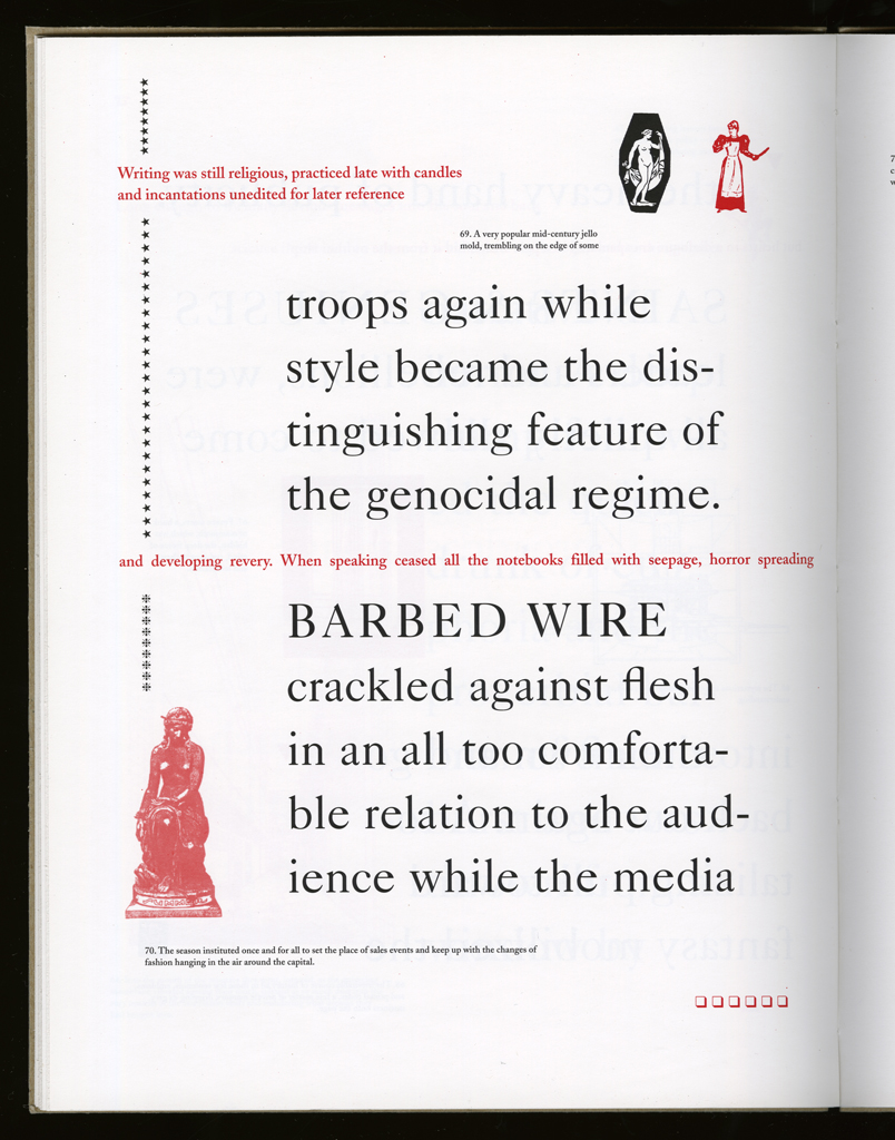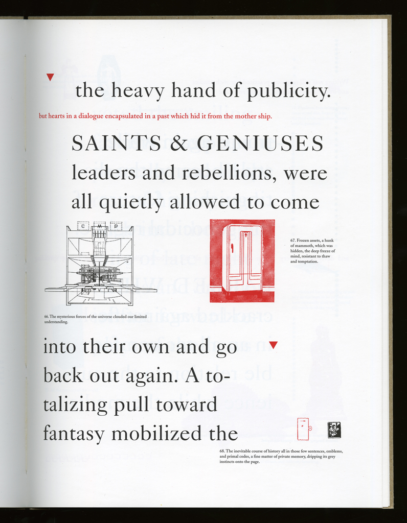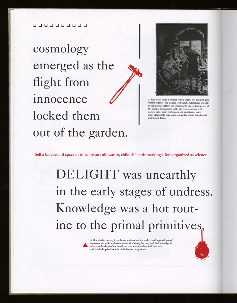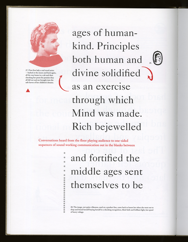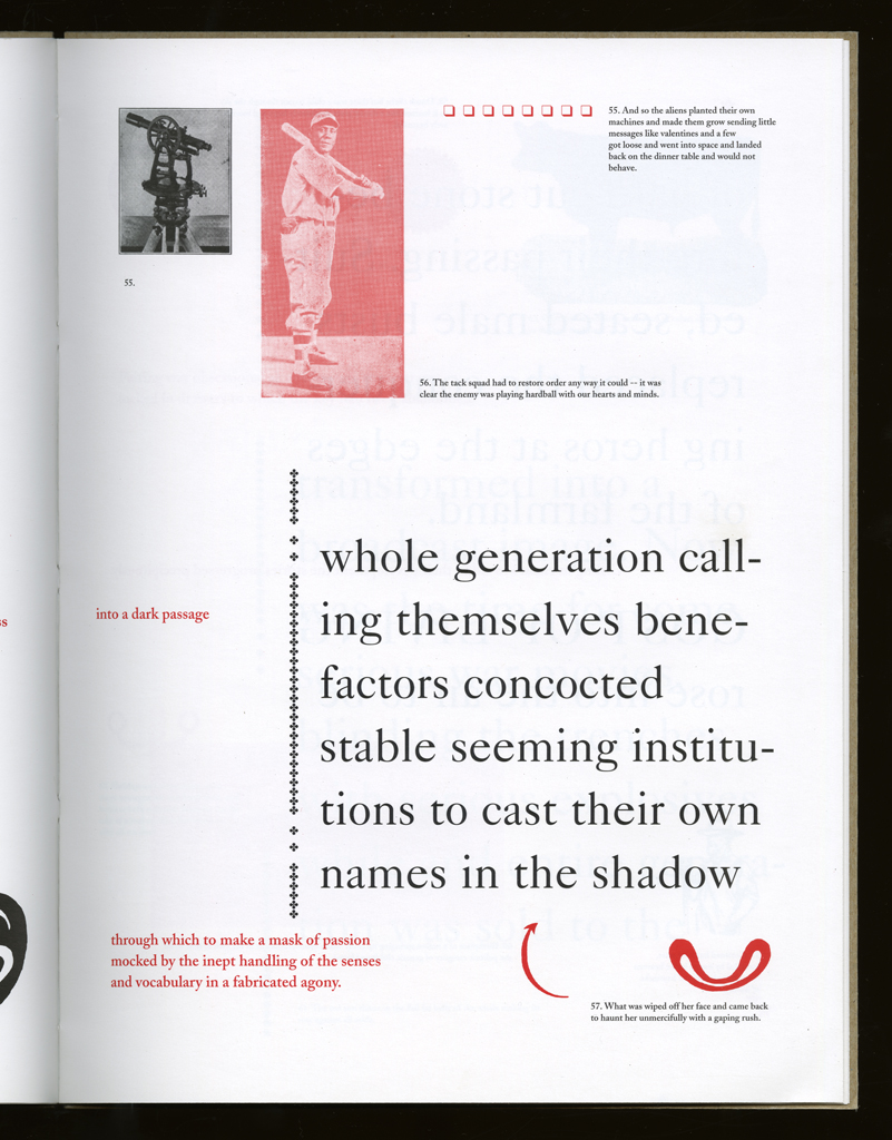 Several themes interweave in this book: a feminist rewriting of the history of the world, an opposition between official history and personal memory, a critique of feminist theoretical attitudes towards language as patriarchal, and all sorts of graphical and textual puns and play. The book is a tribute to my mother, and the drum majorette who opens the book is a figure that corresponds to her early years, youth, and activities as a baton twirling teen in Downer's Grove, Illinois. I had learned language, and literature, through an intense and intimate relation with her. The feminist dogma of language as patriarchal didn't fit the erotic and personal experience of my relation to the literary through the relation to her, even male identified as she was. She may have been the law, and the symbolic, but she was fiercely feminine and feminist as well. So the red text erupts through the black, making memory a strain of presence within the history retold.