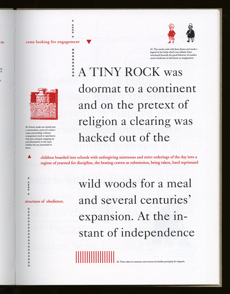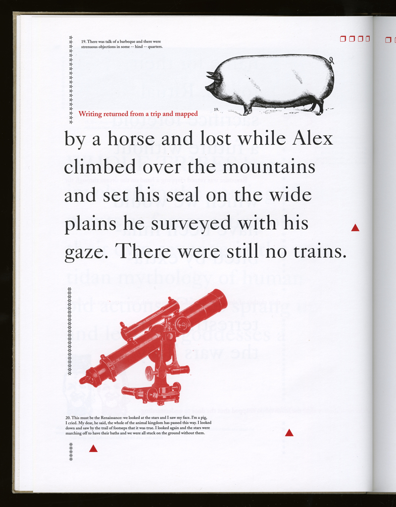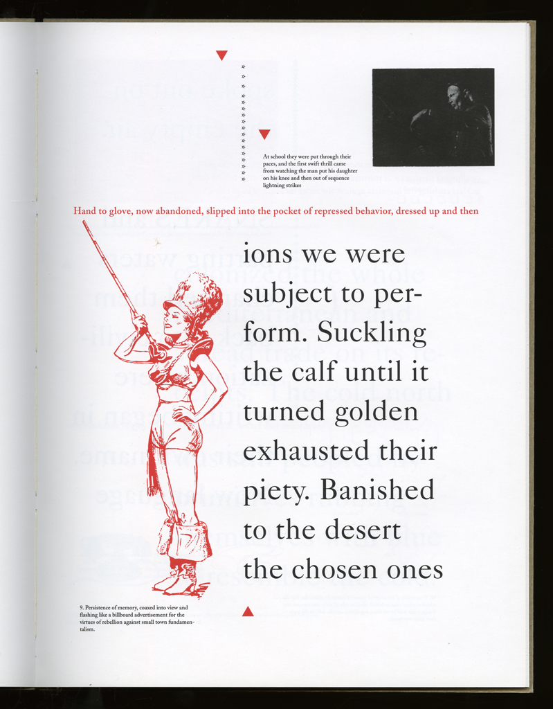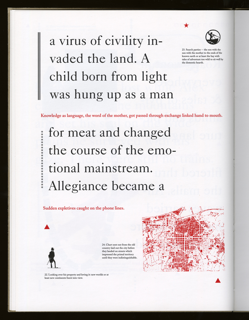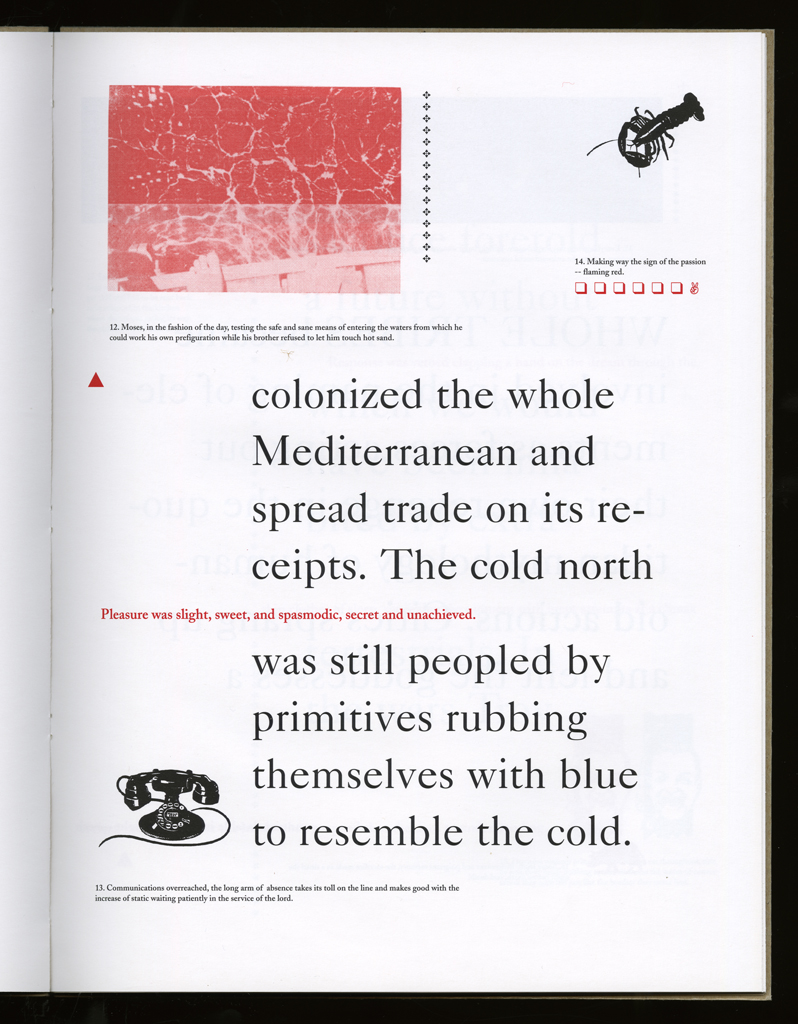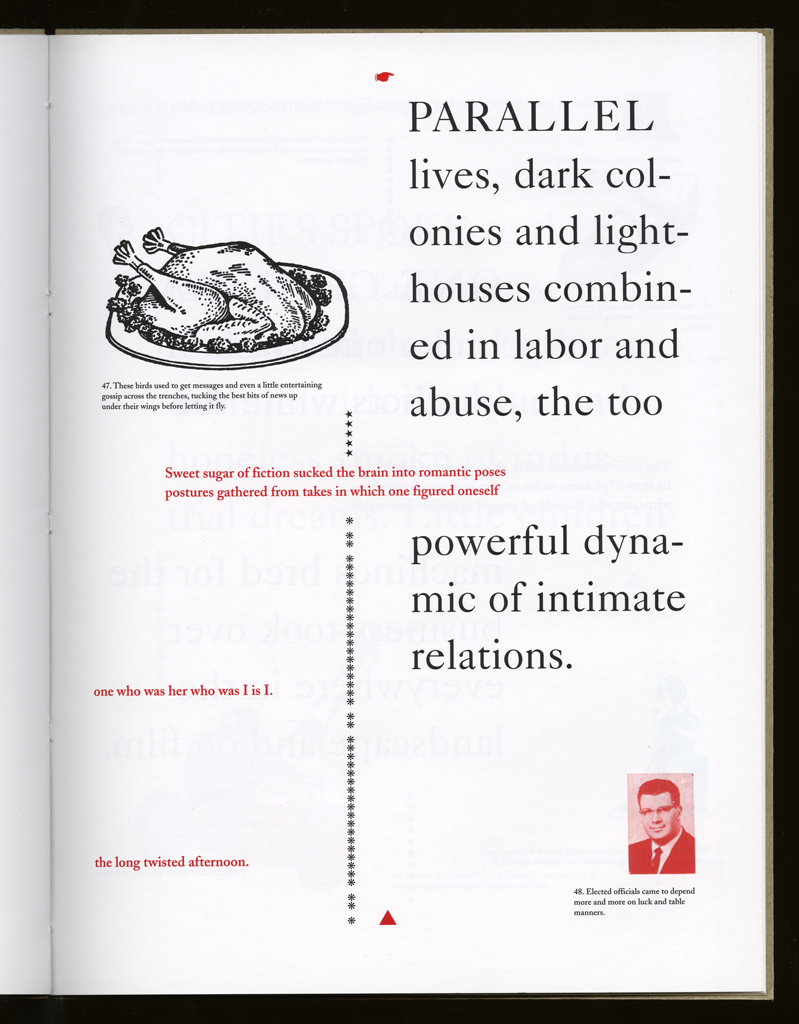 Several themes interweave in this book: a feminist rewriting of the history of the world, an opposition between official history and personal memory, a critique of feminist theoretical attitudes towards language as patriarchal, and all sorts of graphical and textual puns and play. The book is a tribute to my mother, and the drum majorette who opens the book is a figure that corresponds to her early years, youth, and activities as a baton twirling teen in Downer's Grove, Illinois. I had learned language, and literature, through an intense and intimate relation with her. The feminist dogma of language as patriarchal didn't fit the erotic and personal experience of my relation to the literary through the relation to her, even male identified as she was. She may have been the law, and the symbolic, but she was fiercely feminine and feminist as well. So the red text erupts through the black, making memory a strain of presence within the history retold.