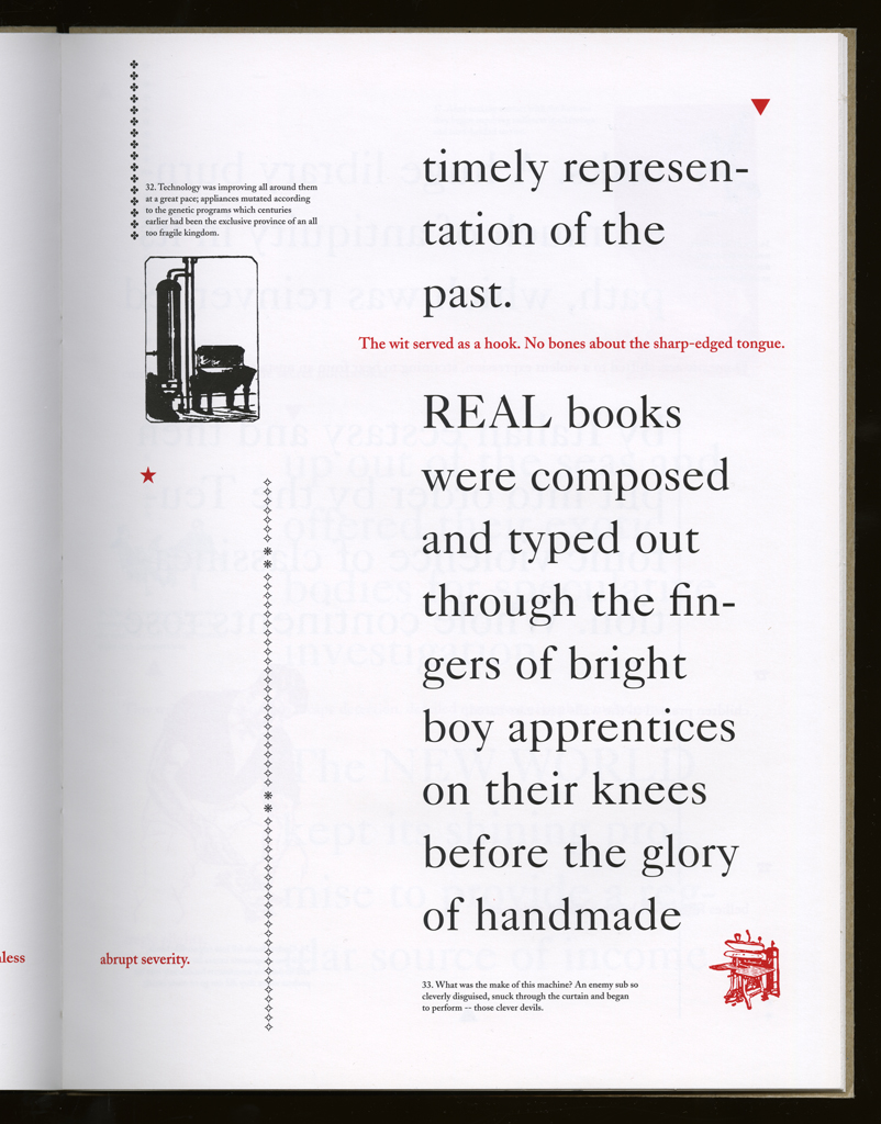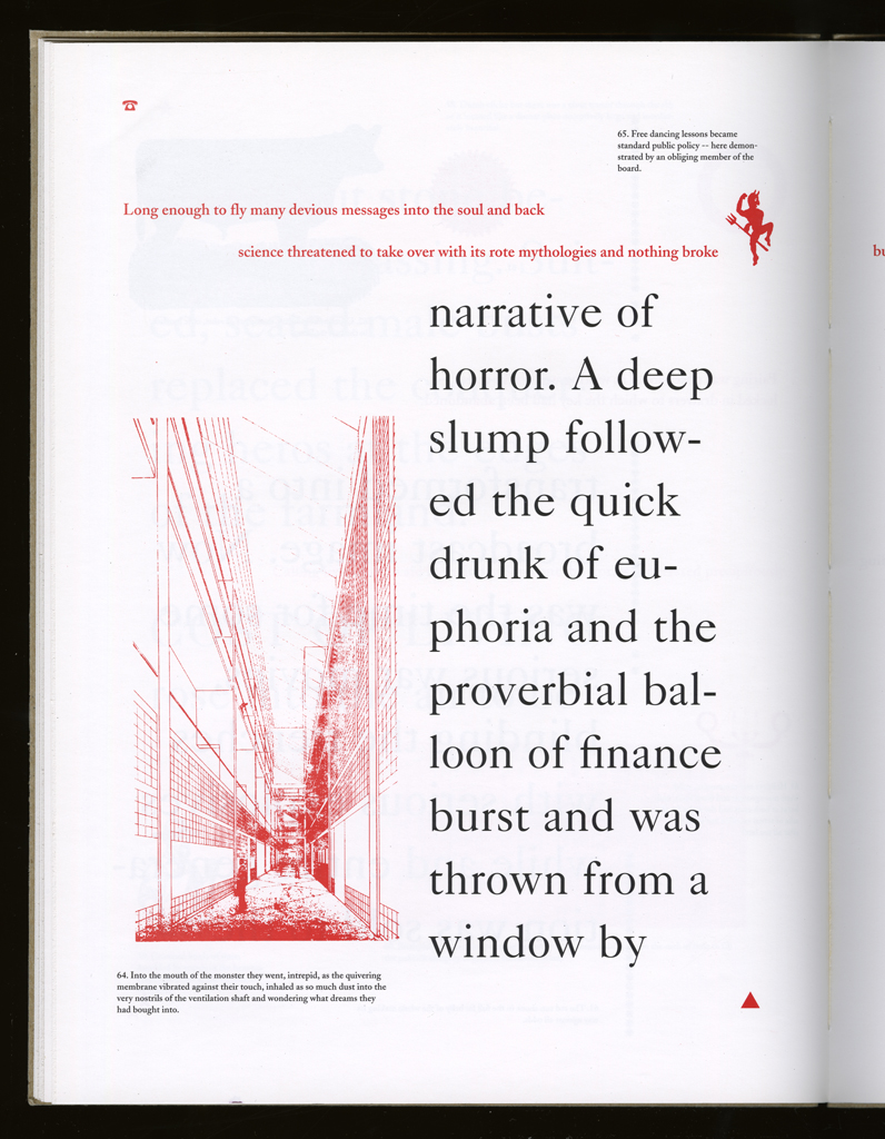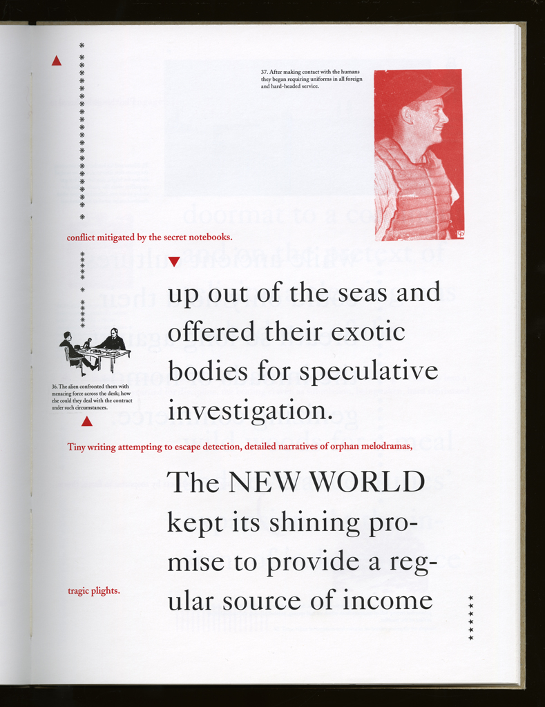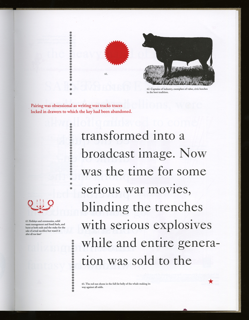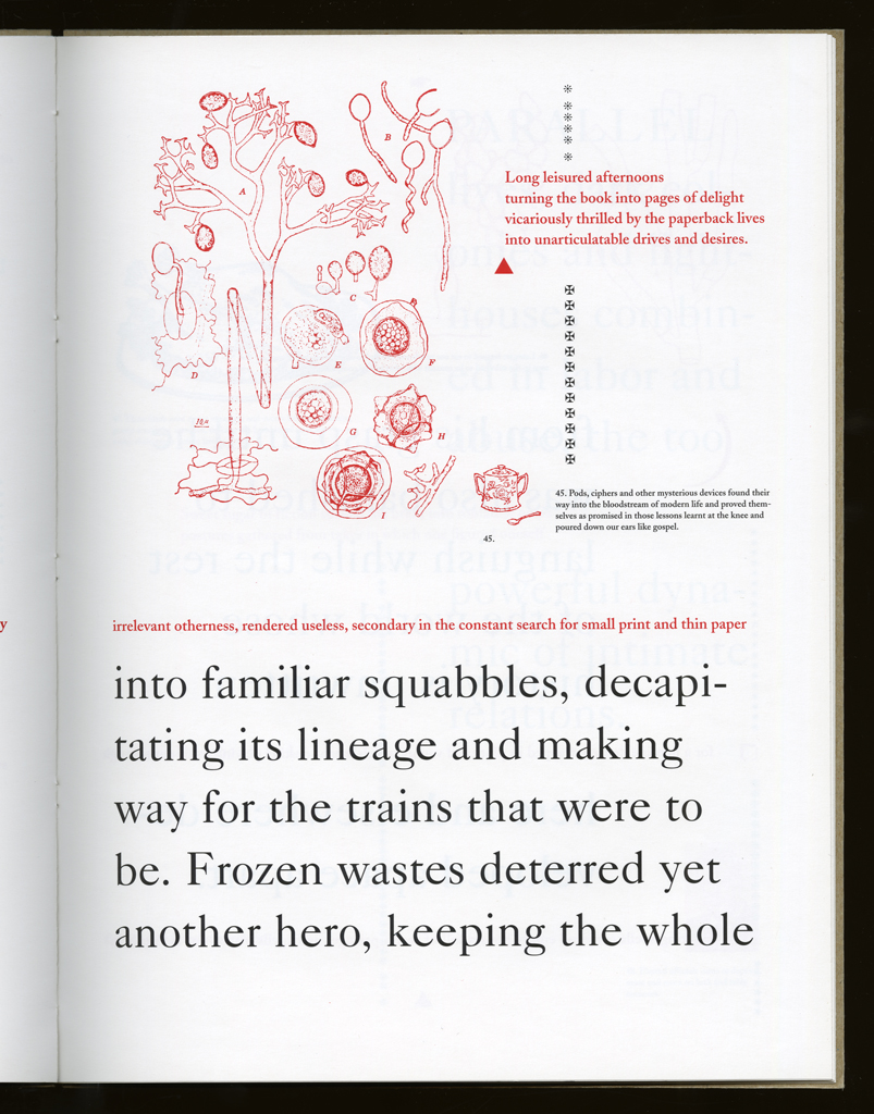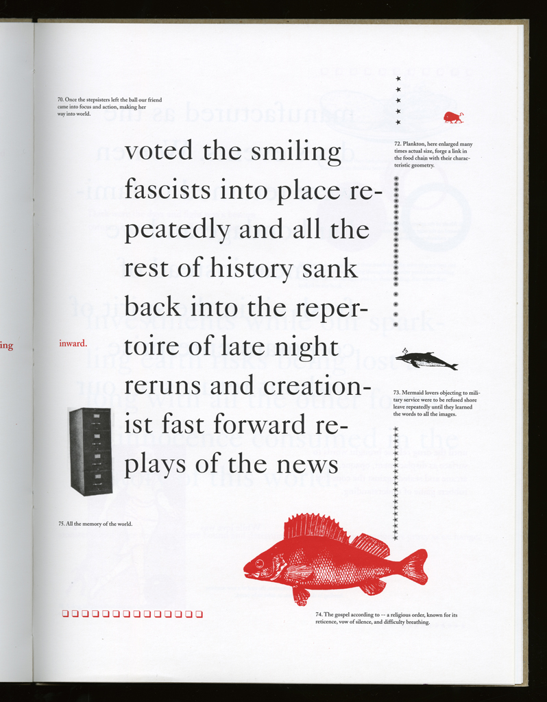Several themes interweave in this book: a feminist rewriting of the history of the world, an opposition between official history and personal memory, a critique of feminist theoretical attitudes towards language as patriarchal, and all sorts of graphical and textual puns and play. The book is a tribute to my mother, and the drum majorette who opens the book is a figure that corresponds to her early years, youth, and activities as a baton twirling teen in Downer's Grove, Illinois. I had learned language, and literature, through an intense and intimate relation with her. The feminist dogma of language as patriarchal didn't fit the erotic and personal experience of my relation to the literary through the relation to her, even male identified as she was. She may have been the law, and the symbolic, but she was fiercely feminine and feminist as well. So the red text erupts through the black, making memory a strain of presence within the history retold.