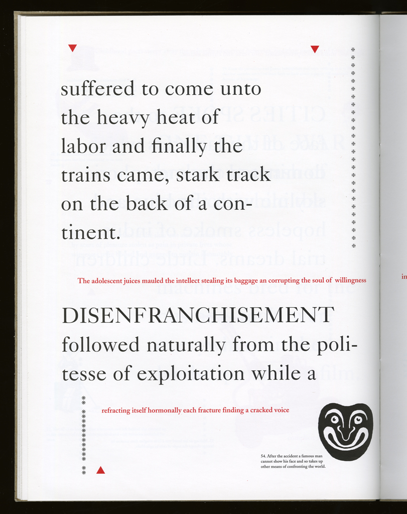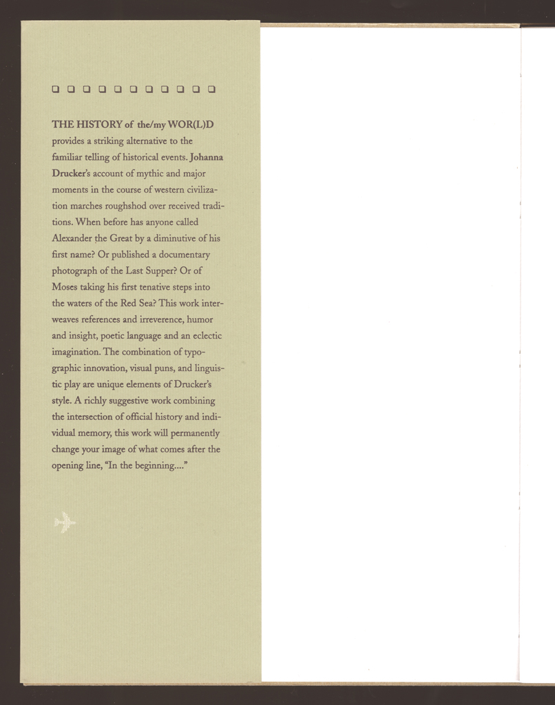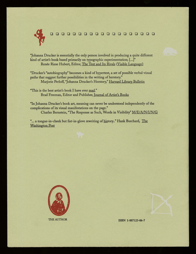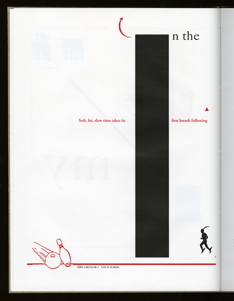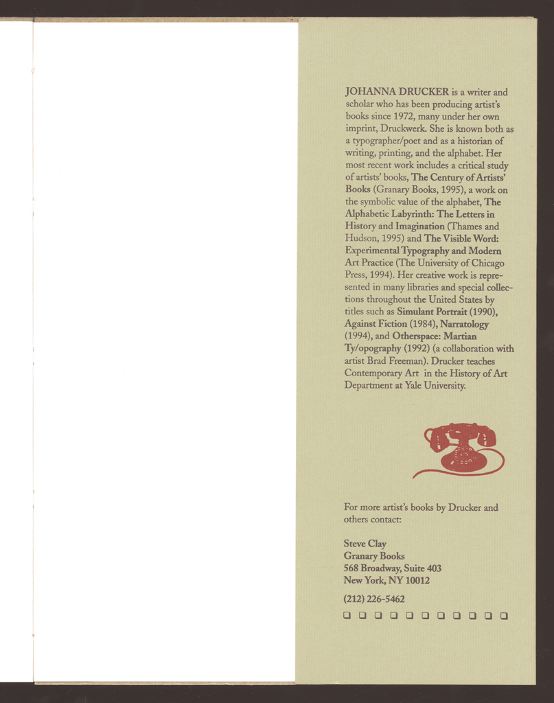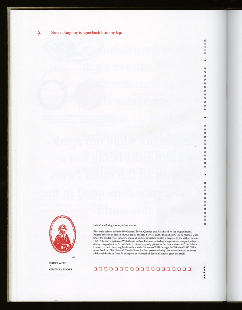 In fond and loving memory of my mother. / First trade edition published by Granary Books. Quarked on a Mac based on the original layout. Printed offset in an edition of 2000 copies at SoHo Services on the Heidelberg GTO by Michael Chan under the skillful eye of Anne Noonan and staff. Dust jackets printed letterpress by the author. Summer 1995. All archival materials. With thanks to Brad Freeman for technical support and companionship during this production. Artists' limited edition originally printed at the Bow and Arrow Press, Adams House, Harvard University, by the author in the Summer of 1989 through the Winter of 1990. With many thanks to Gino Lee and Charles Steele for their presence during that production and as always additional thanks to Gino for all aspects of technical advice on all matters great and small.