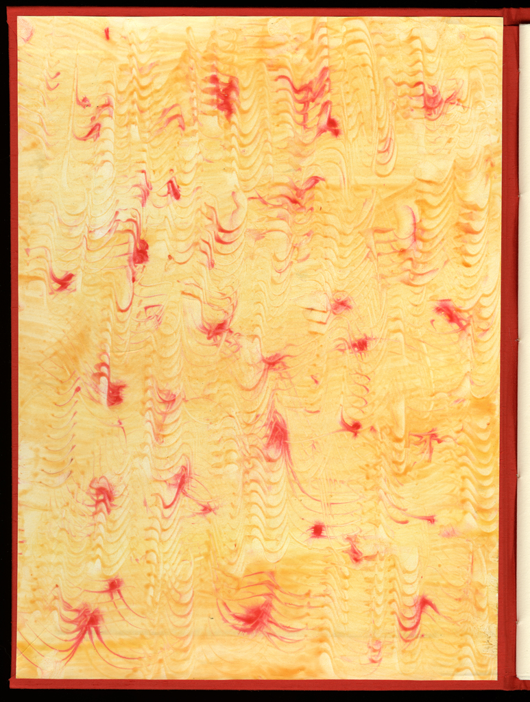 general description: Vivid poppy silk covers the boards and gives the book a contemporary feeling. The format is large enough to command some respect, but not so large as to be awkward to handle.