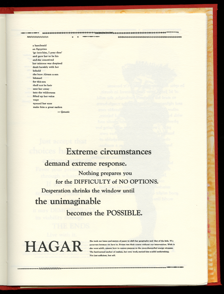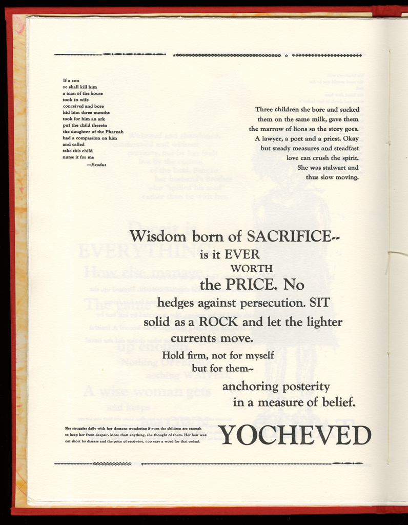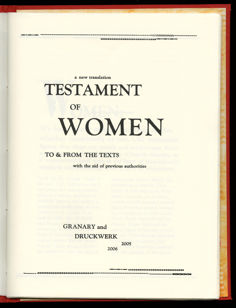 Testament of Women was conceived in response to Vanessa Ochs's "Sarah Laughed". The edition created between 2005 and 2006 may serve as the basis of another project aimed at a wider audience, and produced in a different format. But that remains to be seen.