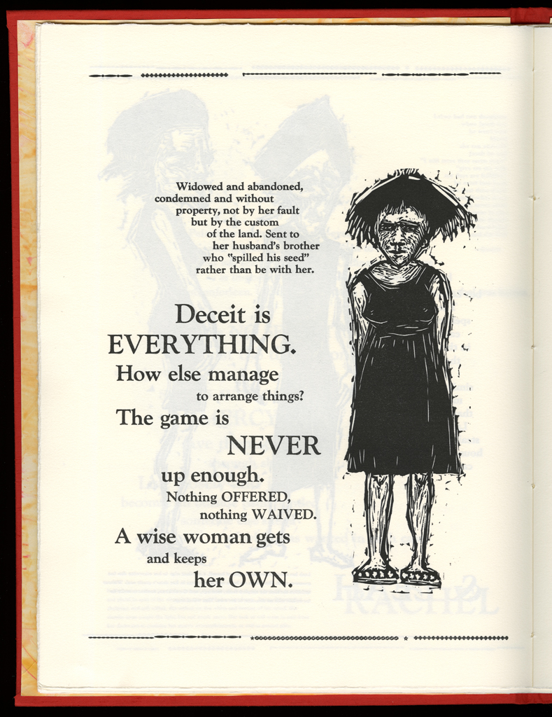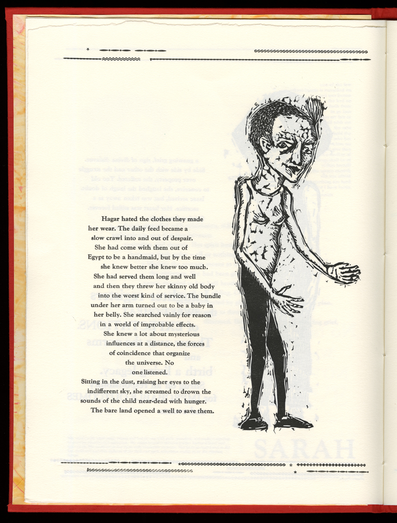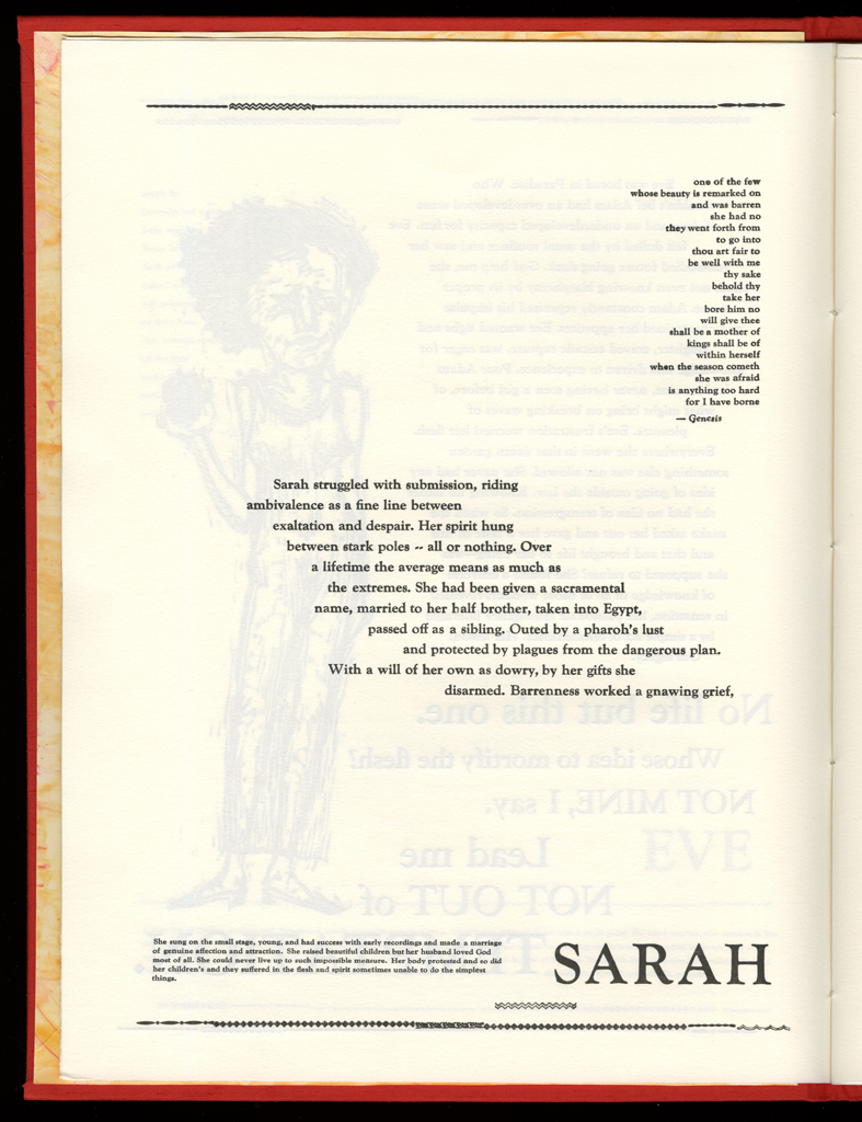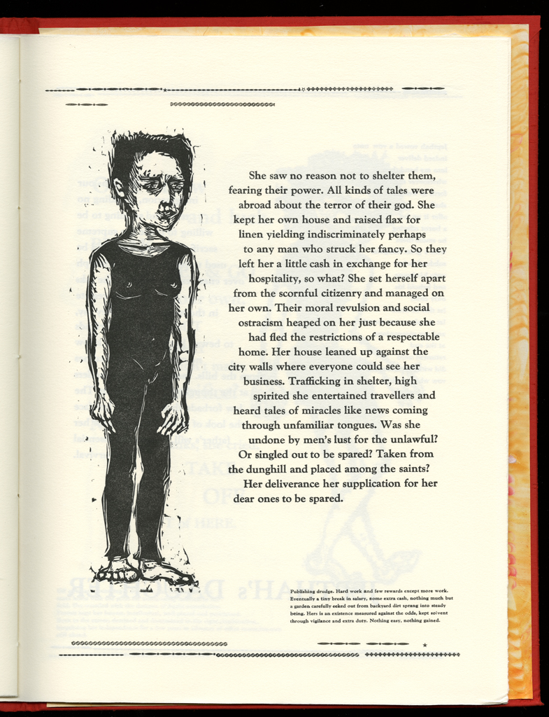 The first linoleum cuts were done in the spring of 2005, along with initial research and study. The bulk of the texts and drawings were created during summer of 2005. The layout dummy was made in summer 2005, all in one longish weekend of drawing and calligraphing the compositions. The linoleum cuts were made throughout spring and summer, with one additional cut for Lilith added at the end of the summer. The printing was done from summer 2005 through summer 2006 at the Virginia Arts of the Book Center using Goudy Bold, in part because it was one of the few typefaces that we had in a range of sizes and with enough font material to set these texts.