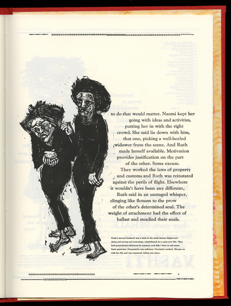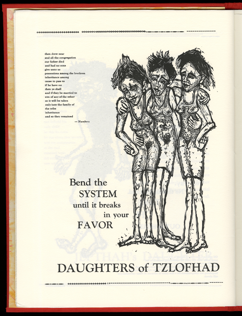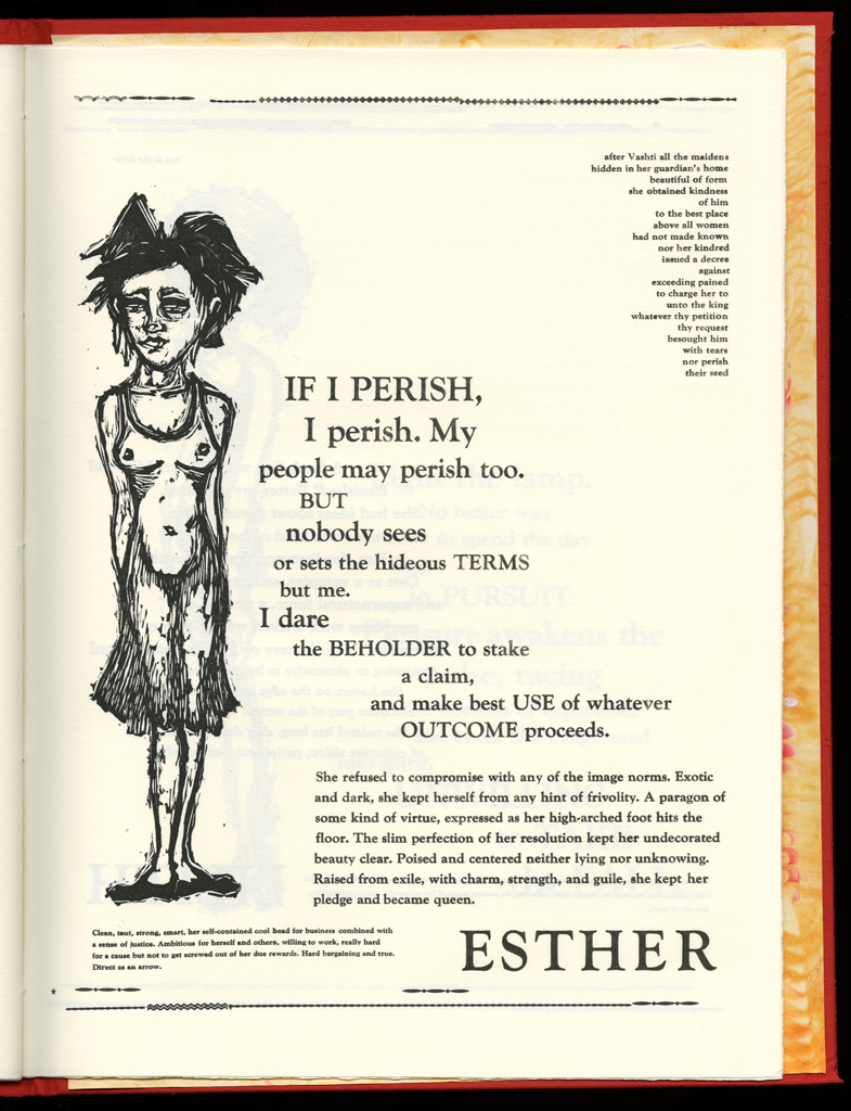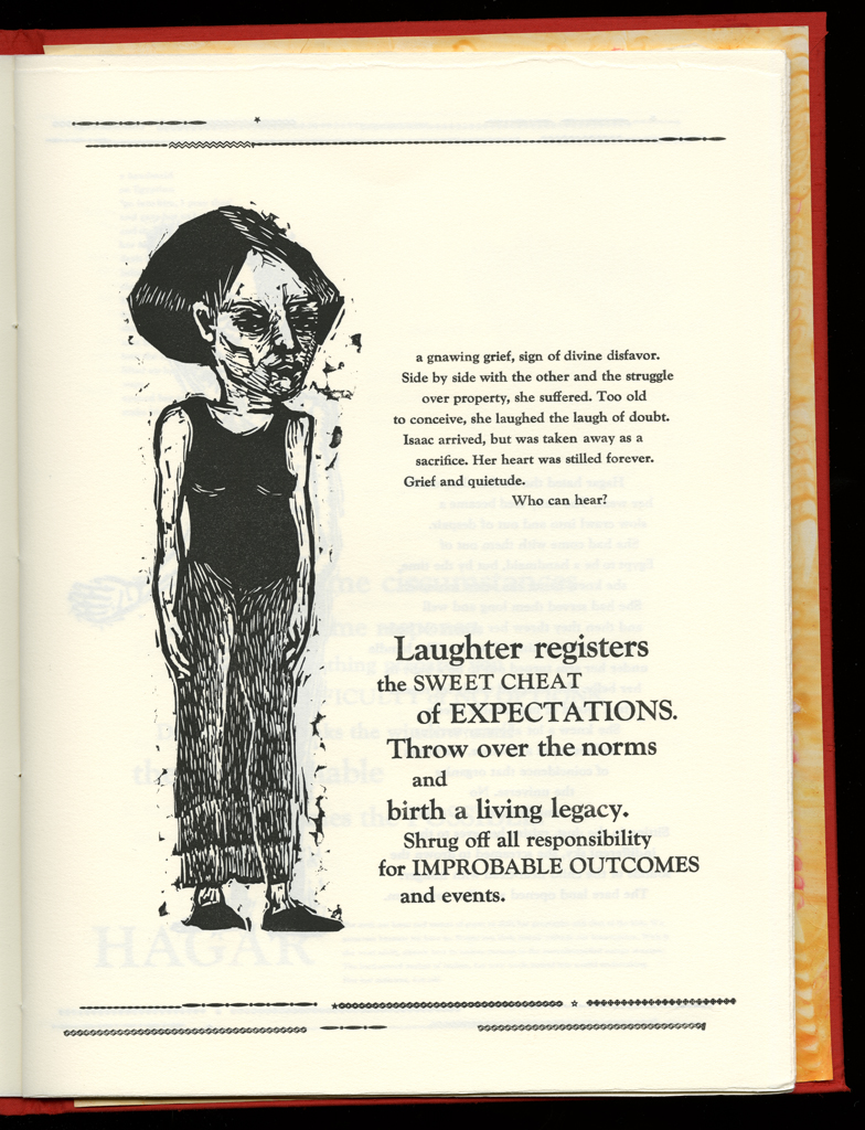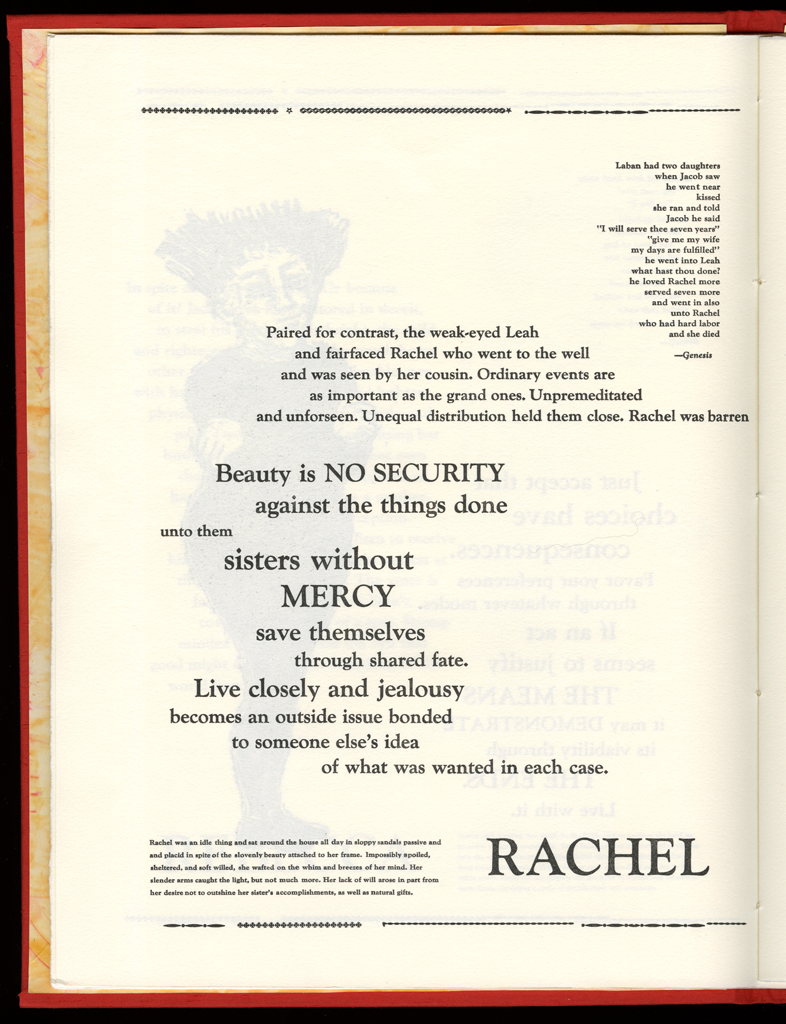 The first linoleum cuts were done in the spring of 2005, along with initial research and study. The bulk of the texts and drawings were created during summer of 2005. The layout dummy was made in summer 2005, all in one longish weekend of drawing and calligraphing the compositions. The linoleum cuts were made throughout spring and summer, with one additional cut for Lilith added at the end of the summer. The printing was done from summer 2005 through summer 2006 at the Virginia Arts of the Book Center using Goudy Bold, in part because it was one of the few typefaces that we had in a range of sizes and with enough font material to set these texts.