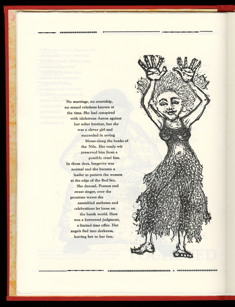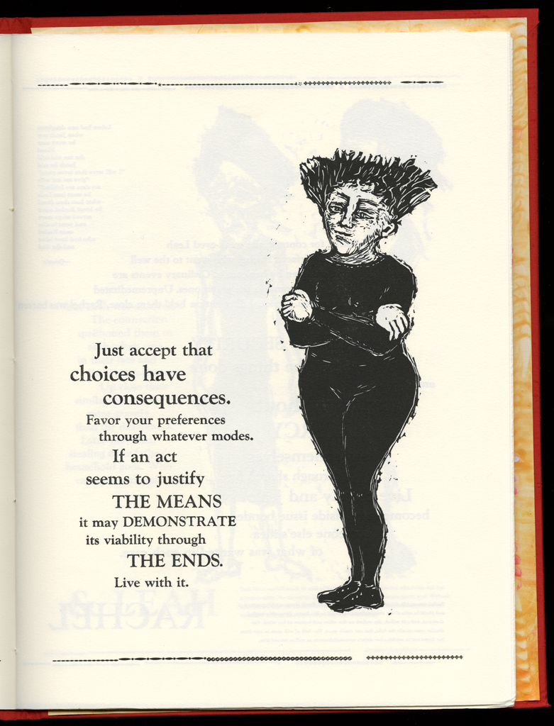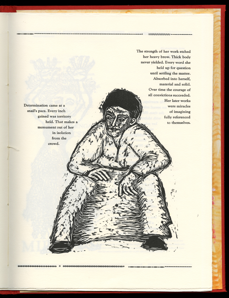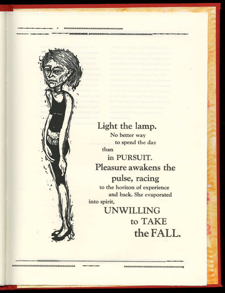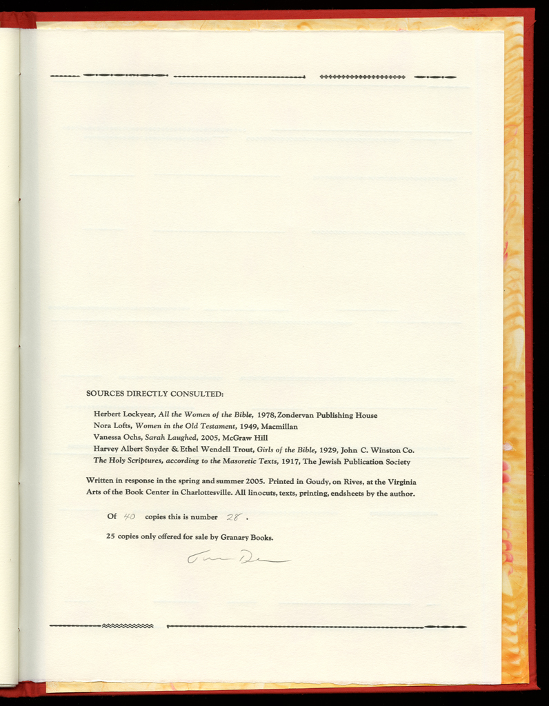 Written in response in the spring and summer of 2005. Printed in Goudy, on Rives, at the Virginia Arts of the Book Center in Charlottesvile. All linocuts, texts, printing, endsheets by the author.