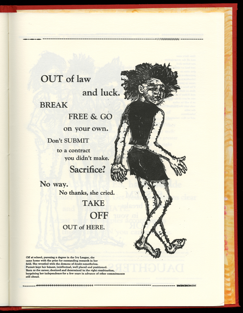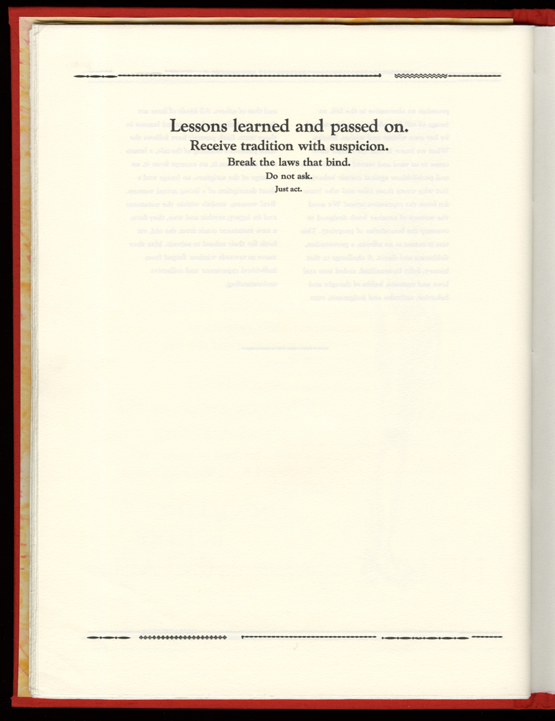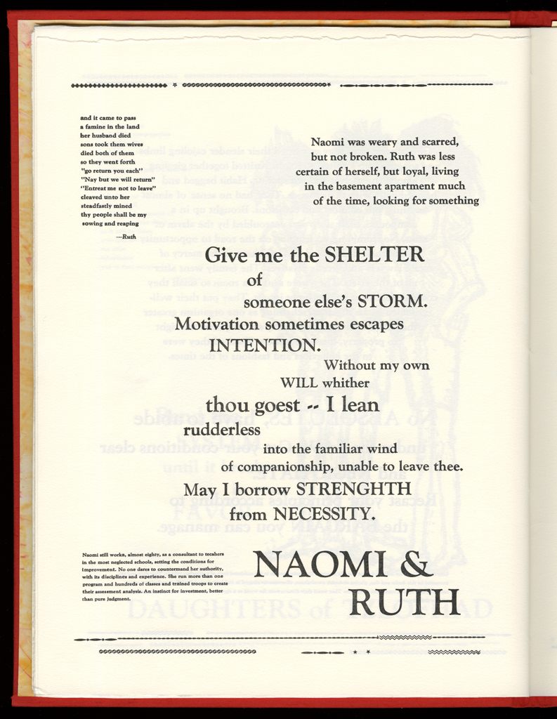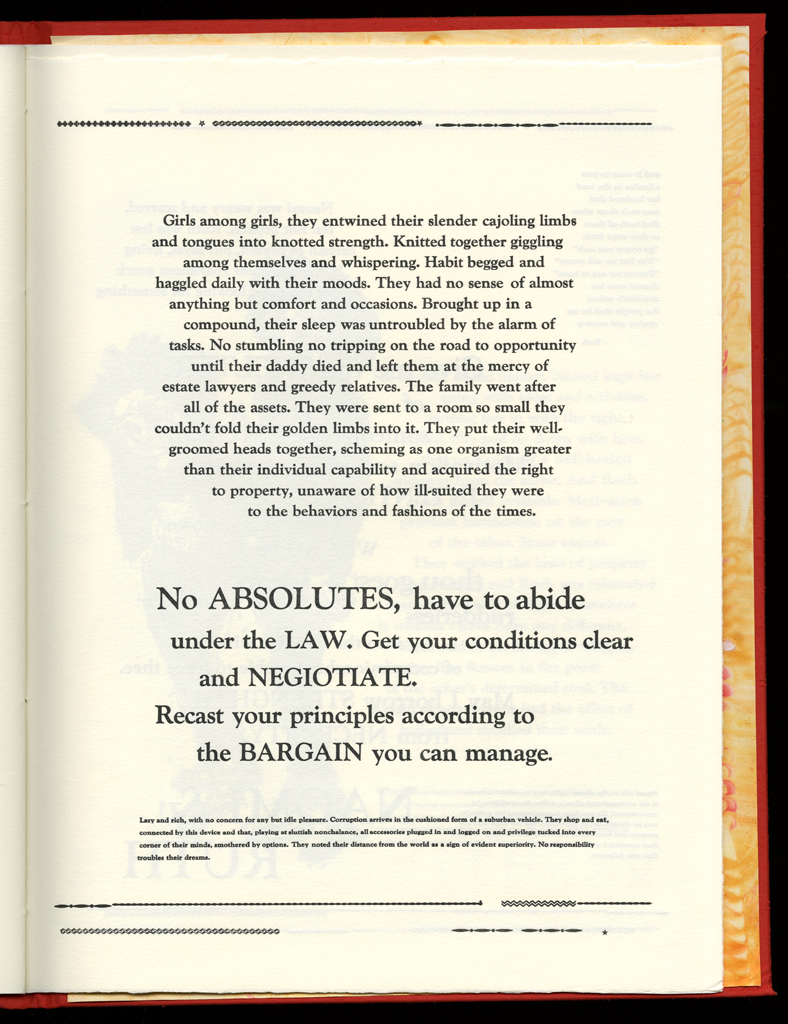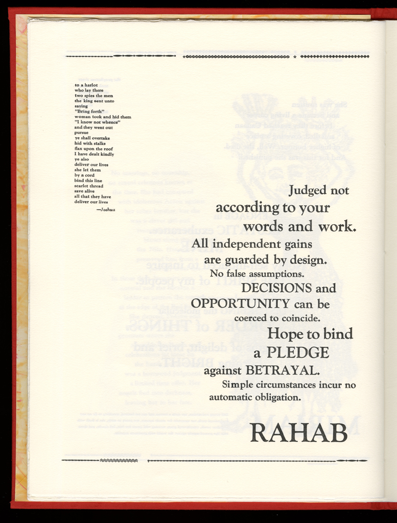 Written in response in the spring and summer of 2005. Printed in Goudy, on Rives, at the Virginia Arts of the Book Center in Charlottesvile. All linocuts, texts, printing, endsheets by the author.