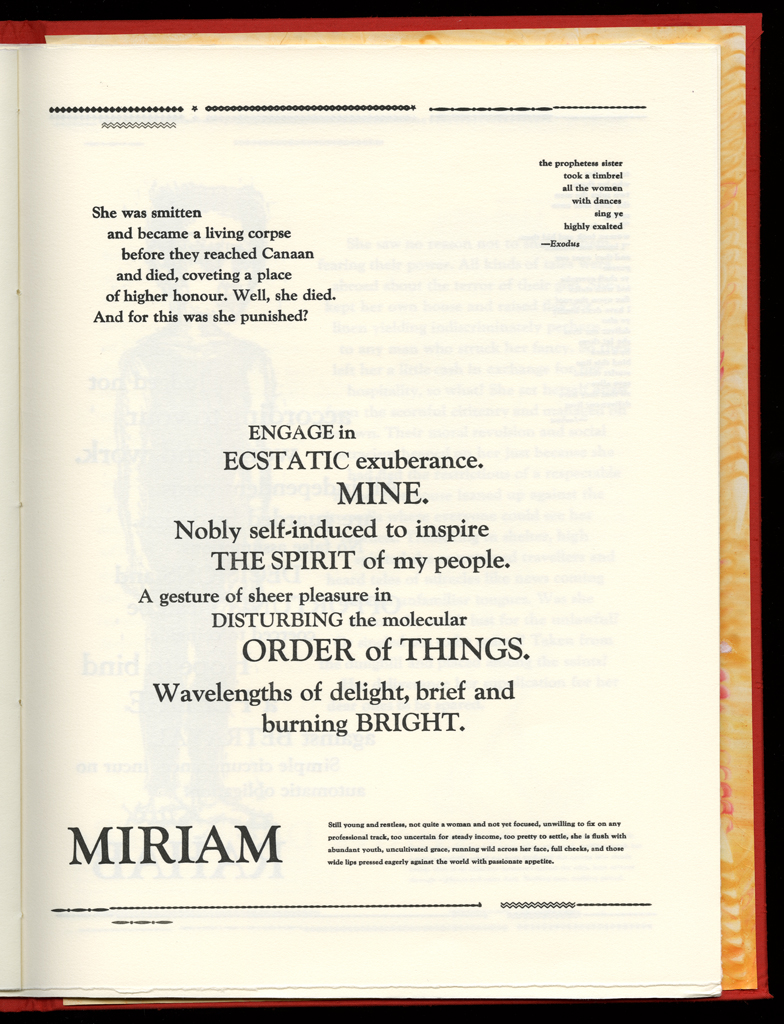 development: A series of portraits, rather than a developing narrative or structure, though Lilith closes the book and Eve opens, providing bookends. The historical progression of biblical narratives is also a determining structure.